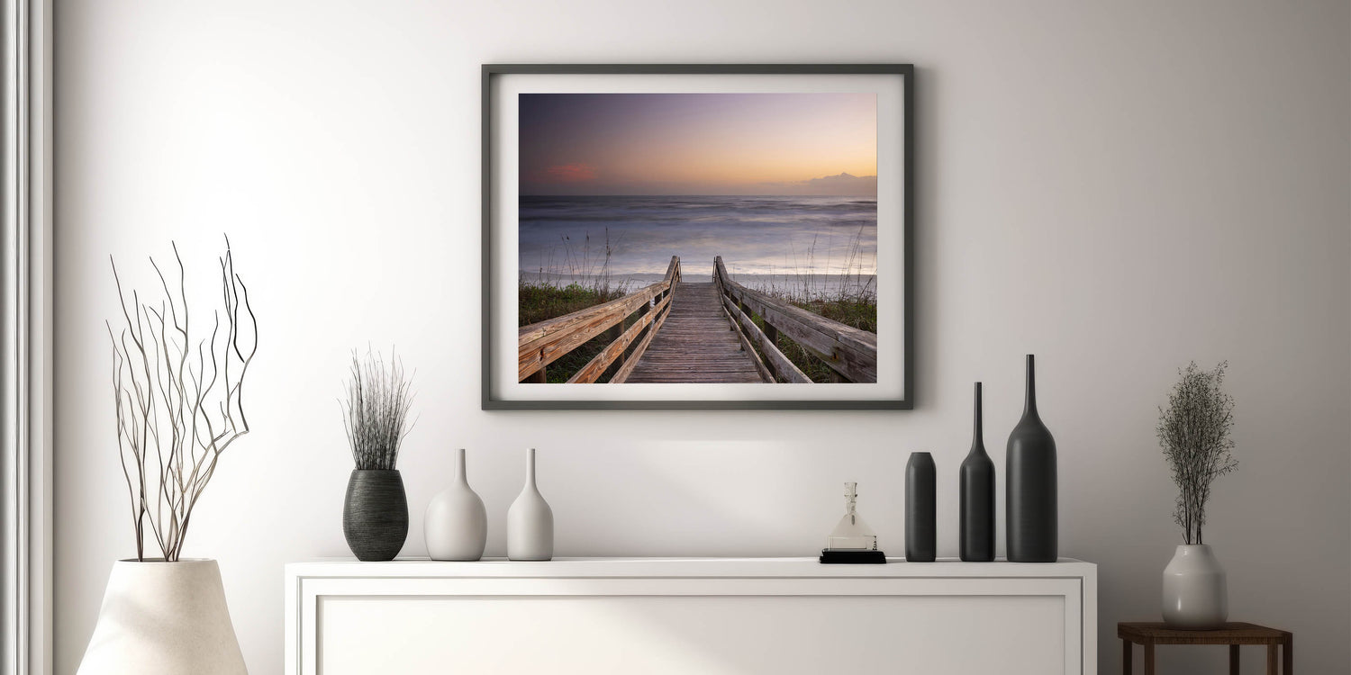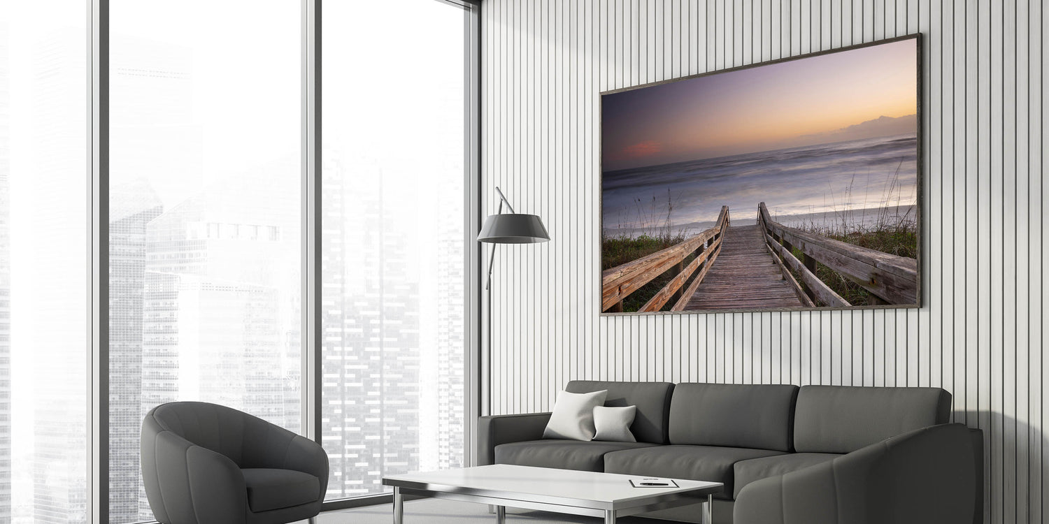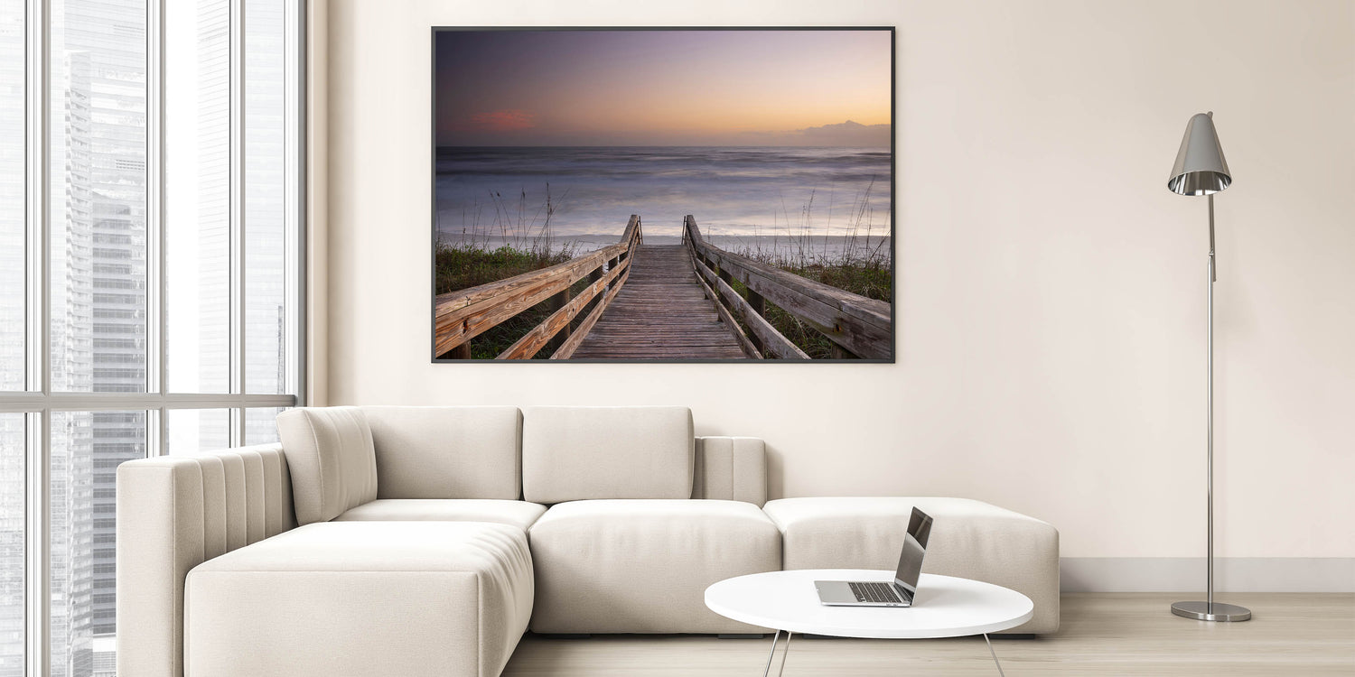 Invite the peaceful beauty of Daytona Beach into your home with this stunning wall art, showcasing a wooden boardwalk leading to the tranquil ocean. This serene scene, featuring soft hues of a fading sunset, captures the perfect moment of calm as the waves gently meet the shore. The simplicity and natural beauty of the wooden walkway framed by the ocean horizon create a timeless piece that will bring a sense of relaxation and harmony to any room. Perfect for lovers of coastal landscapes, this artwork embodies the essence of a quiet escape to the beach.