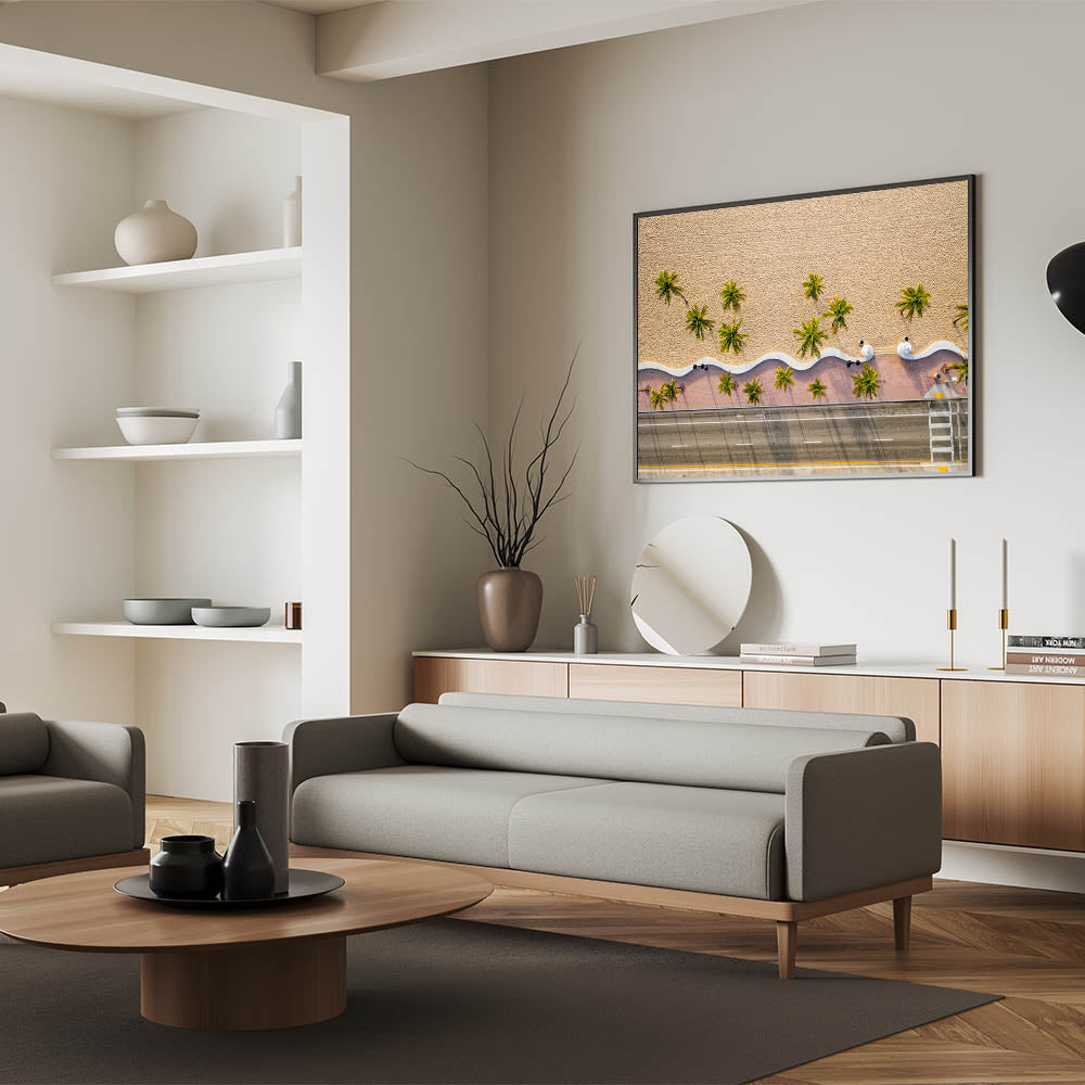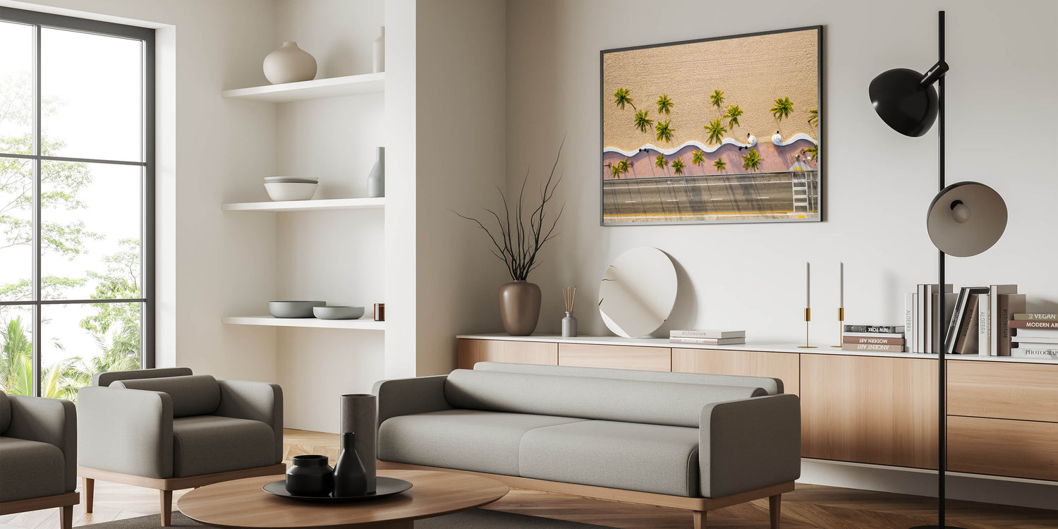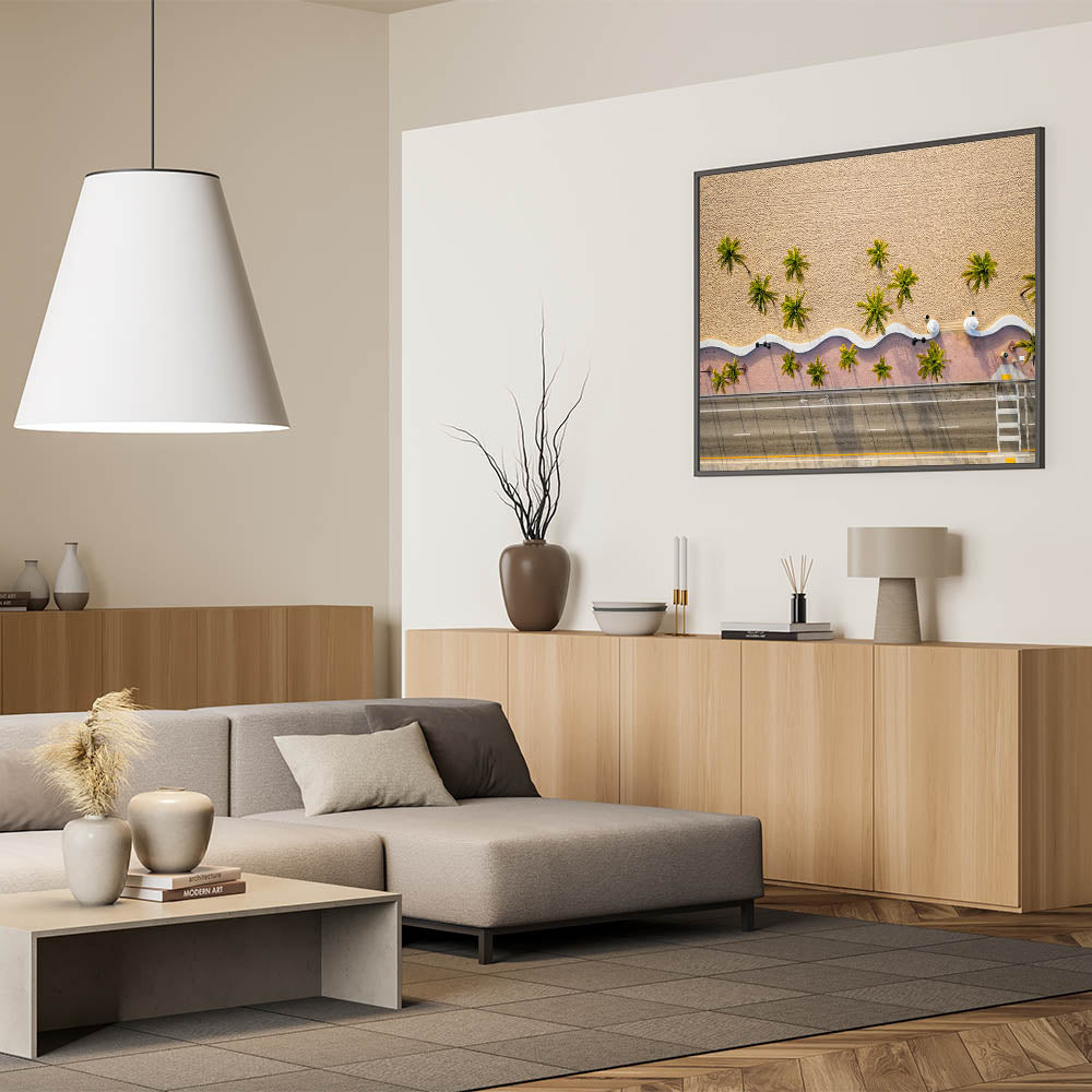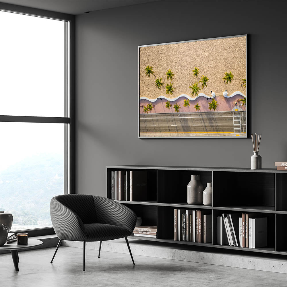 This stunning aerial view of Fort Lauderdale’s beach offers a fresh perspective on Florida’s coastal beauty. The clean lines of the boardwalk, contrasting with the natural patterns of the sand and palm trees, create a harmonious balance between urban design and nature. Perfect for modern homes or offices, this unique Fort Lauderdale Beach Wall Art brings a peaceful, yet contemporary touch to any space. Available in a variety of materials, including canvas and acrylic glass, this artwork is an excellent addition to your collection of Florida coastal art.