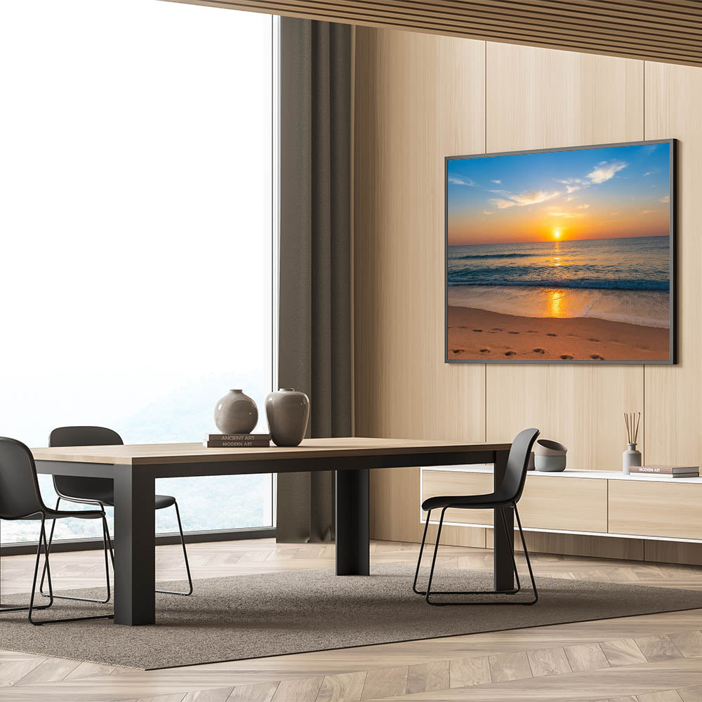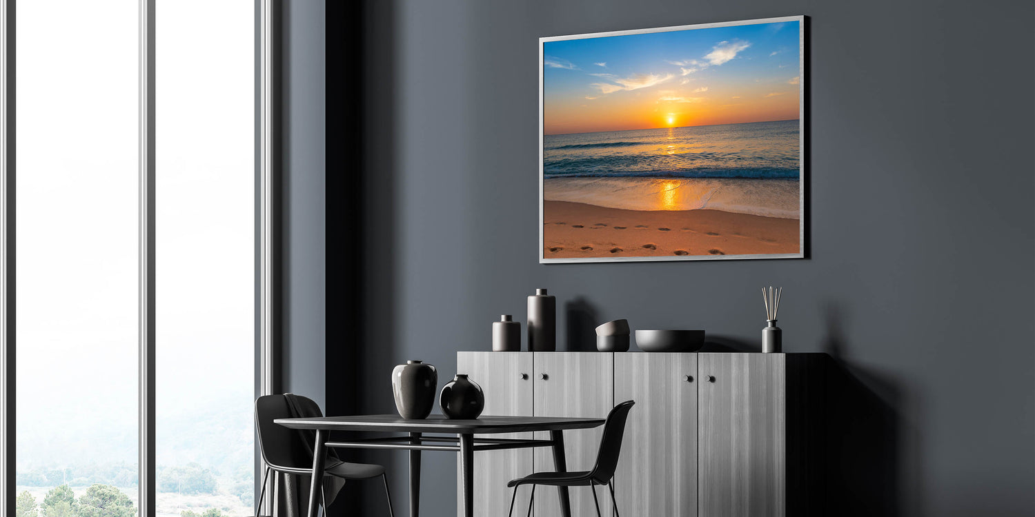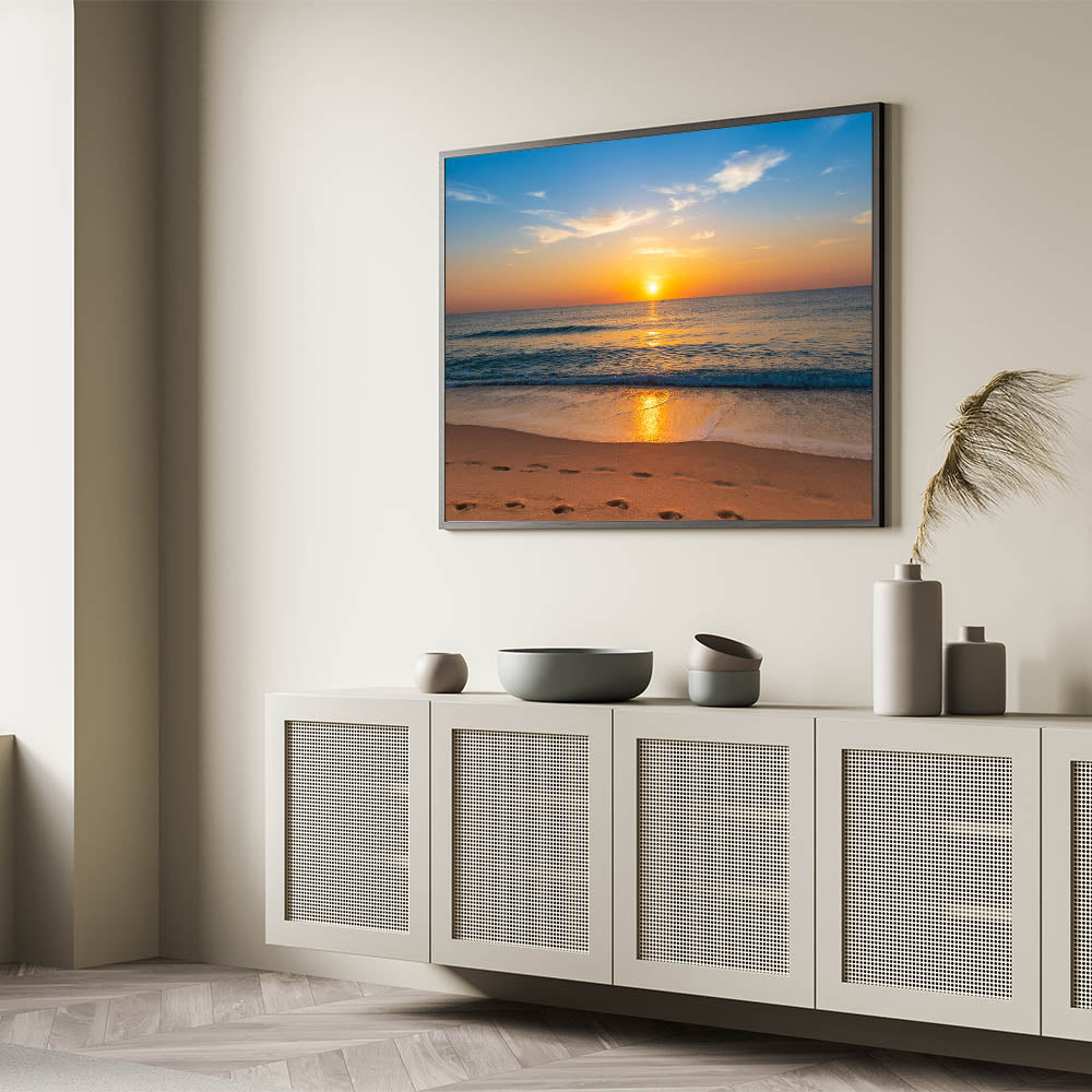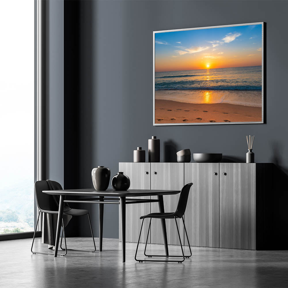 Capture the tranquility of Fort Lauderdale's beaches with this beautiful Sunset Wall Art. The golden hues of the setting sun reflecting on the calm ocean waves create a peaceful and serene atmosphere, perfect for enhancing any room. The footprints in the sand add a personal touch, inviting you to step into the scene and experience the calm of a Florida evening. Whether in your living room, bedroom, or office, this Fort Lauderdale beach wall decor brings a piece of coastal paradise to your space.