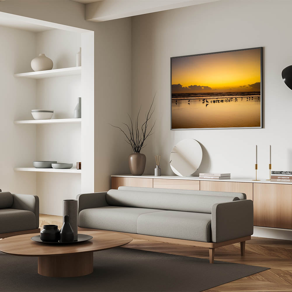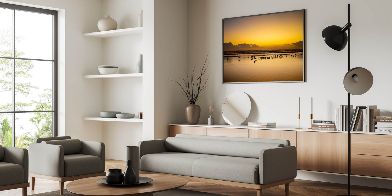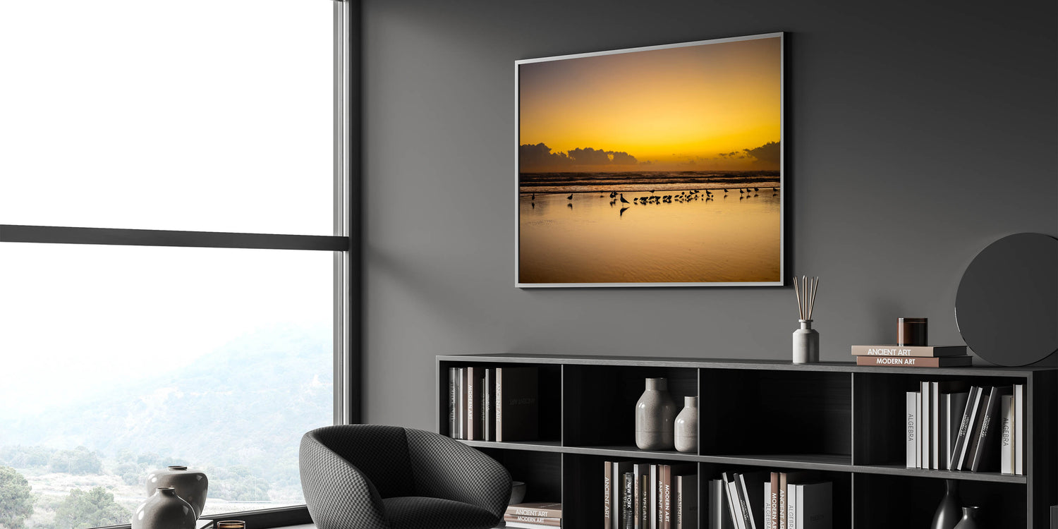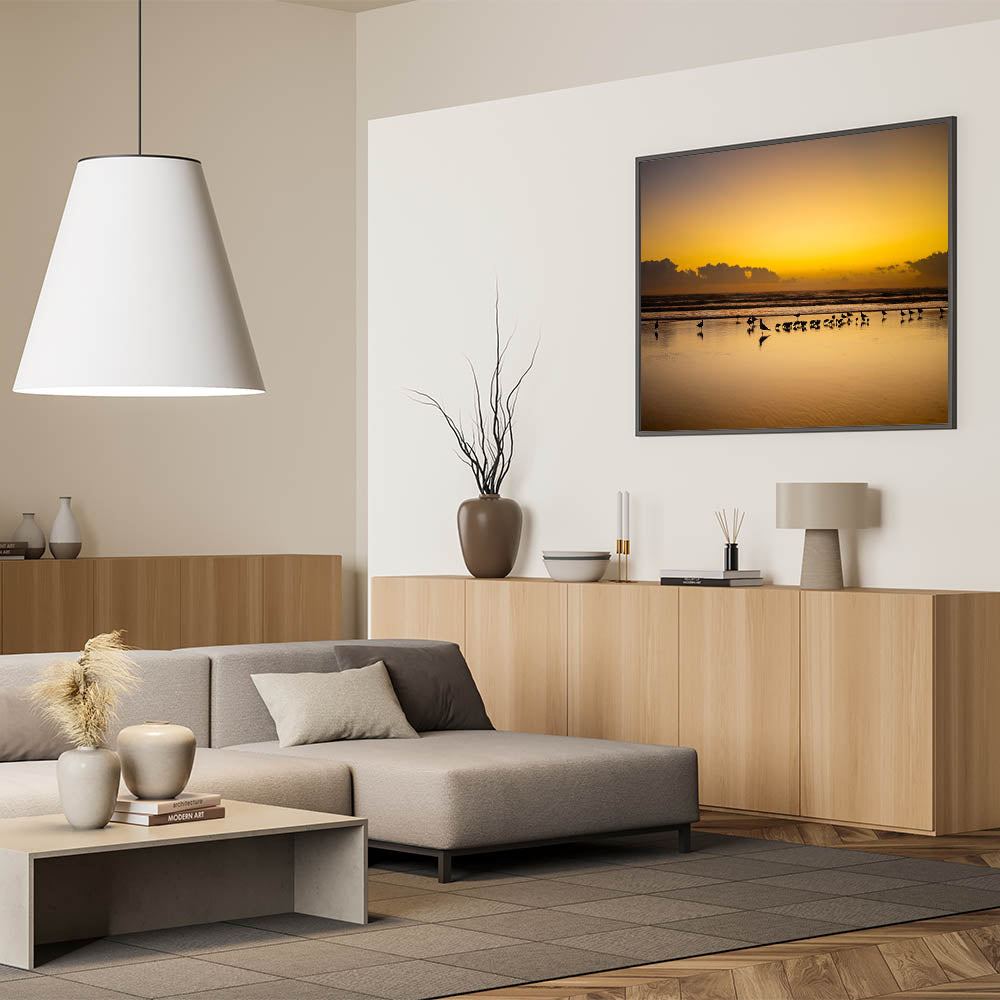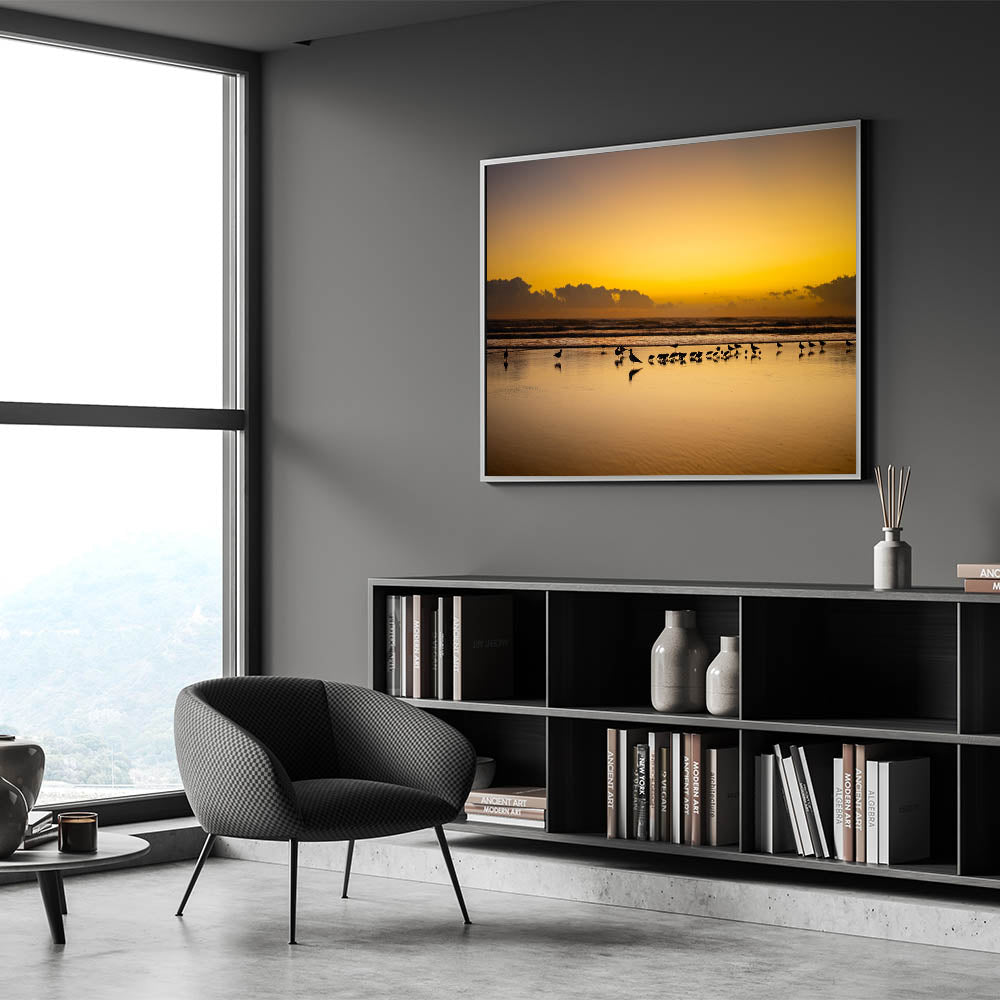 Whether you’re looking to bring the calm of nature into your home or searching for a unique sunrise scene to enhance your decor, this golden sunrise with birds is a perfect choice to evoke a sense of peace and coastal beauty.