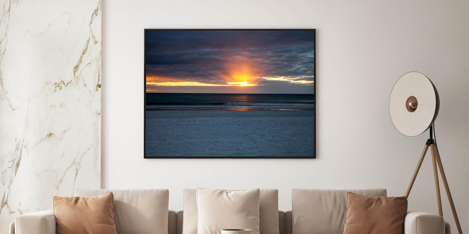 Experience the peaceful beauty of a Marco Island sunset with this captivating coastal art print. The soft glow of the sun breaking through the clouds over the calm ocean waves creates a serene atmosphere that brings the tranquility of the beach into your home. Perfect for coastal-themed décor or for those who love the beauty of tropical beaches, this stunning piece is available in various formats, from stretched canvas to framed prints.