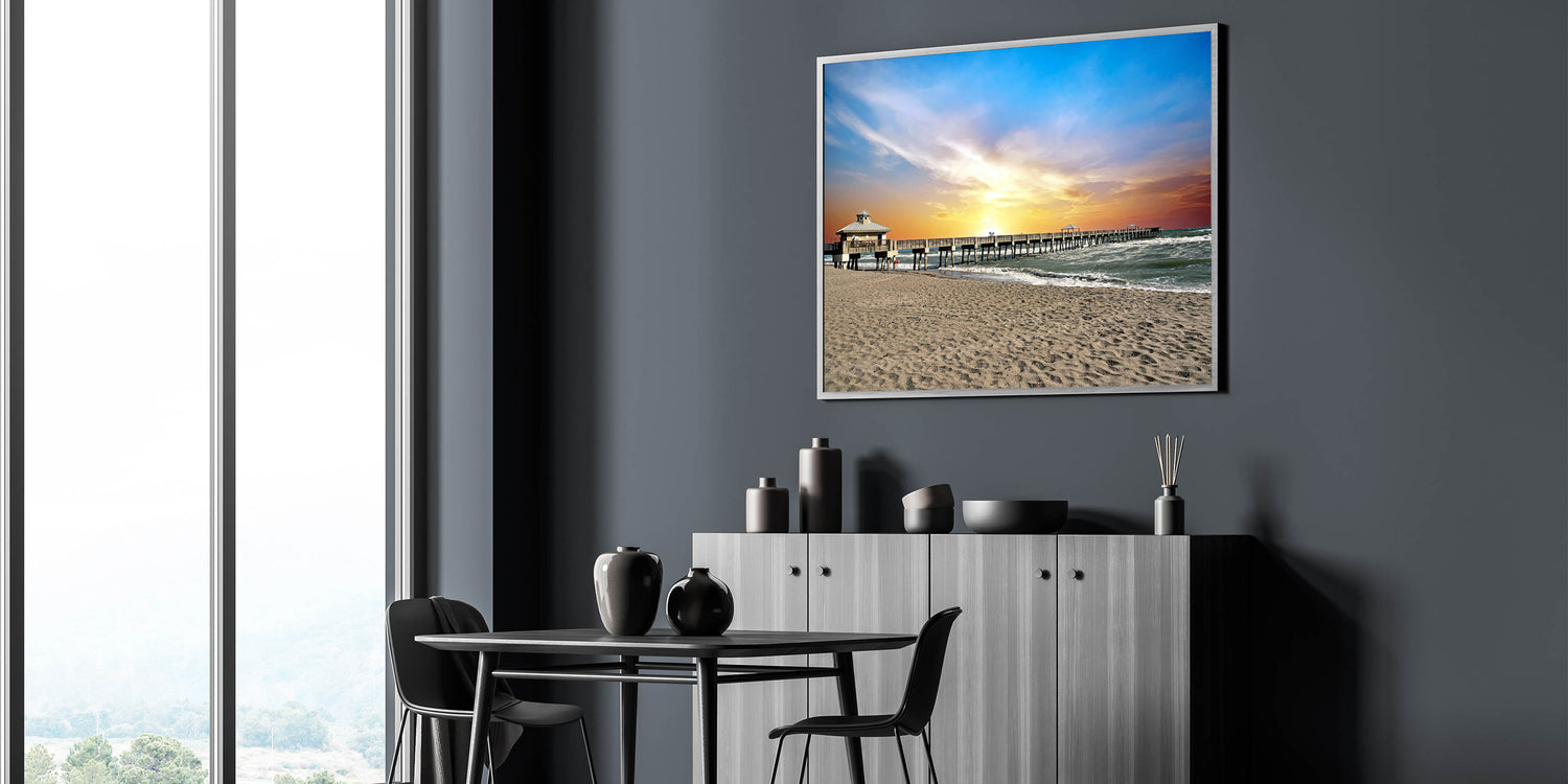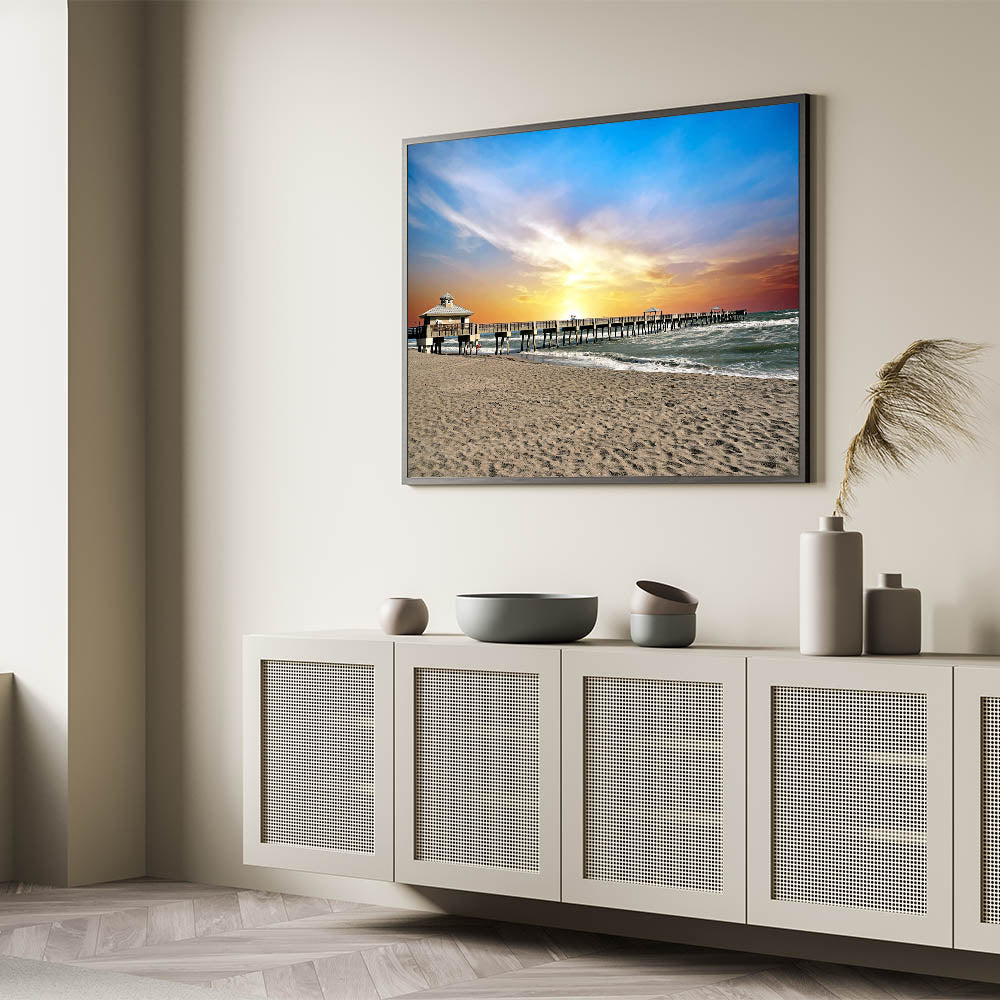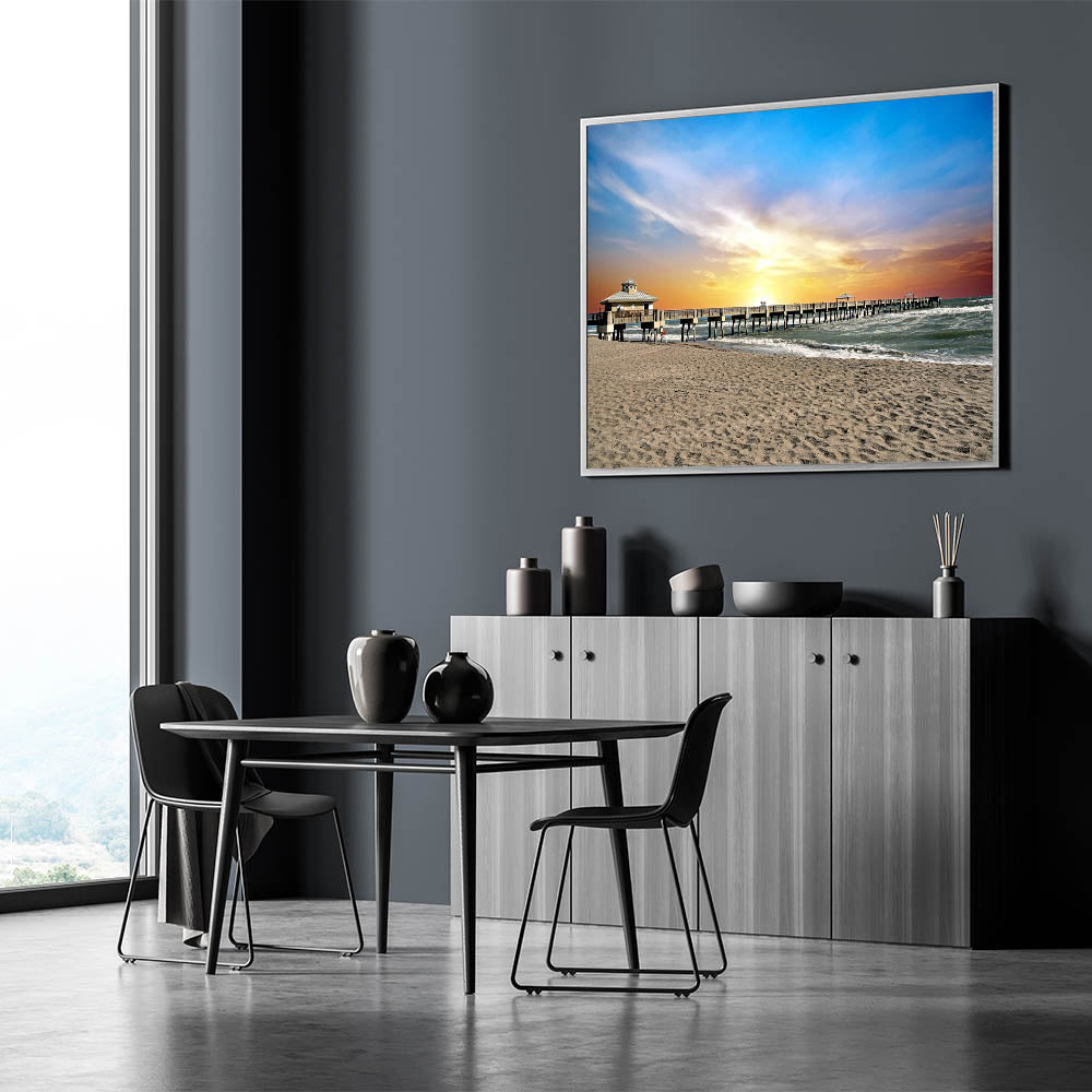 Bring the serene beauty of the Florida coast into your home with this captivating Palm Beach Pier Art. Featuring a stunning view of the Palm Beach pier at sunset, this piece of coastal wall decor perfectly captures the tranquil moment as the sun dips below the horizon, casting vibrant hues of orange, yellow, and blue across the sky and ocean. This Florida beach art is an ideal way to bring a touch of the ocean into your home.