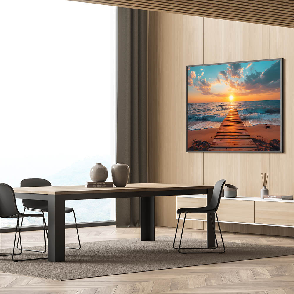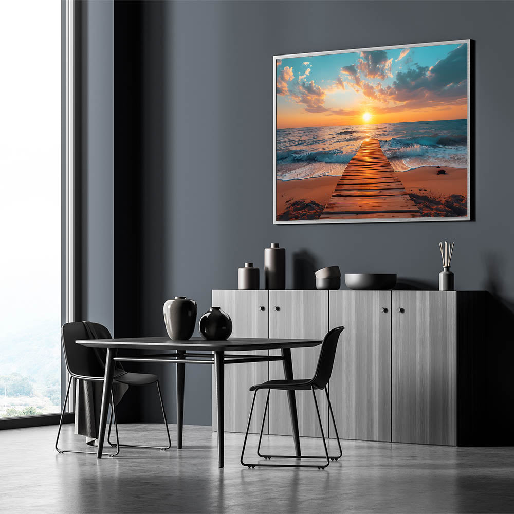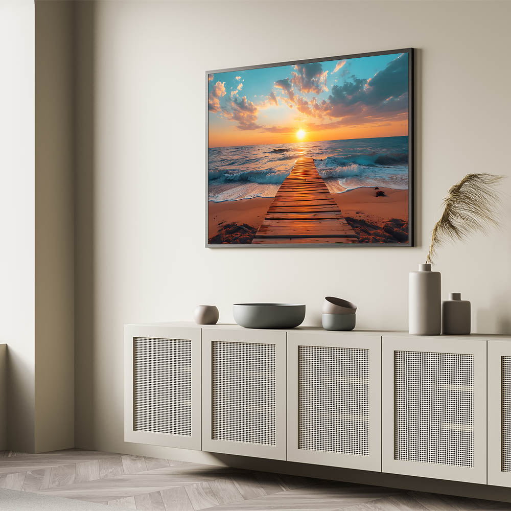Escape to the tranquility of a seaside sunset with this stunning Palm Beach wall art. Featuring a peaceful pier stretching into the ocean at sunset, this ocean view art print captures the calm beauty of the golden hour. The vibrant oranges and soft blues create a breathtaking contrast that will bring warmth and serenity to any room. Perfect for lovers of coastal wall decor, this Florida scenic photography is ideal for adding a peaceful ambiance to your home.