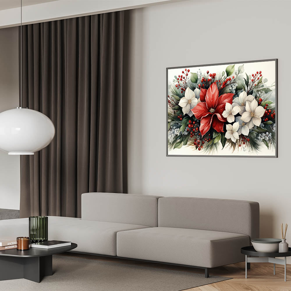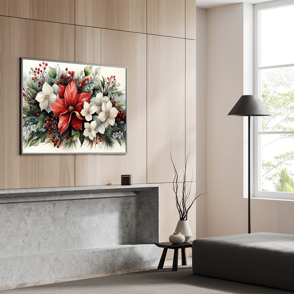 - Vibrant Holiday Floral Design: Featuring red and white poinsettias, pine sprigs, and holly berries, this art piece is a celebration of nature's beauty during the holiday season.