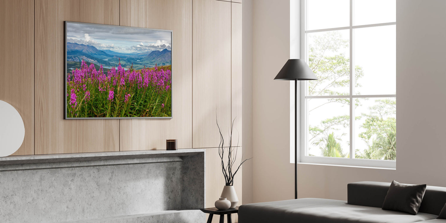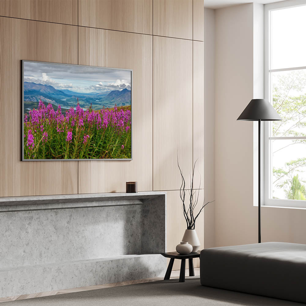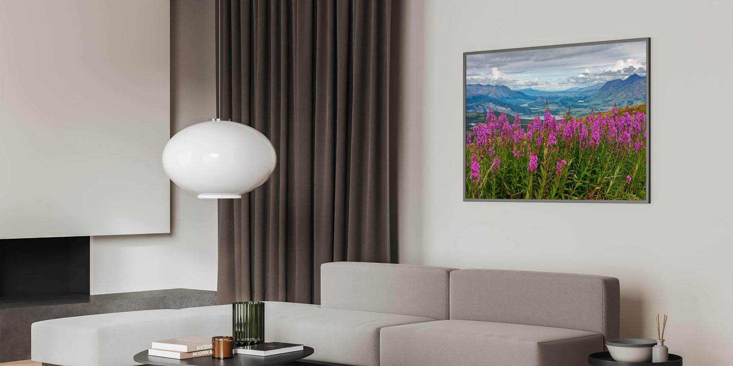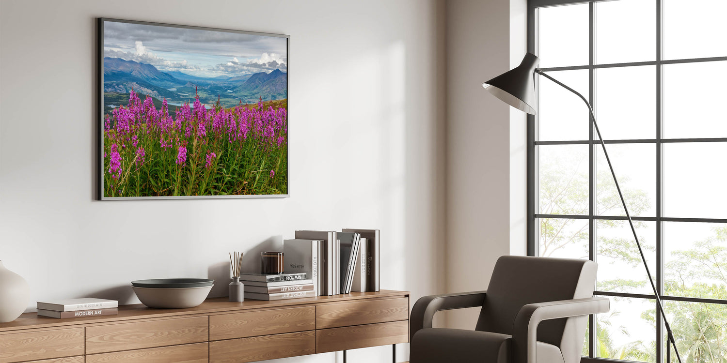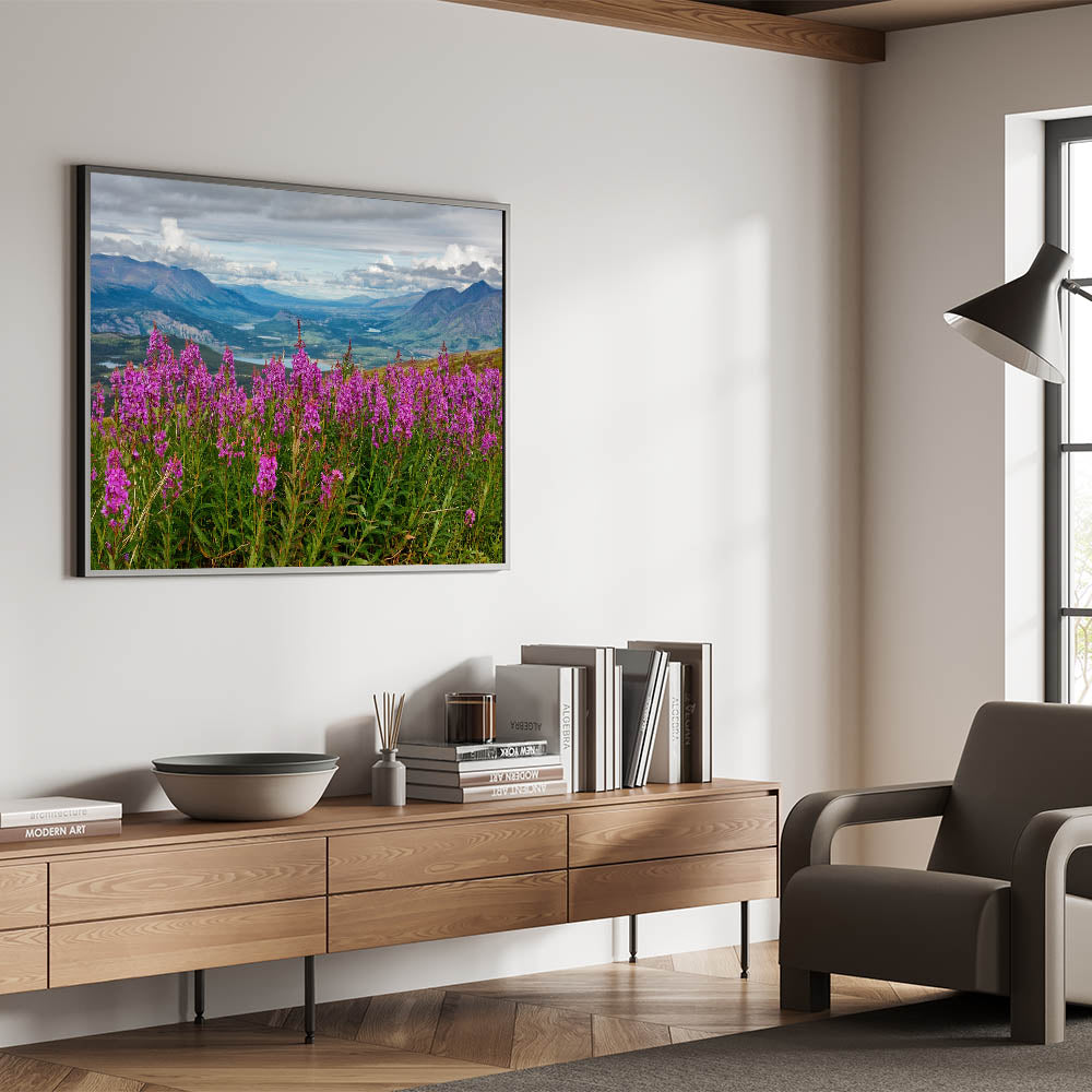 Immerse yourself in the beauty of nature with this stunning Fireweed field art. This captivating piece showcases a vibrant Fireweed field set against a backdrop of rolling mountains and lush valleys. The delicate pink flowers pop against the scenic landscape, evoking a sense of tranquility and awe. This nature-inspired artwork brings a touch of the outdoors into your home, making it perfect for living rooms, bedrooms, or offices.