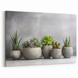 Enhance your home with this sleek and modern succulent wall art. Featuring an elegant arrangement of various succulents in neutral gray pots, this artwork brings a minimalist and contemporary touch to your space. The soft green hues of the plants contrast beautifully with the matte gray tones of the pots, creating a calming yet stylish atmosphere that is perfect for modern interiors.