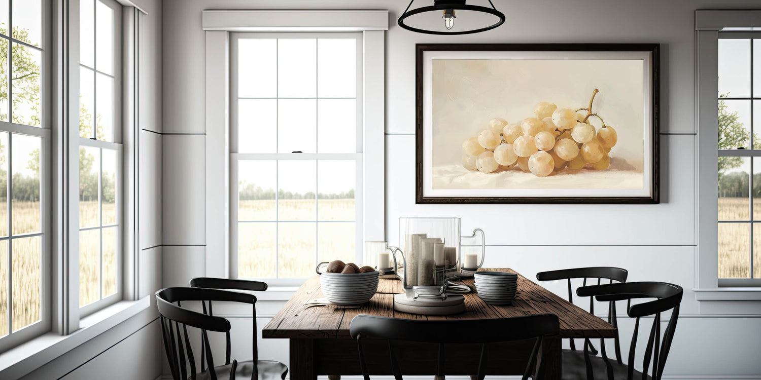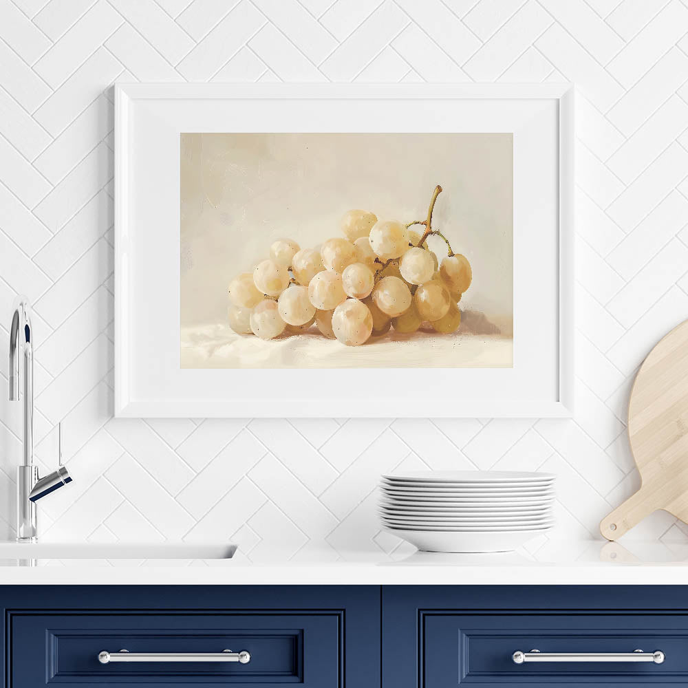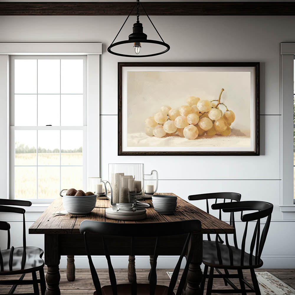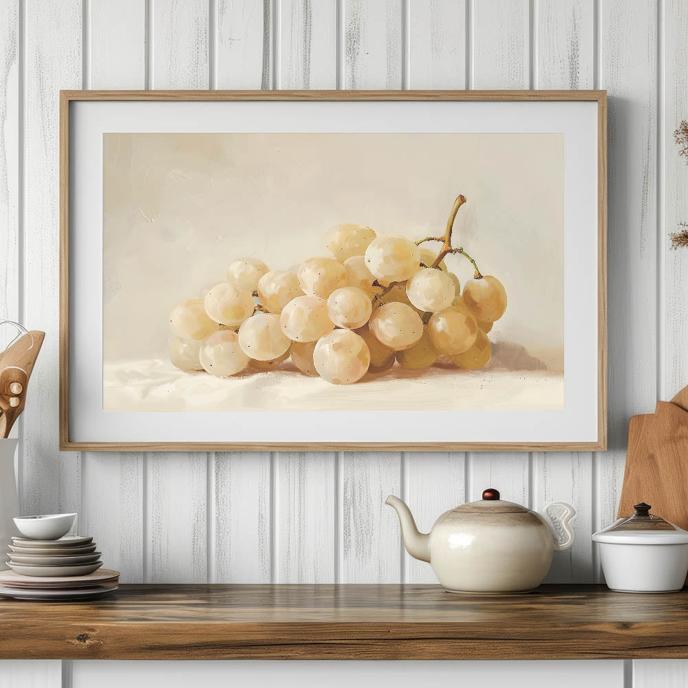 Enhance your space with this stunning fruit canvas art, featuring a soft and elegant still-life painting of white grapes. The delicate beige and gold tones, combined with subtle shading, create a refined and minimalist aesthetic. Perfect for kitchen fruit decor, this artwork brings warmth and sophistication to modern and classic interiors alike. Whether displayed in a dining area, cafe, or gourmet kitchen, this fruit photography art adds a timeless touch of nature’s beauty.