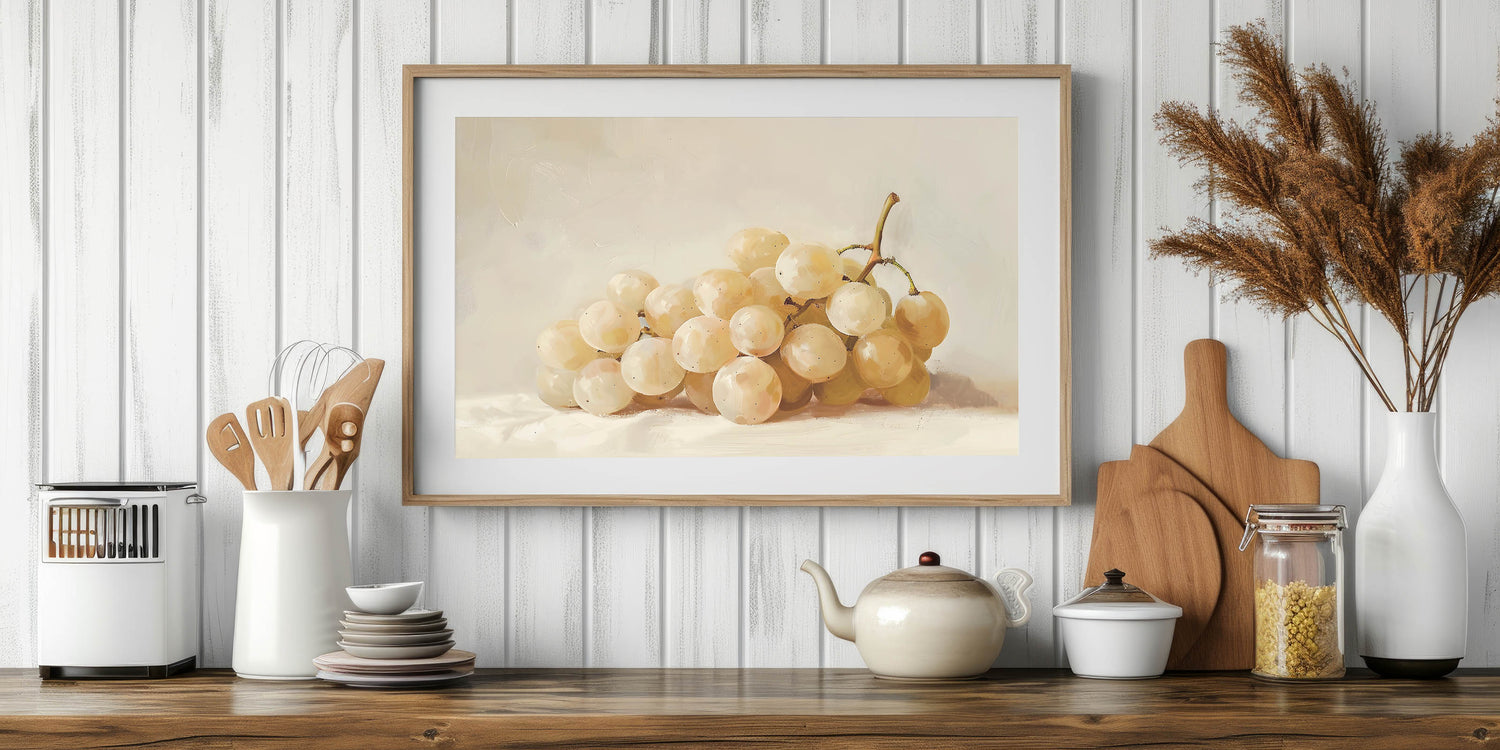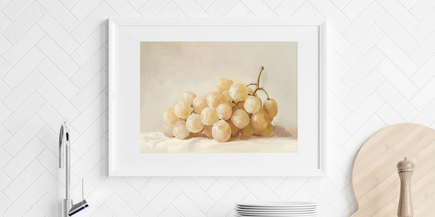 Elegant White Grape Wall Art – Beige & Gold Kitchen Decor