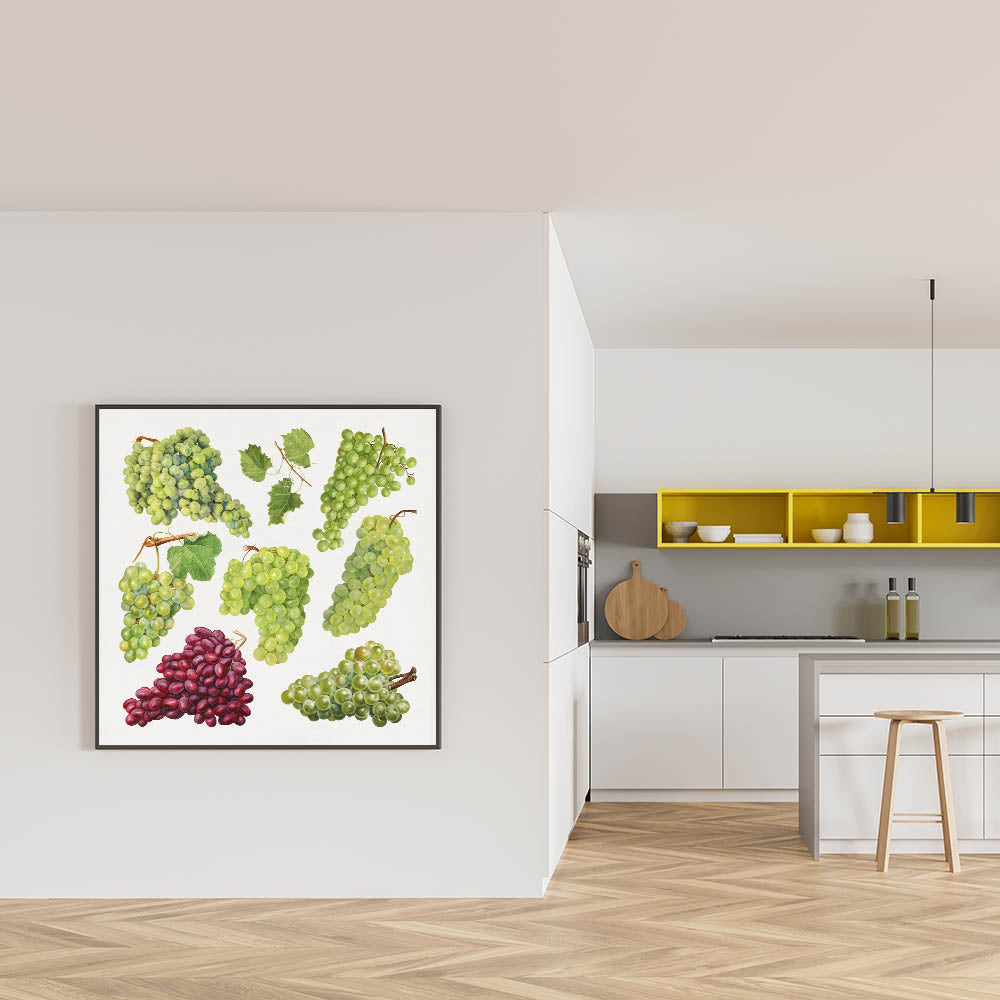 Elevate your space with this fruit botanical print, featuring a beautifully detailed collection of green and red grape clusters. This elegant fruit-themed wall art captures the rich textures and colors of fresh grapes, making it an excellent addition to kitchen fruit decor or a refined dining area. The fruit watercolor art style enhances its natural charm, adding a classic yet modern feel to your walls.