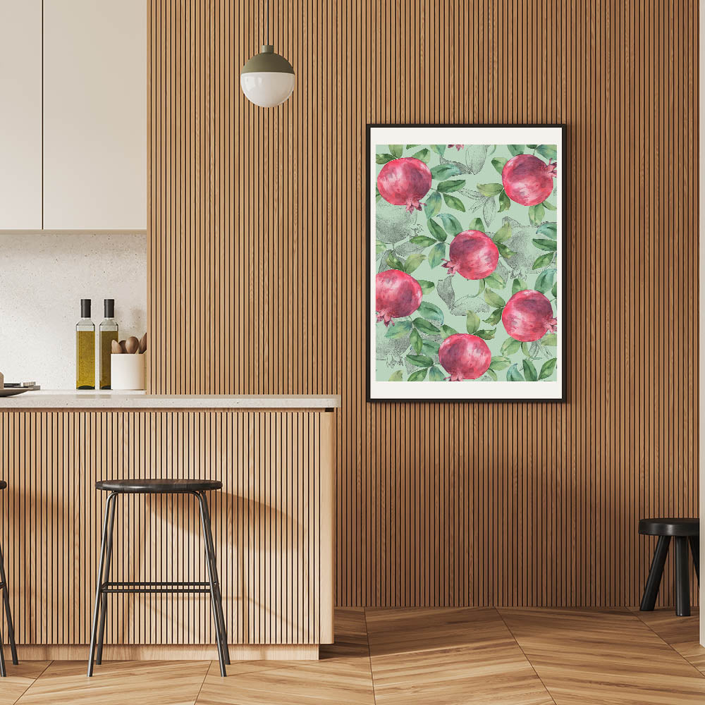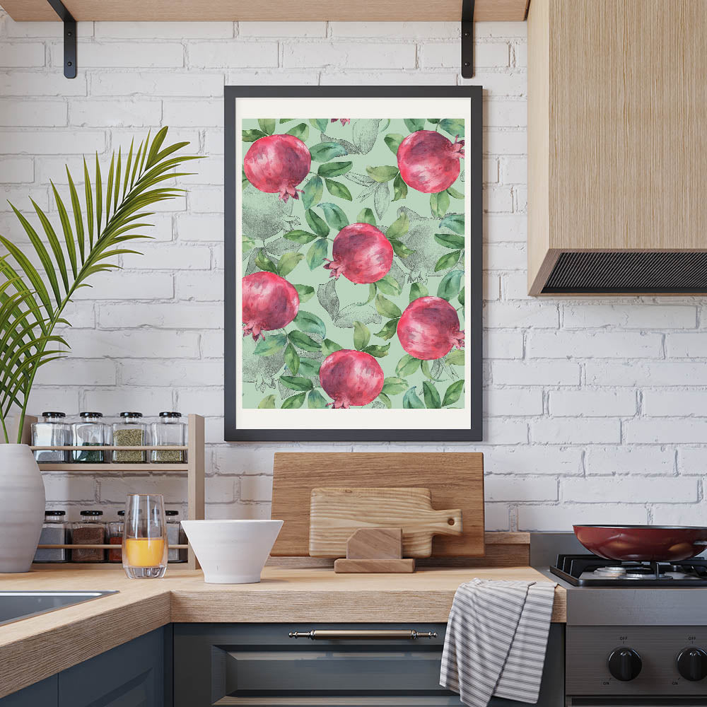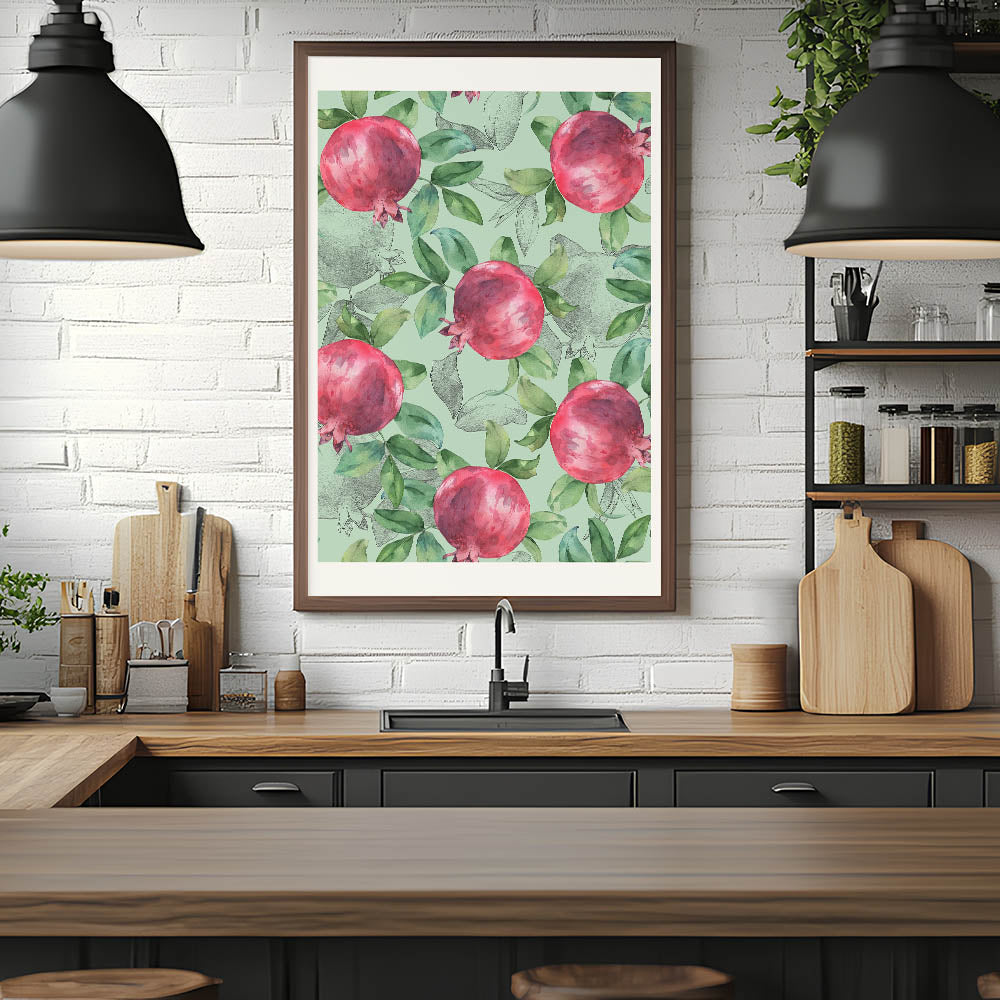 Brighten your kitchen or dining space with this fruit-themed wall art, featuring a beautifully hand-painted watercolor of ripe pomegranates against a soft green background. The mix of vibrant reds, deep greens, and delicate botanical sketches makes this fruit illustration print a stunning blend of modern and vintage aesthetics. This fruit watercolor art is perfect for those who love nature-inspired decor with an artistic touch.