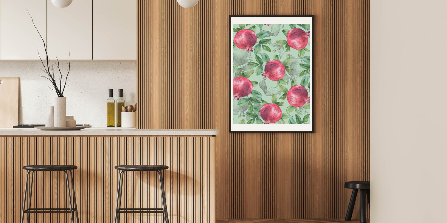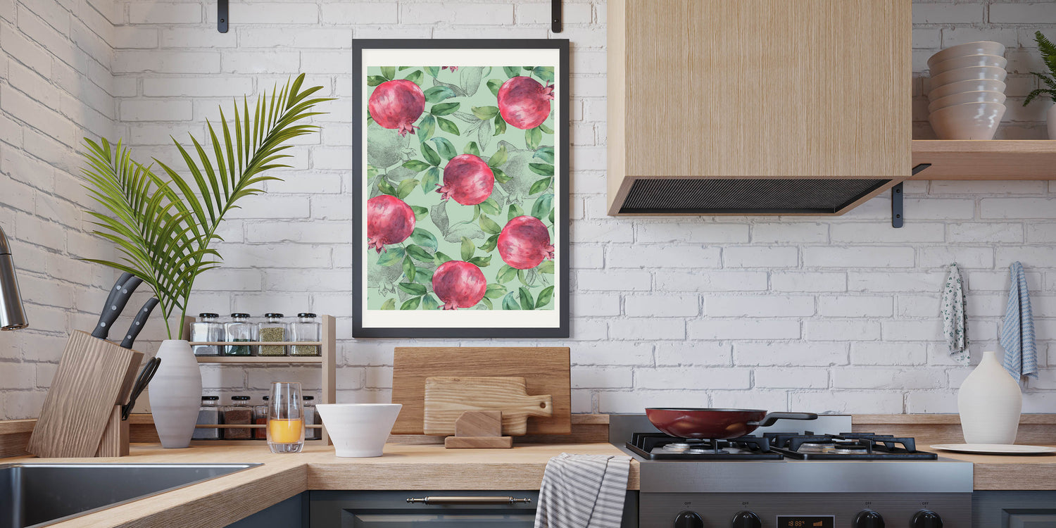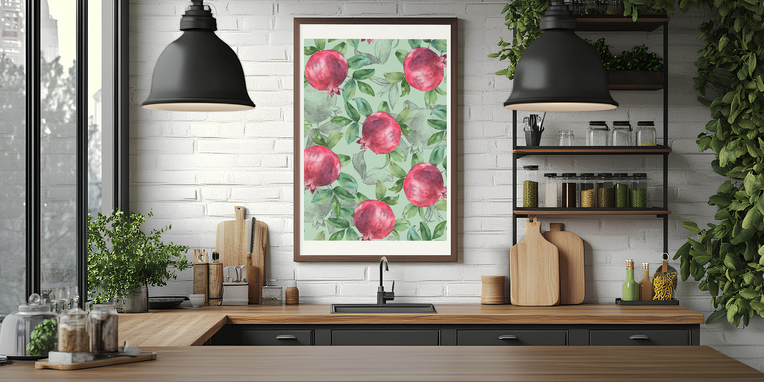 Brighten your kitchen or dining space with this fruit-themed wall art, featuring a beautifully hand-painted watercolor of ripe pomegranates against a soft green background. The mix of vibrant reds, deep greens, and delicate botanical sketches makes this fruit illustration print a stunning blend of modern and vintage aesthetics. This fruit watercolor art is perfect for those who love nature-inspired decor with an artistic touch.