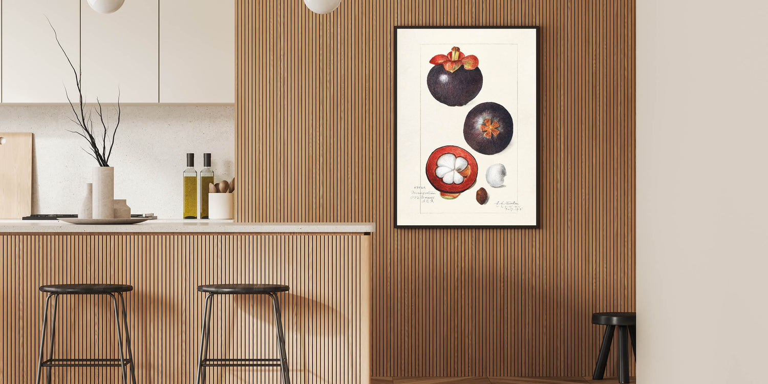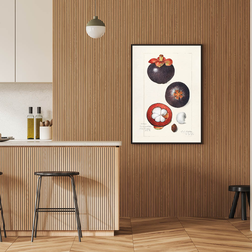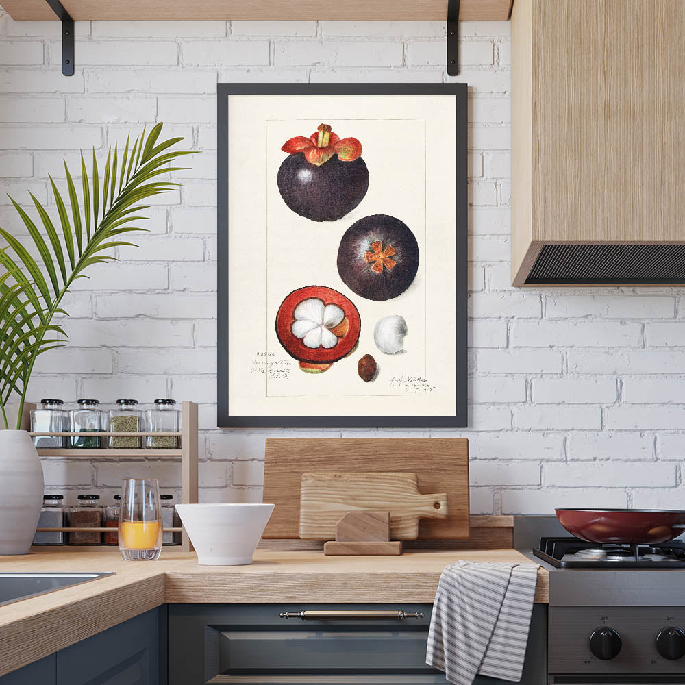 This fruit-themed wall art brings a touch of vintage elegance to any space with its botanical illustration of the exotic mangosteen. Capturing the fruit in both whole and sliced forms, the detailed artwork highlights its deep burgundy and plum hues, set against a soft beige background. A perfect choice for those who love fruit botanical prints, this artwork complements both modern and classic interiors.