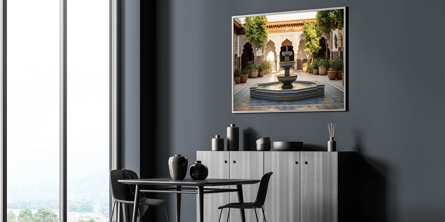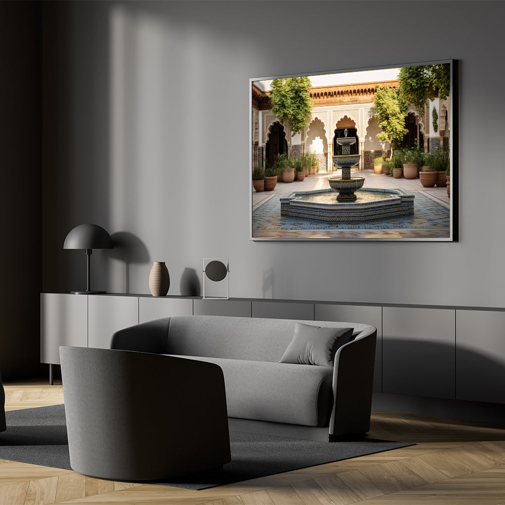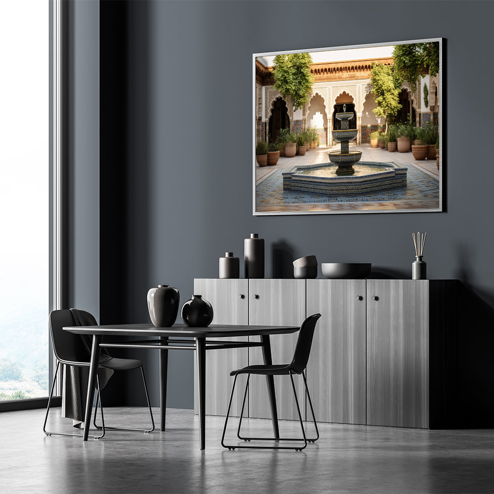 This piece is perfect for anyone looking to incorporate elements of Moorish architecture and design into their home. The combination of traditional patterns, warm colors, and serene water features makes this artwork a versatile addition to any decor style.