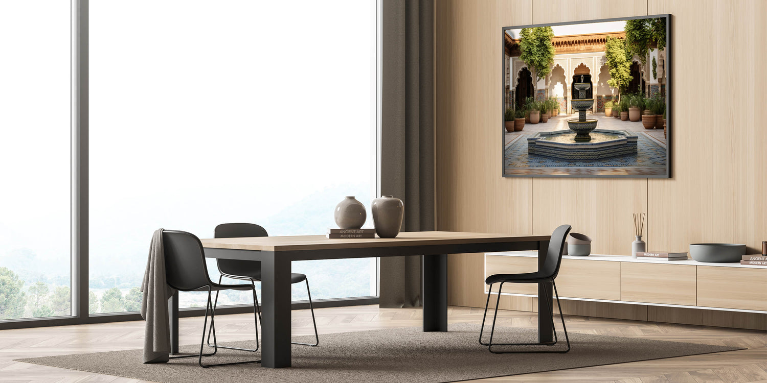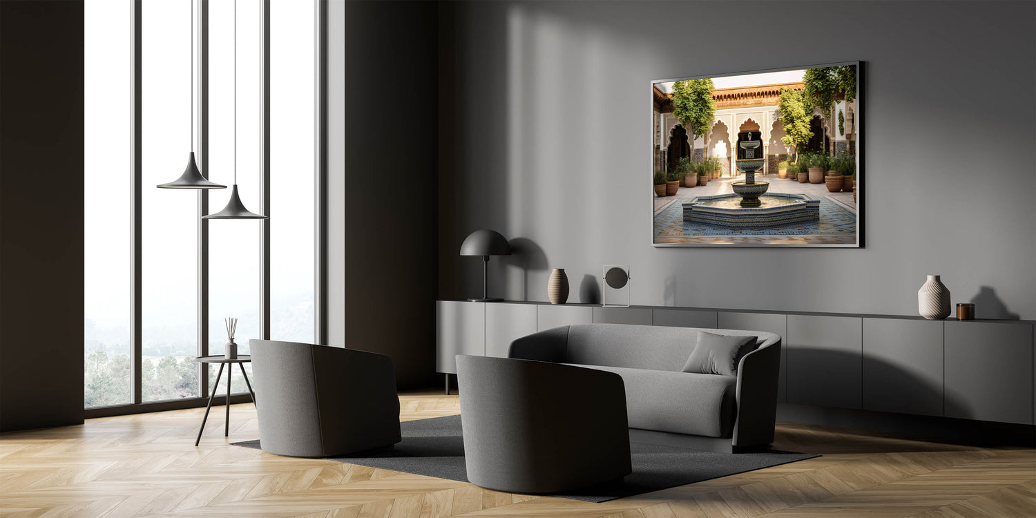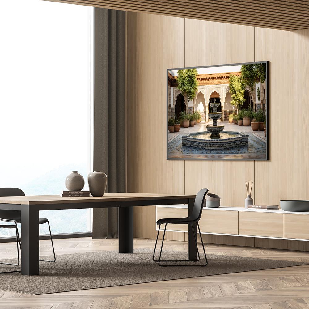 This piece is perfect for anyone looking to incorporate elements of Moorish architecture and design into their home. The combination of traditional patterns, warm colors, and serene water features makes this artwork a versatile addition to any decor style.