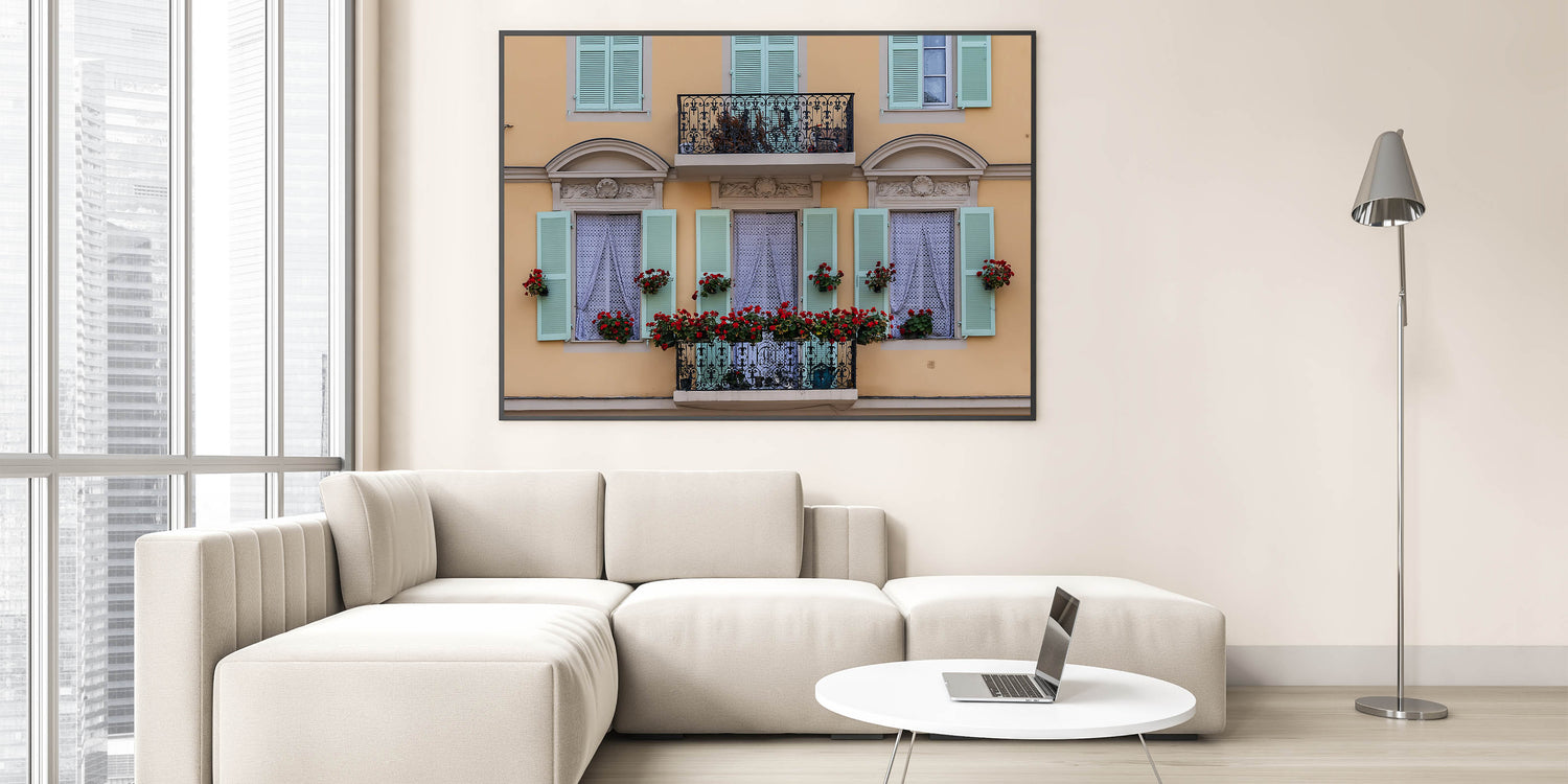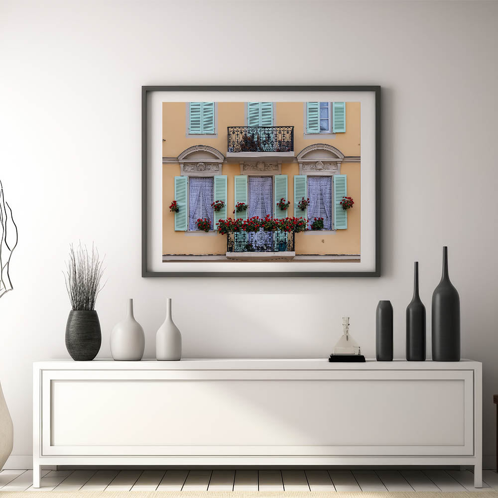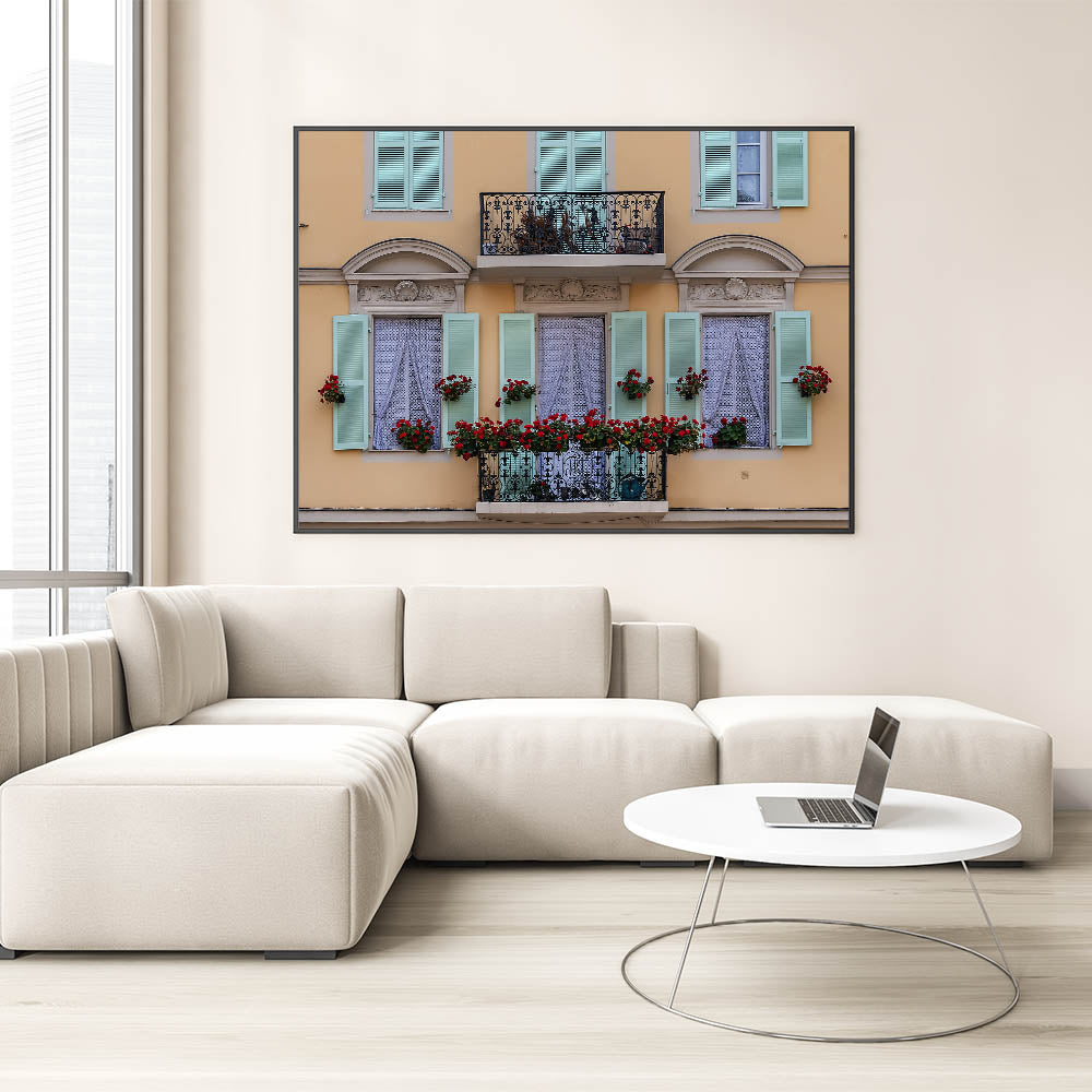 Add a touch of elegance and charm to your space with this beautiful Nice France Wall Decor. This artwork captures a picturesque balcony adorned with vibrant red flowers and pastel green shutters, creating a quintessentially French scene. The intricate ironwork on the balcony and the soft yellow facade bring a timeless elegance to this Scenic Nice Canvas, making it a perfect piece for those who appreciate the delicate beauty of European architecture and design.