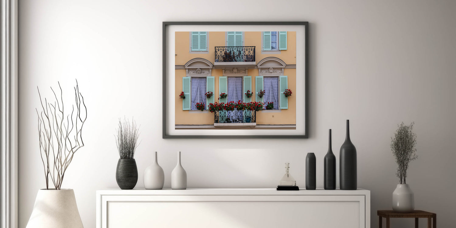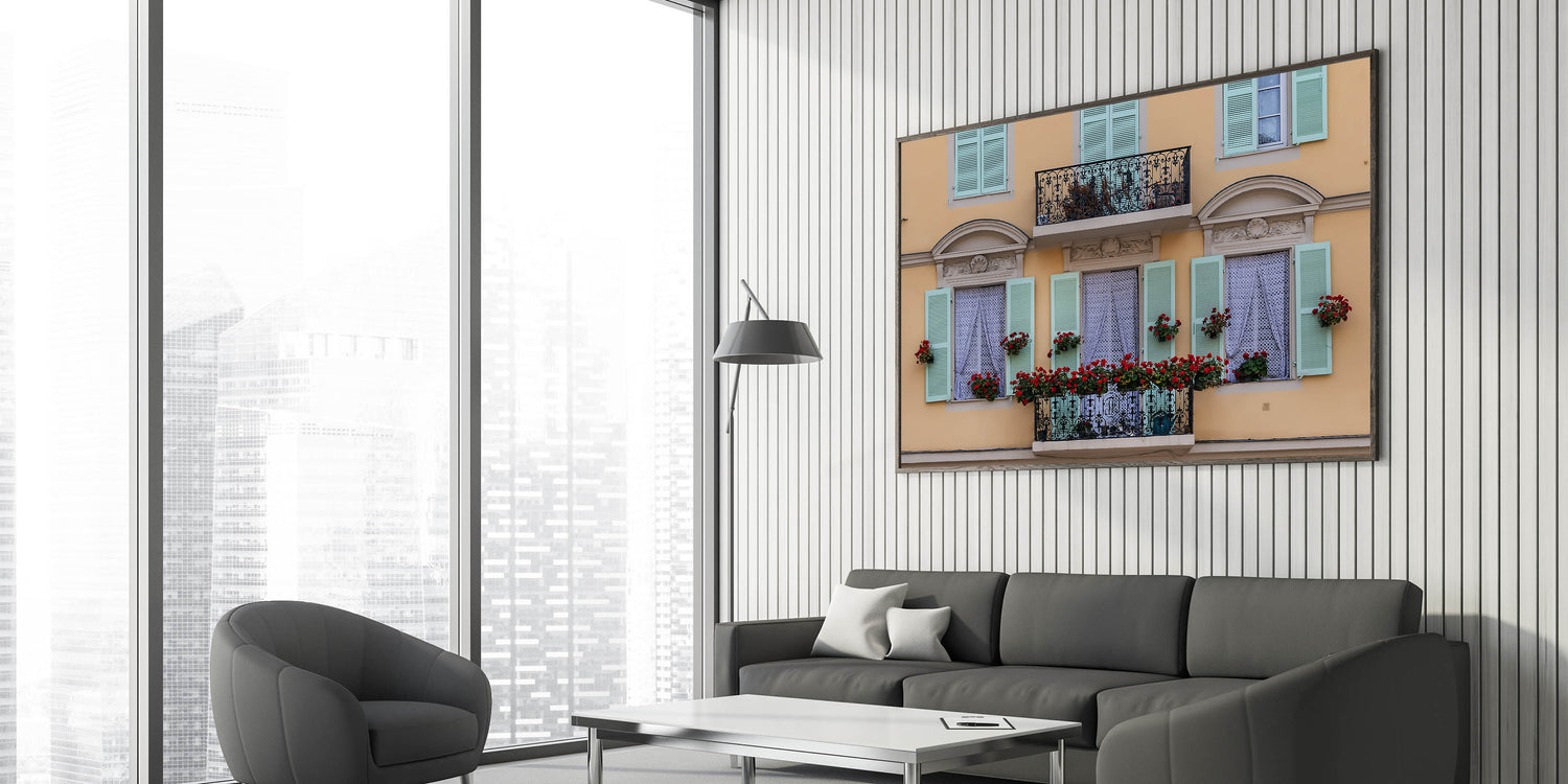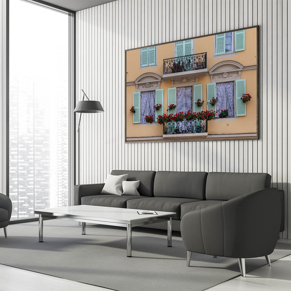 Add a touch of elegance and charm to your space with this beautiful Nice France Wall Decor. This artwork captures a picturesque balcony adorned with vibrant red flowers and pastel green shutters, creating a quintessentially French scene. The intricate ironwork on the balcony and the soft yellow facade bring a timeless elegance to this Scenic Nice Canvas, making it a perfect piece for those who appreciate the delicate beauty of European architecture and design.