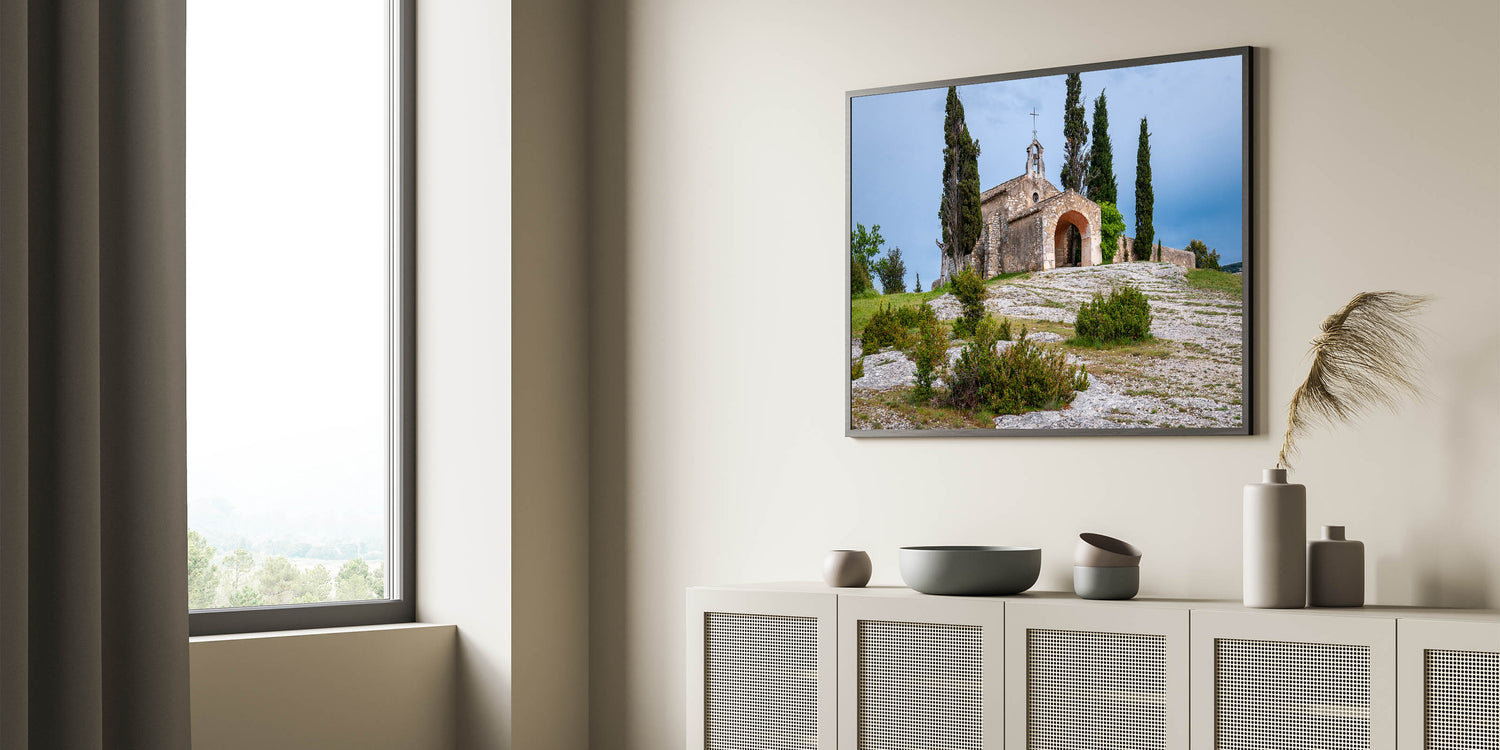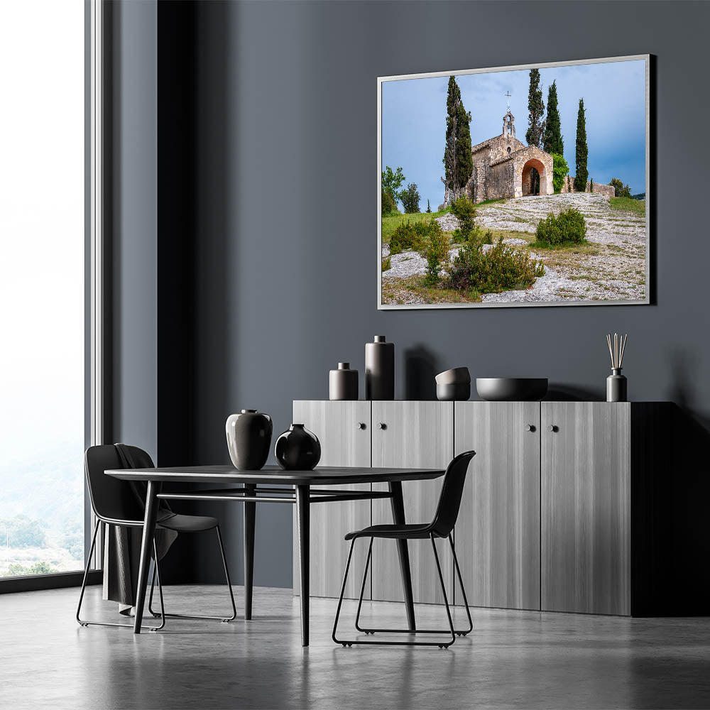 Bring the charm of Provence into your home with this beautiful South of France Wall Art. Featuring a rustic stone church set against a serene countryside, this artwork transports you to the heart of the French countryside. The detailed depiction of cypress trees and traditional architecture evokes a sense of timeless tranquility, making it an ideal piece for those who appreciate both art and history.