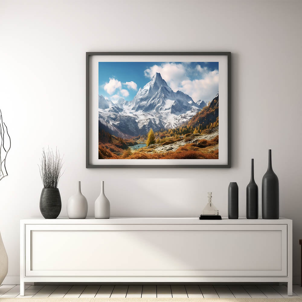Transform your space with the majestic beauty of the French Alps through this stunning wall art. The towering snow-capped peak rises against the brilliant blue sky, while the autumn-hued valley below creates a rich contrast of colors. The golden foliage and crisp mountain air are perfectly captured, making this piece a breathtaking addition to any nature lover’s home. The intricate details of the alpine landscape offer a sense of tranquility and adventure, bringing the beauty of the outdoors into your living space.