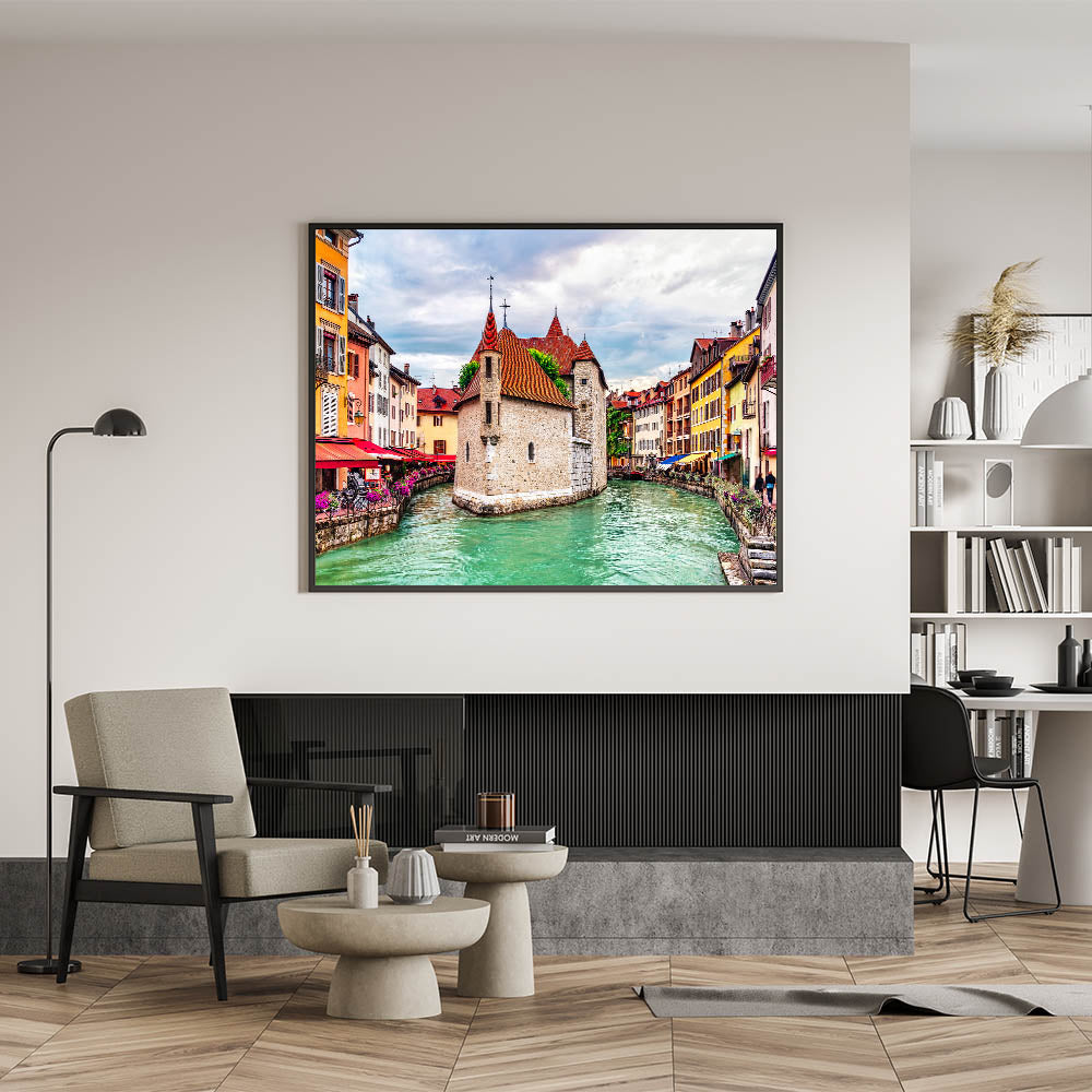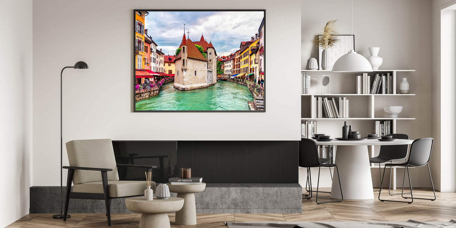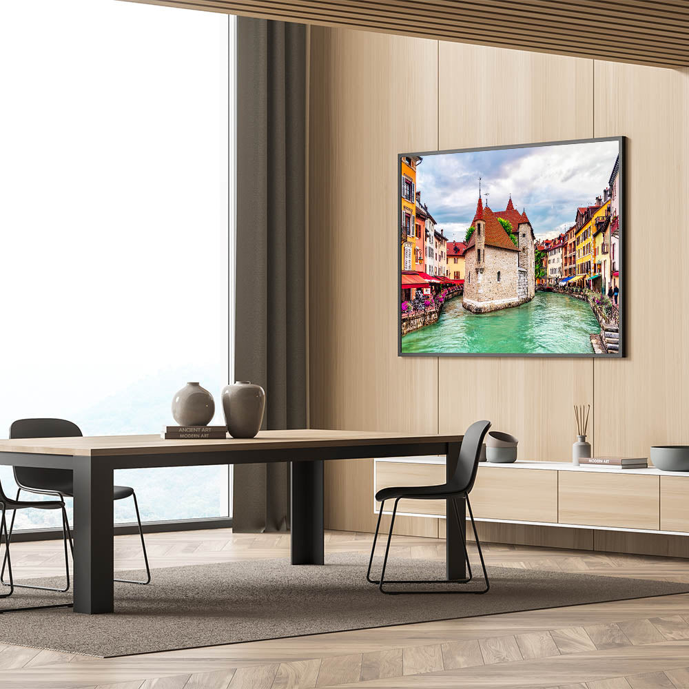 Step into the heart of a picturesque French town with this stunning French Alps wall art, featuring charming canals and vibrant historic architecture. The vivid red rooftops, colorful facades, and serene canal waters bring the essence of French alpine towns into focus. The intricate stonework and inviting cafes along the canal capture the spirit of European charm, offering an art piece that is both lively and full of cultural depth.