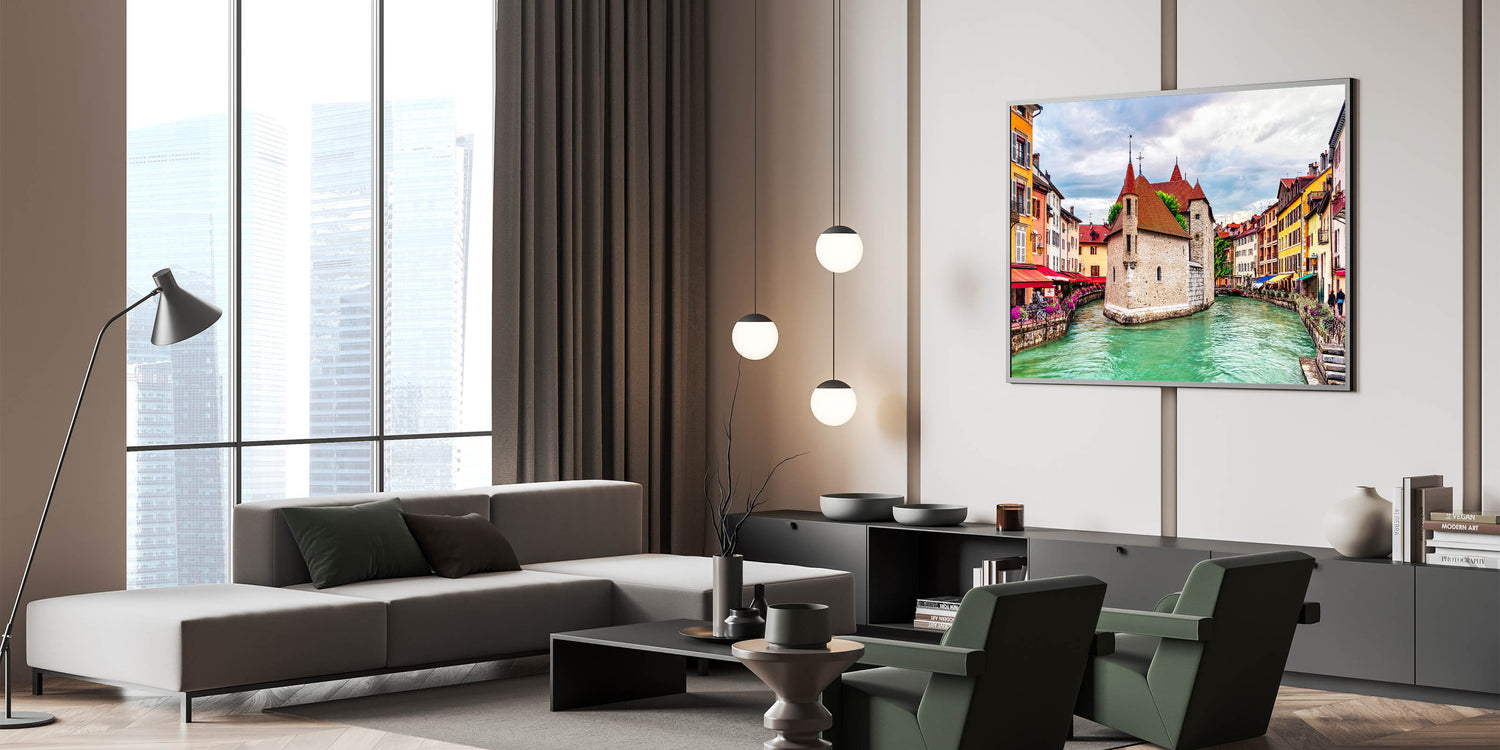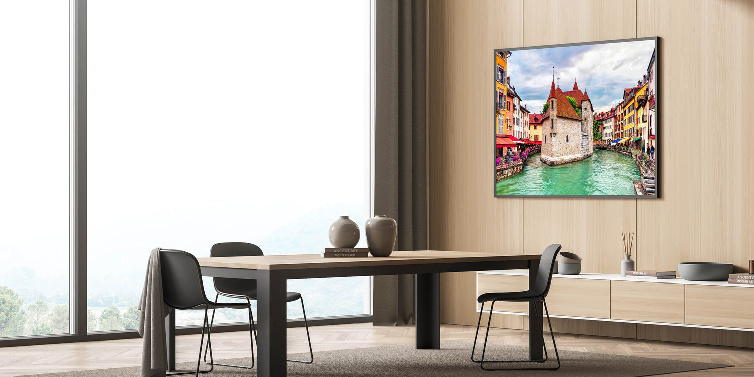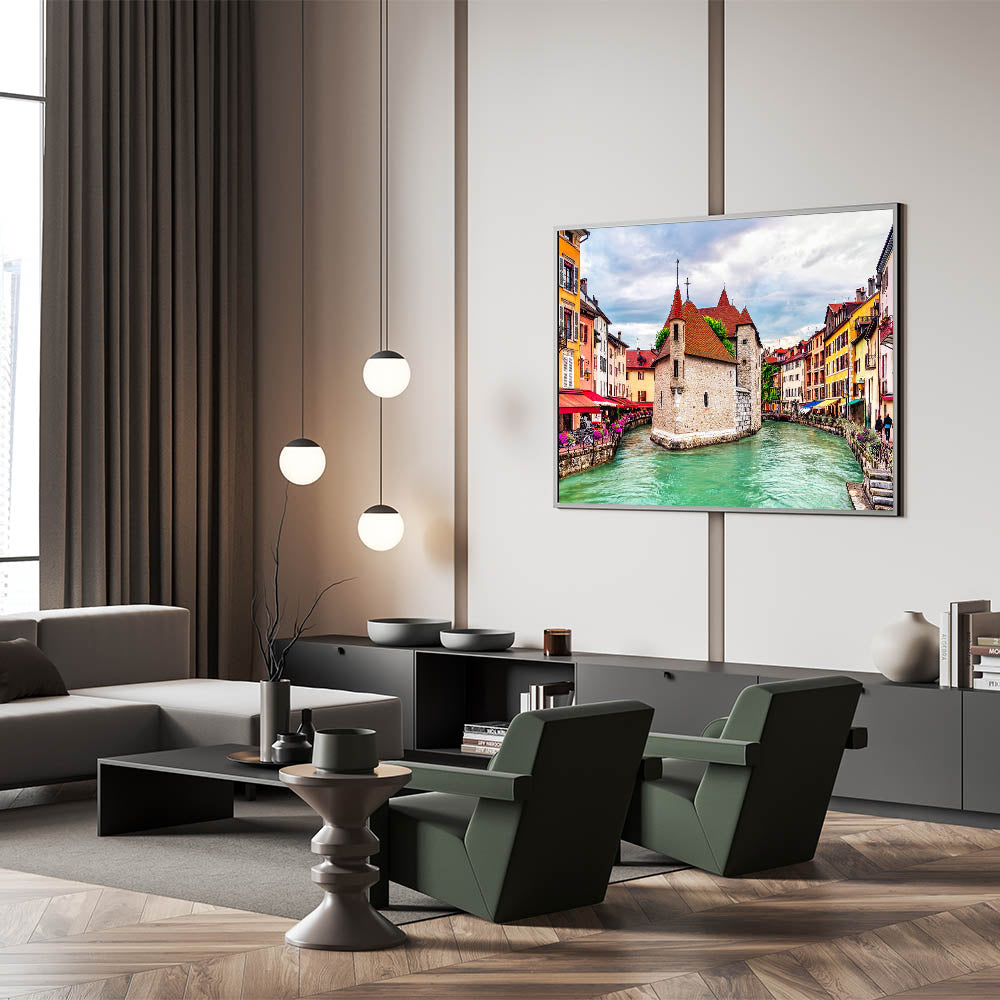 Step into the heart of a picturesque French town with this stunning French Alps wall art, featuring charming canals and vibrant historic architecture. The vivid red rooftops, colorful facades, and serene canal waters bring the essence of French alpine towns into focus. The intricate stonework and inviting cafes along the canal capture the spirit of European charm, offering an art piece that is both lively and full of cultural depth.