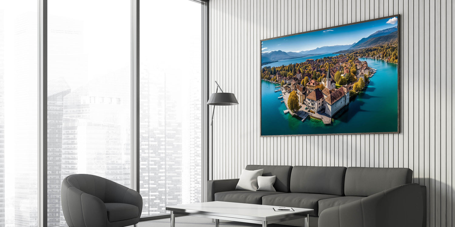 Capture the breathtaking beauty of the French Alps with this serene wall art, featuring a picturesque village nestled on the shores of a tranquil lake. Surrounded by golden autumn foliage, this scenic landscape blends the charm of French alpine life with the peacefulness of nature. The crystal-clear water reflects the vibrant colors of the trees and rooftops, creating a harmonious and calming view that will elevate any space in your home.