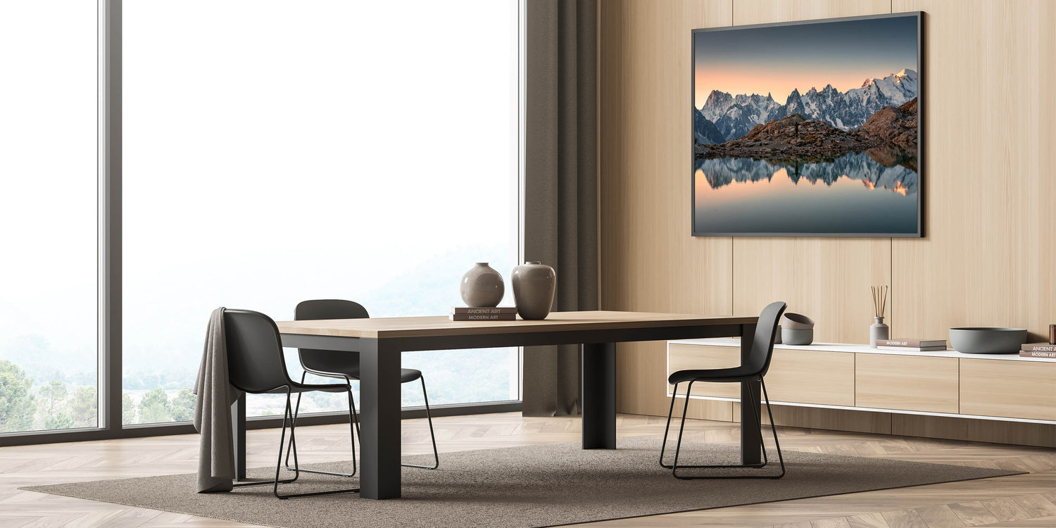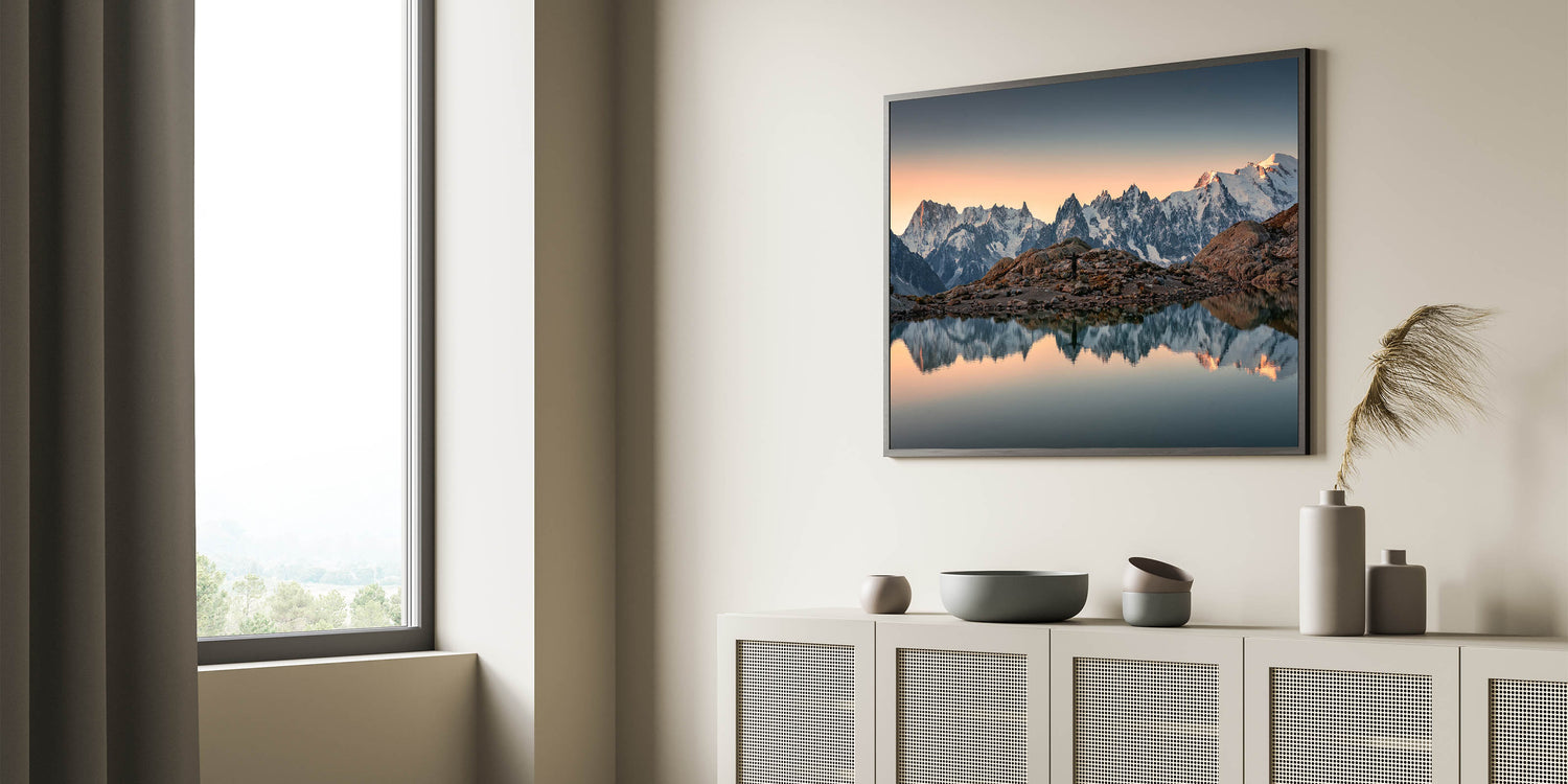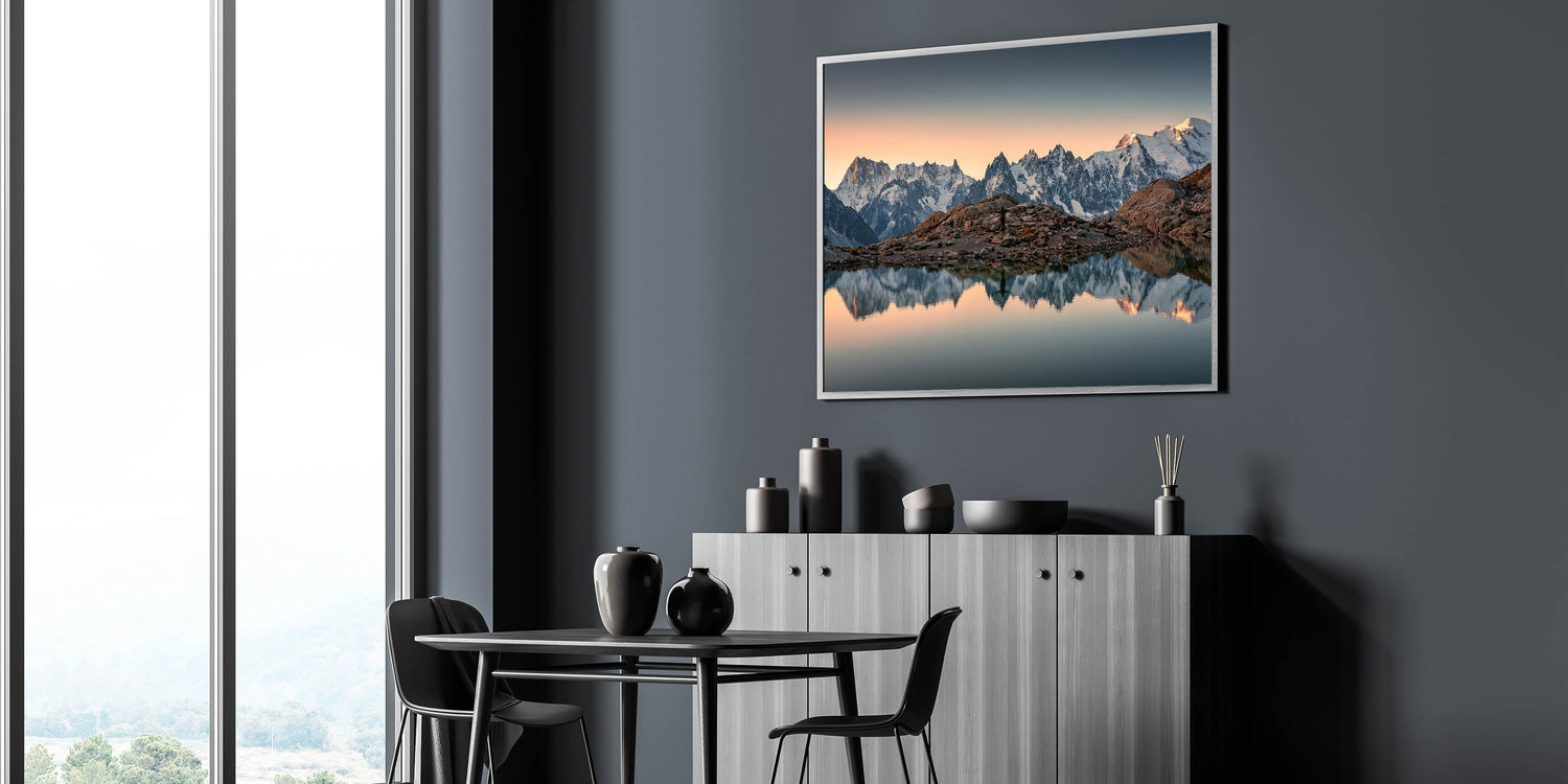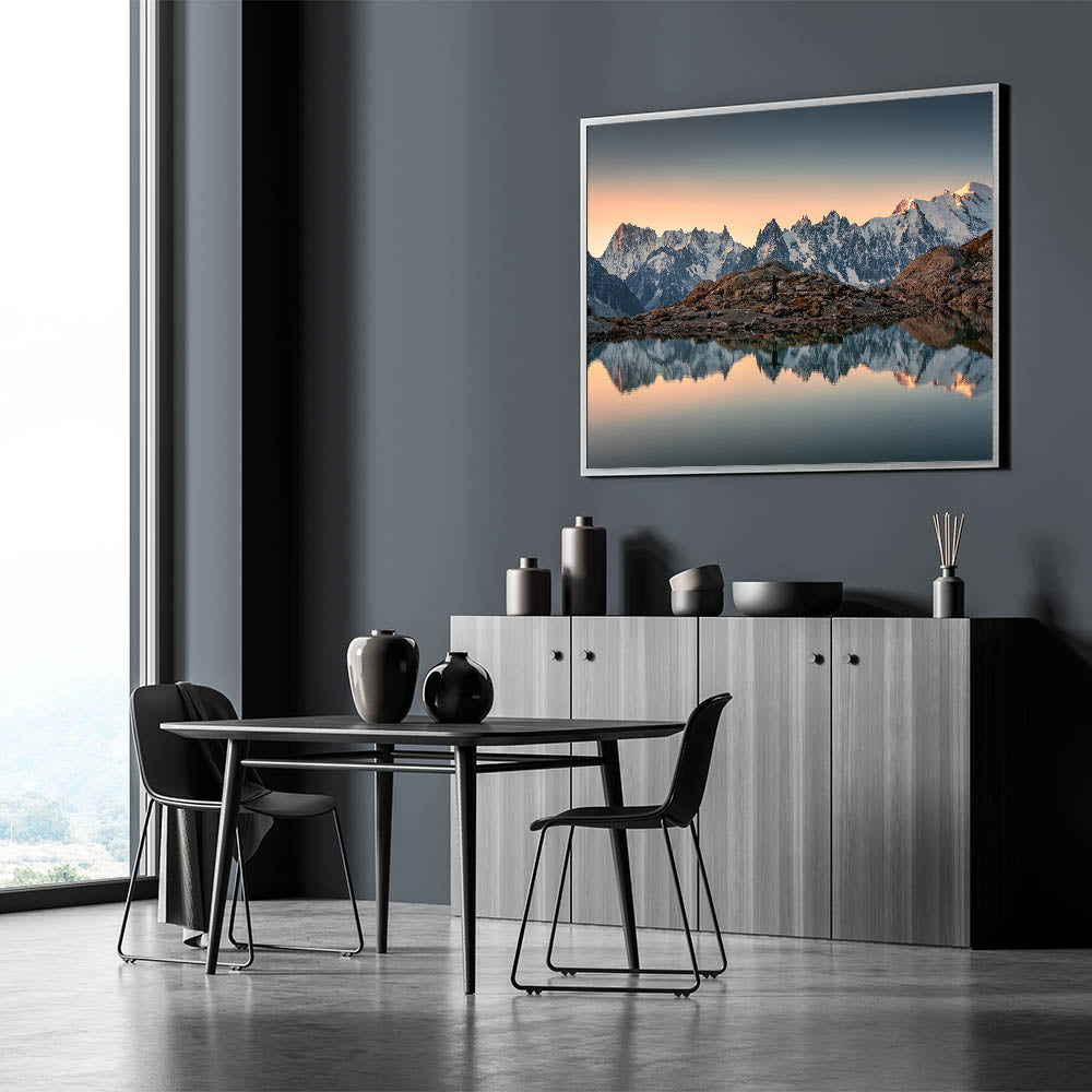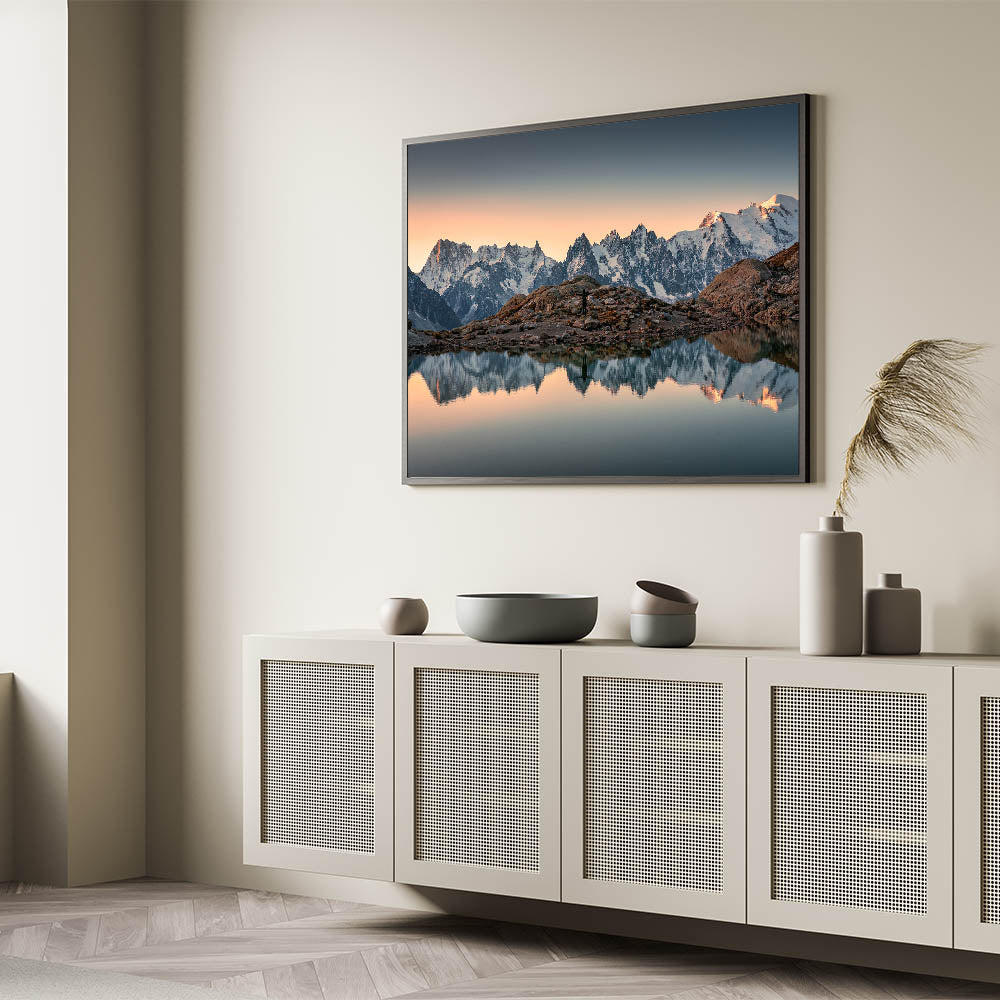 Capture the breathtaking serenity of the French Alps with this stunning wall art, featuring majestic snow-capped mountains reflected perfectly in the still waters at sunset. The soft glow of the setting sun illuminates the peaks with a golden light, creating a calm and peaceful atmosphere that invites contemplation. This beautiful image encapsulates the peaceful beauty of the French Alps, making it the perfect piece for any room in your home or office.