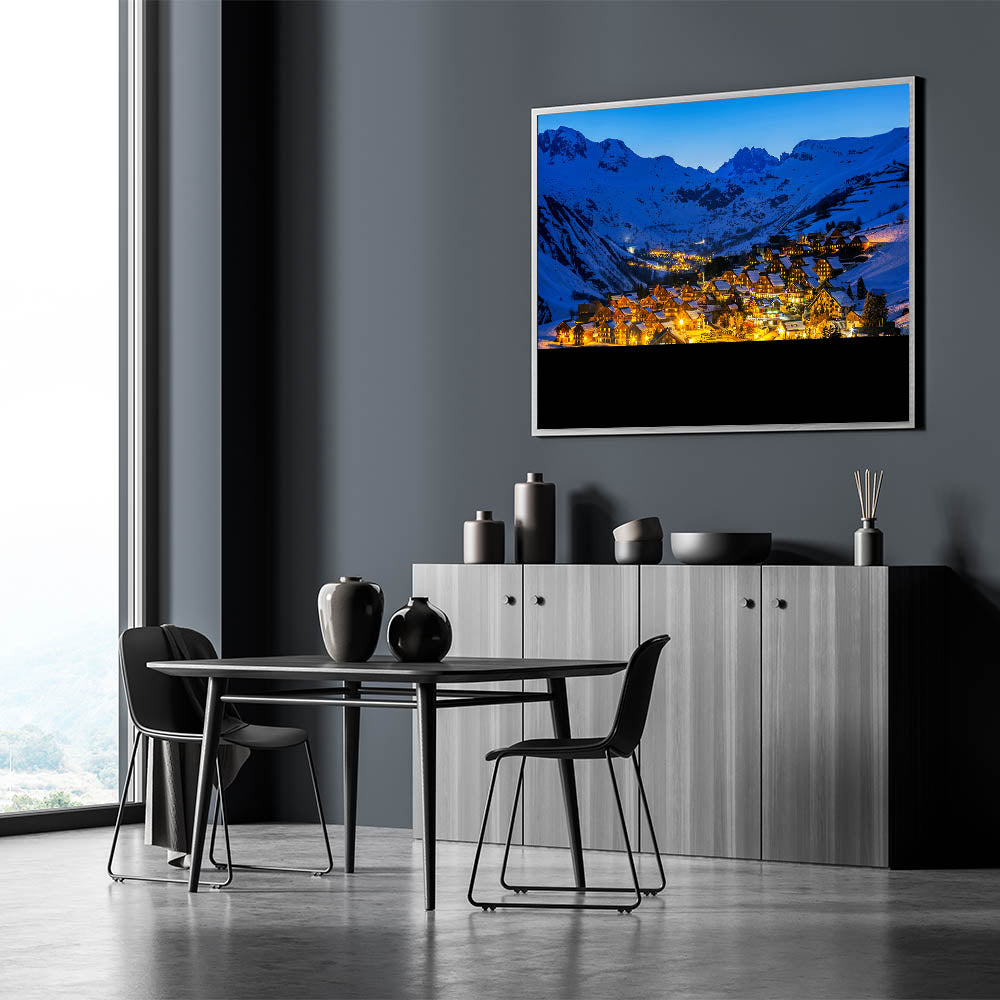 Capture the serene beauty of the French Alps with this stunning nightscape featuring the charming village of Chamonix Mont Blanc. This French Alps scenery art print is perfect for those who appreciate the allure of alpine landscapes and the tranquility of a peaceful winter evening.