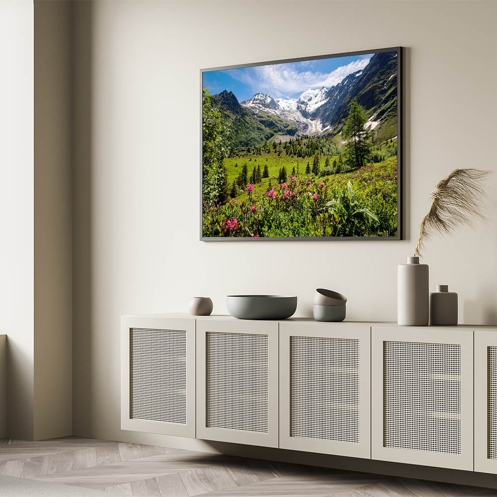 Immerse yourself in the beauty of the French Alps with this stunning artwork showcasing a vibrant alpine meadow set against majestic, snow-capped peaks. This French Alps scenery art print captures the serenity of nature, making it an ideal addition to any home or office decor.