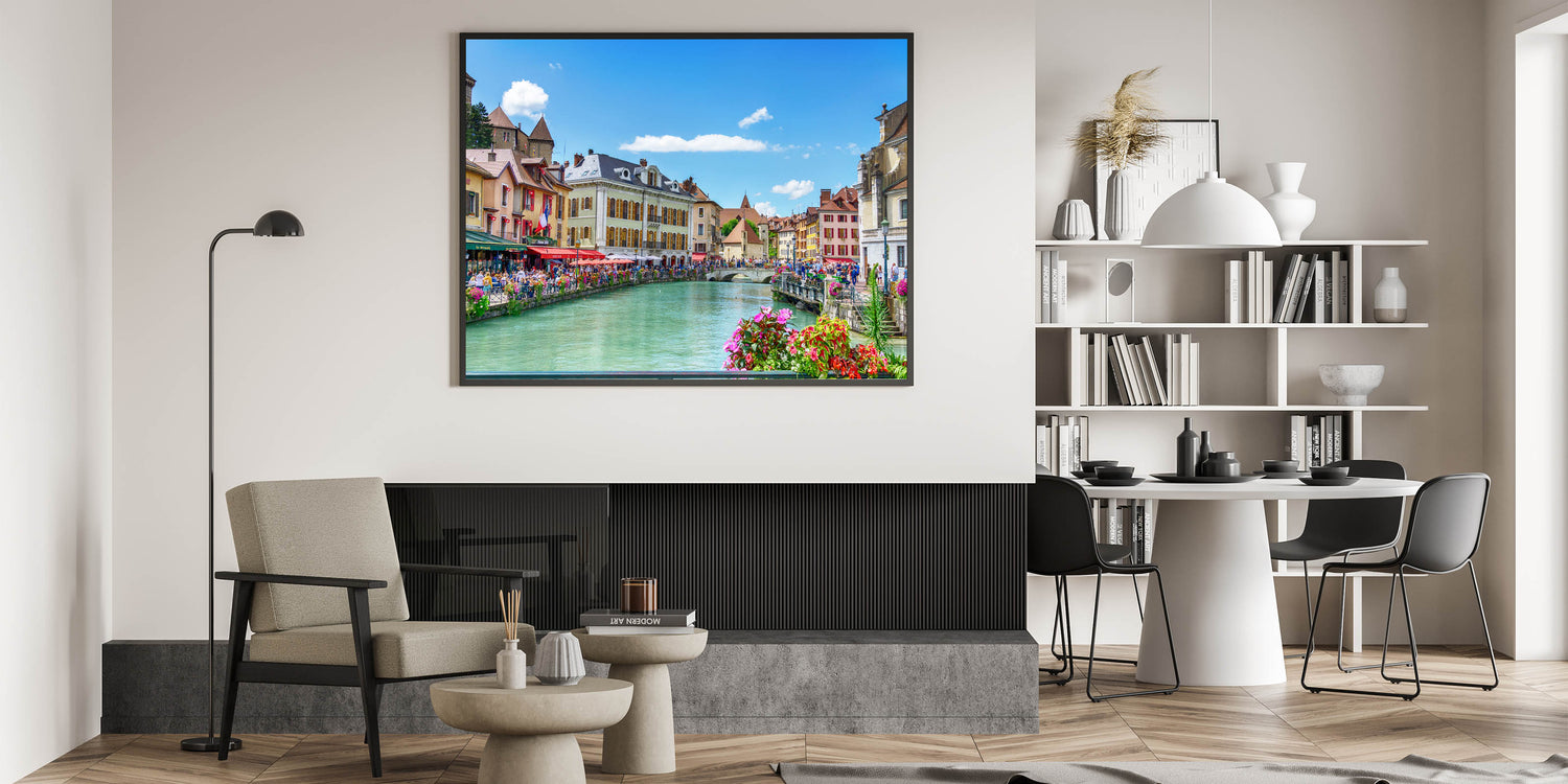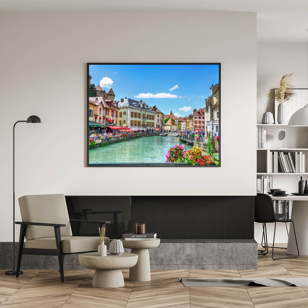 Add a burst of color and charm to your space with this stunning wall art, featuring a lively canal surrounded by vibrant French architecture in a picturesque alpine town. The colorful facades of the buildings reflect beautifully on the turquoise waters, creating a scene full of energy and warmth. The busy cafes and historical architecture capture the essence of European charm and create a lively, dynamic piece of art that is sure to brighten any room.