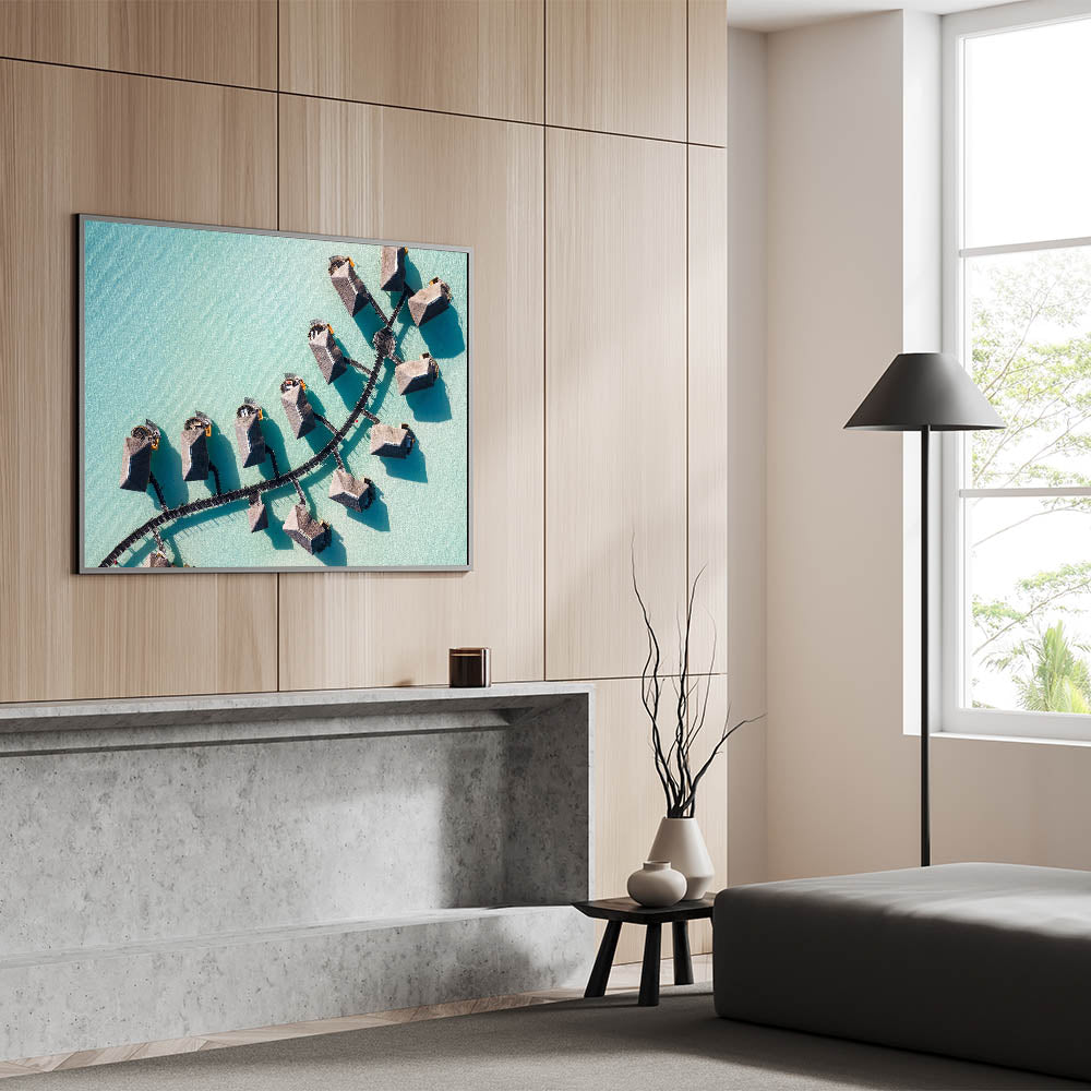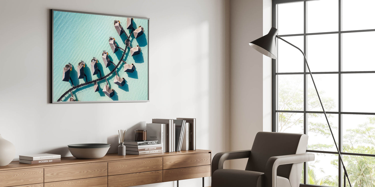 Capture the essence of luxury and tranquility with our "Oceanic Art Print," showcasing an aerial view of the iconic overwater bungalows of Bora Bora. This breathtaking print offers a unique perspective, featuring the pristine turquoise waters and the geometric beauty of the bungalows that seamlessly blend with nature.