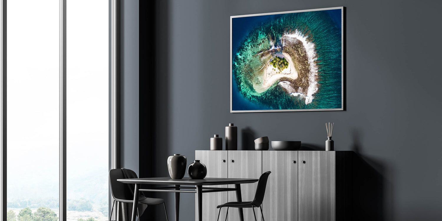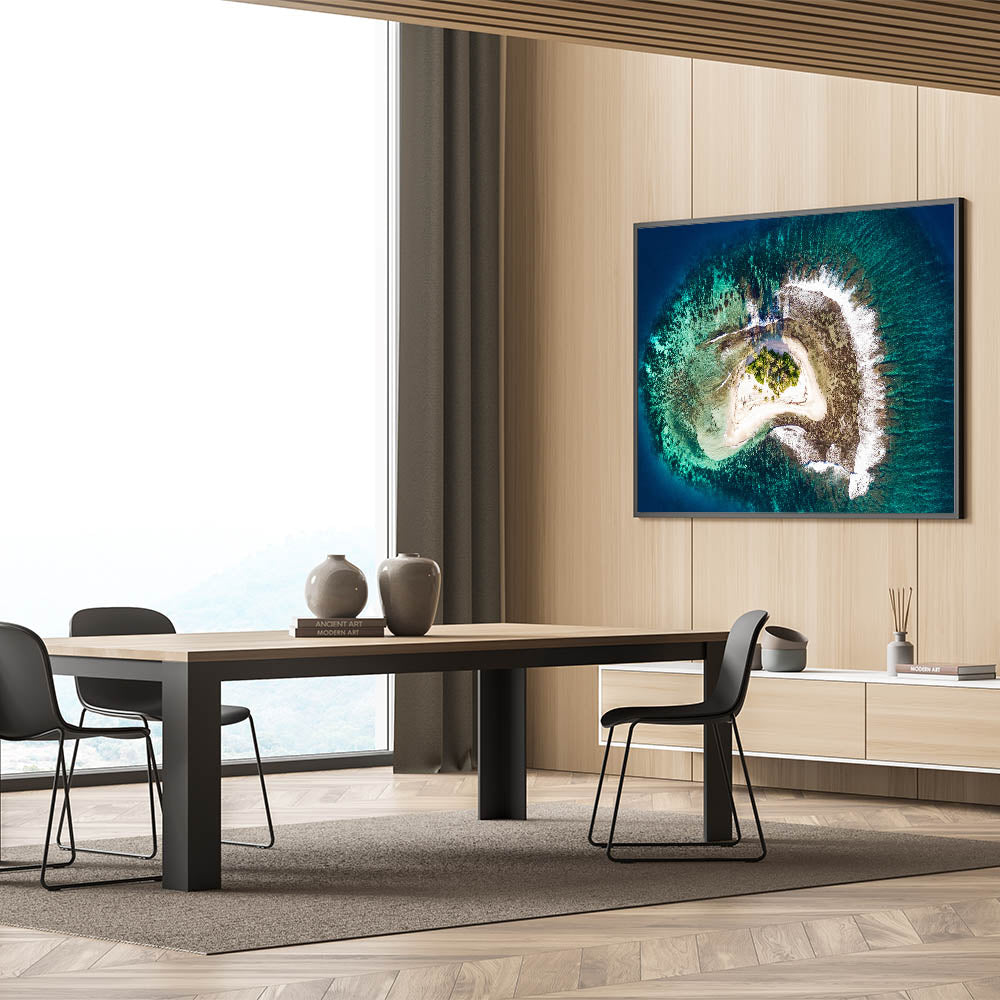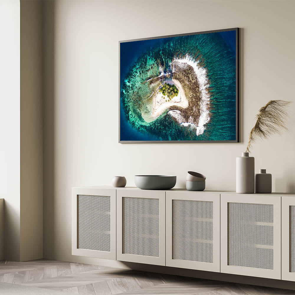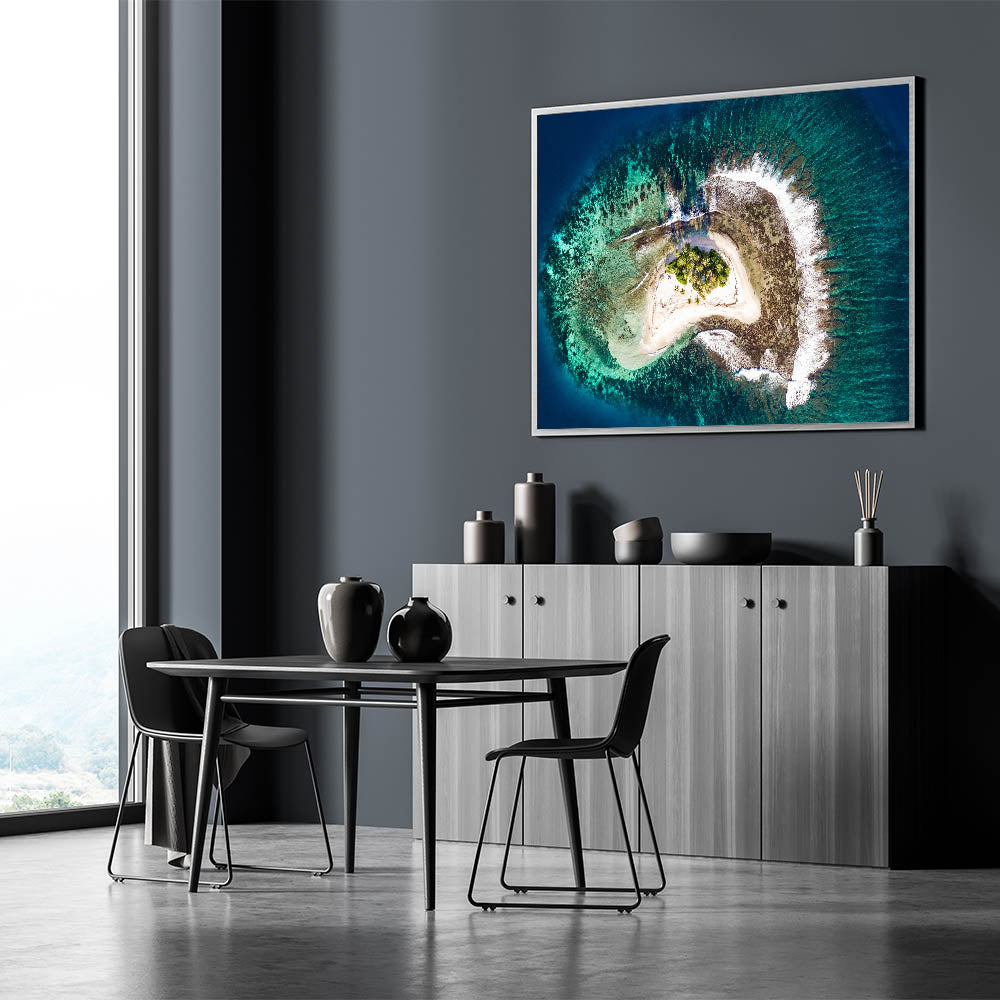Elevate your decor with the breathtaking "Aerial View of Tahitian Islet - Vibrant Ocean Canvas Print." This captivating artwork showcases a bird's-eye view of a secluded islet in the heart of Tahiti's azure waters, surrounded by vibrant coral reefs and white sandy shores, adorned with lush tropical palms.
