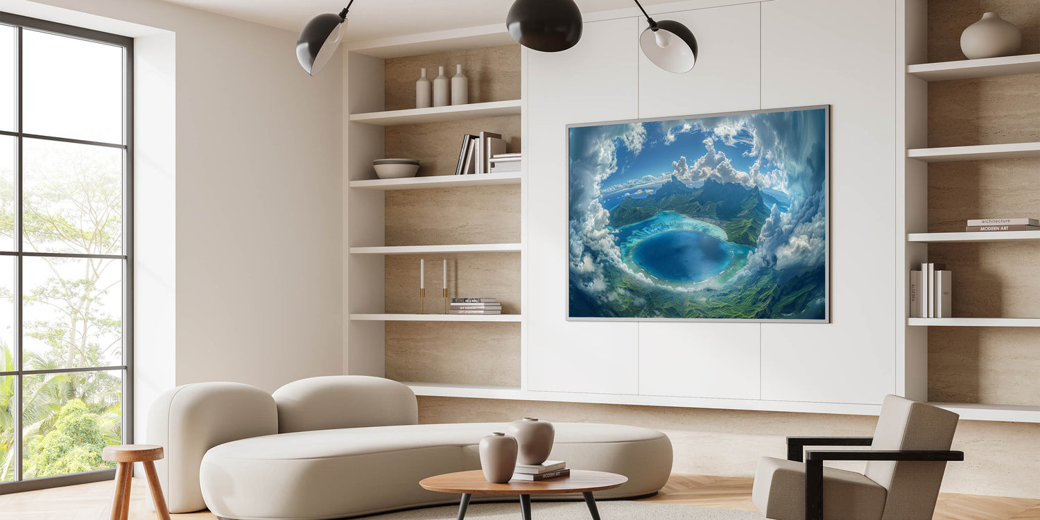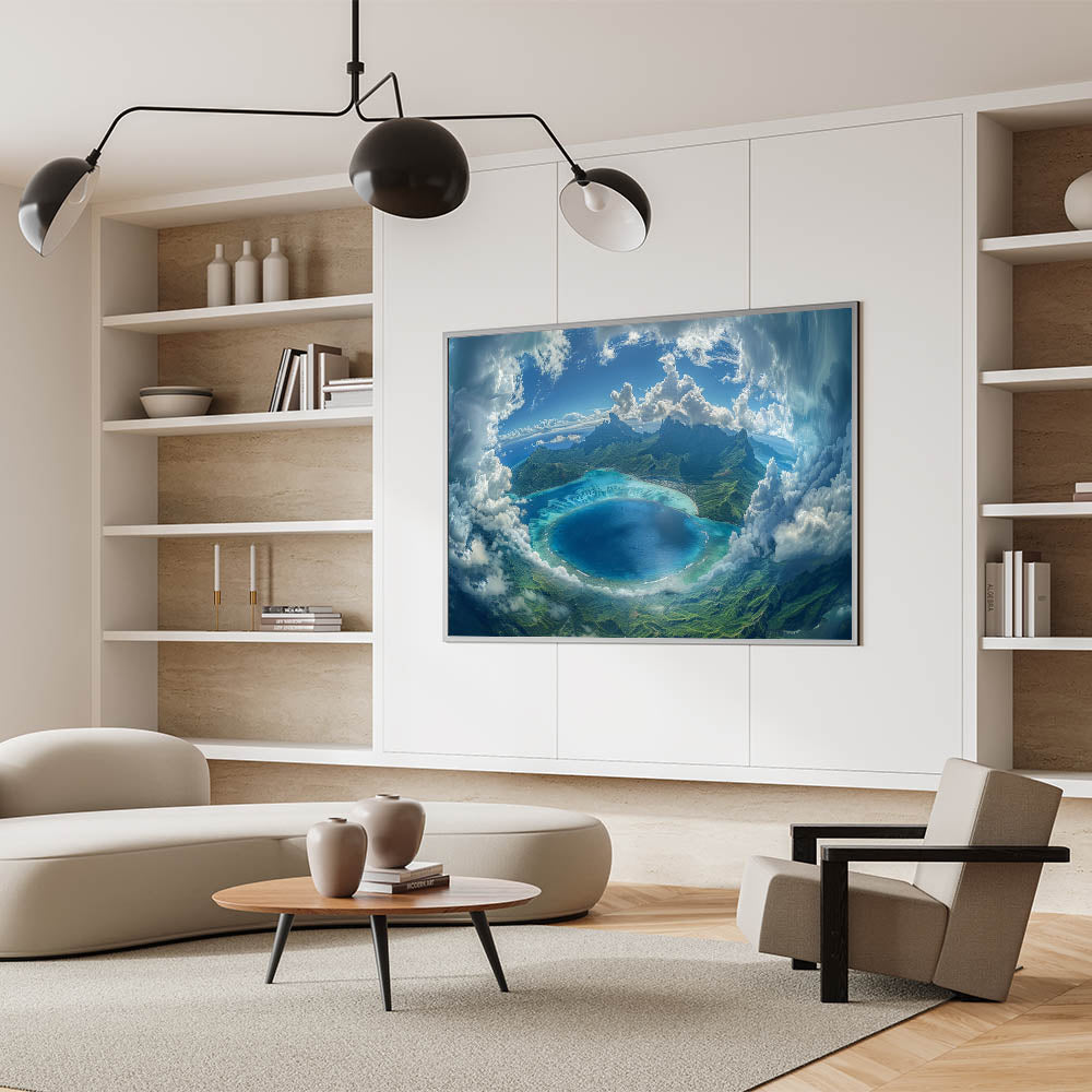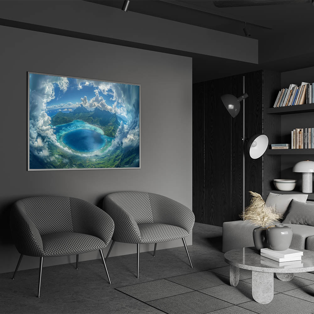 Elevate your decor with our Bora Bora Aerial Majesty Canvas, a stunning portrayal from our Bora Bora Scenery by Region collection. This breathtaking piece captures an expansive aerial view of the iconic island, surrounded by a dramatic dance of clouds and light that highlights the vivid blues of the lagoon and the lush greens of the tropical terrain.