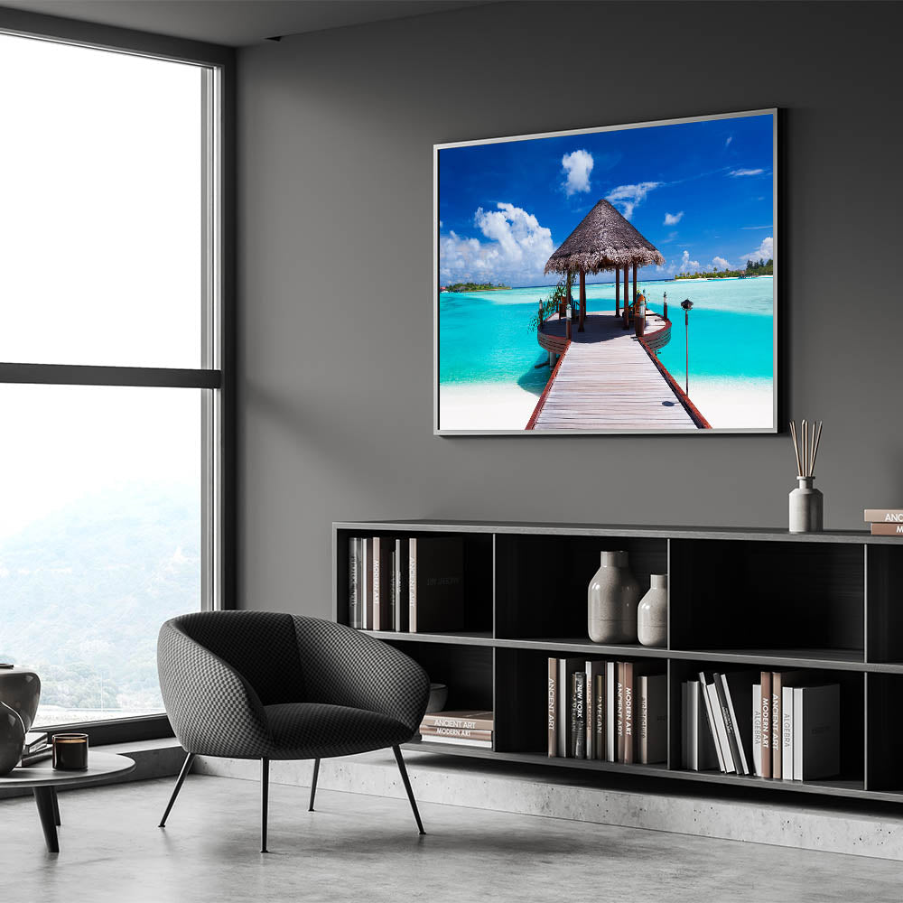 Elevate your home or office decor with this breathtaking view of Bora Bora. Whether as a focal point in your living room or a tranquil addition to your office, this piece promises to transport you to a tropical paradise with every glance. Order now to bring the beauty of Bora Bora into your everyday life!