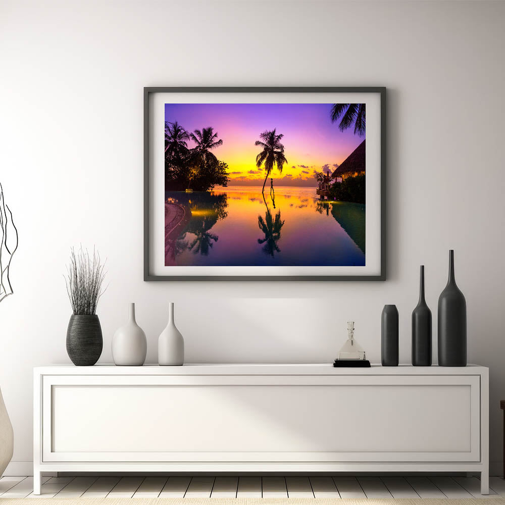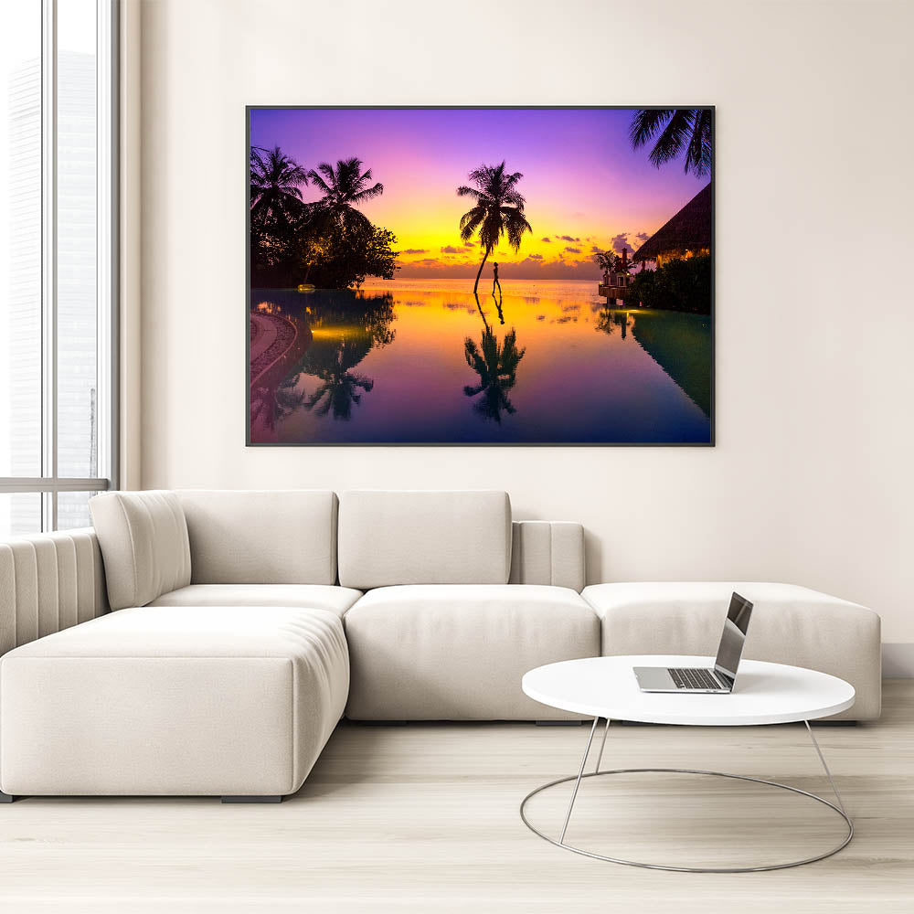 Immerse yourself in the serene beauty of the Bora Bora Sunset Canvas Print, a captivating addition to our Bora Bora Scenery by Region collection. This exquisite piece captures the breathtaking sunset over a tranquil Bora Bora lagoon, framed by lush palm trees and a reflective infinity pool, offering a slice of paradise right in your living space.