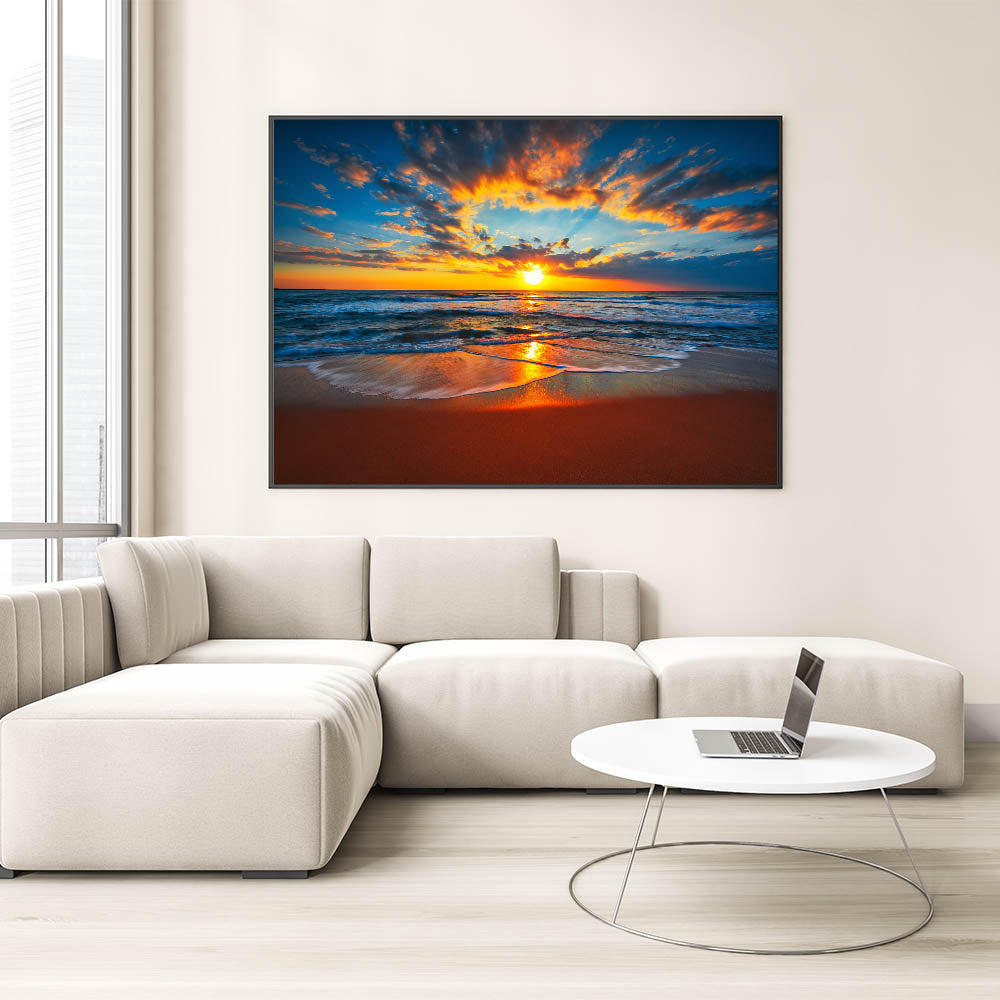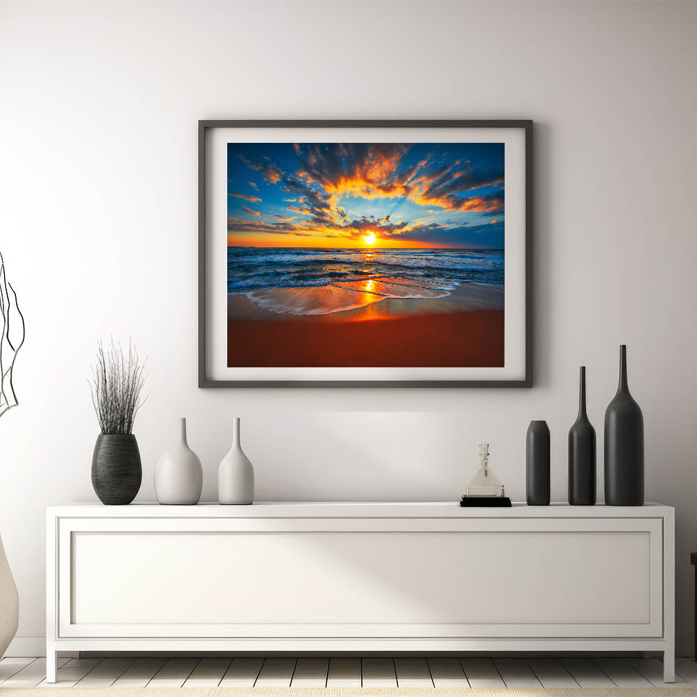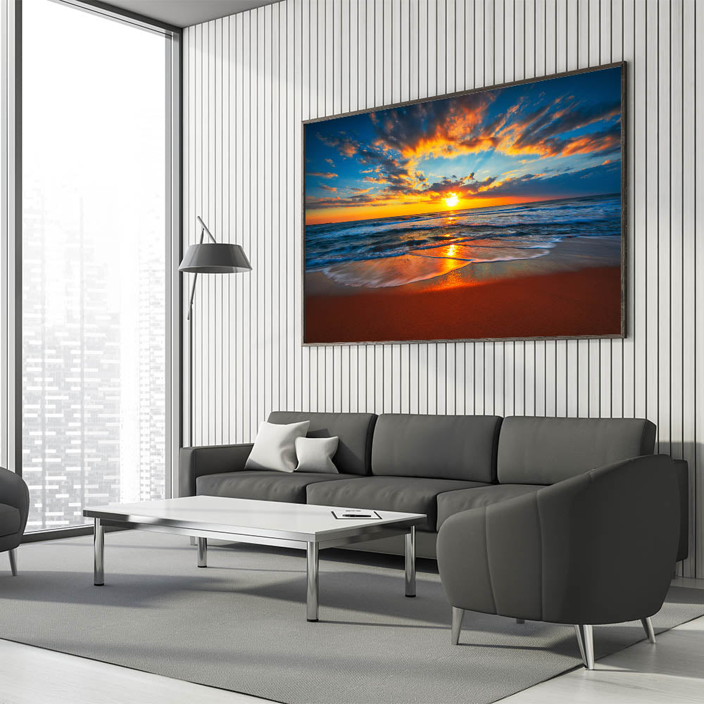 This "Fiery Beach Sunset Art" is perfect for anyone who loves dramatic sunsets and the soothing rhythm of the waves. Ideal for a living room, bedroom, or office, it adds a touch of nature's grandeur to your décor. Let this stunning seascape transform your space into a haven of tranquility and beauty.