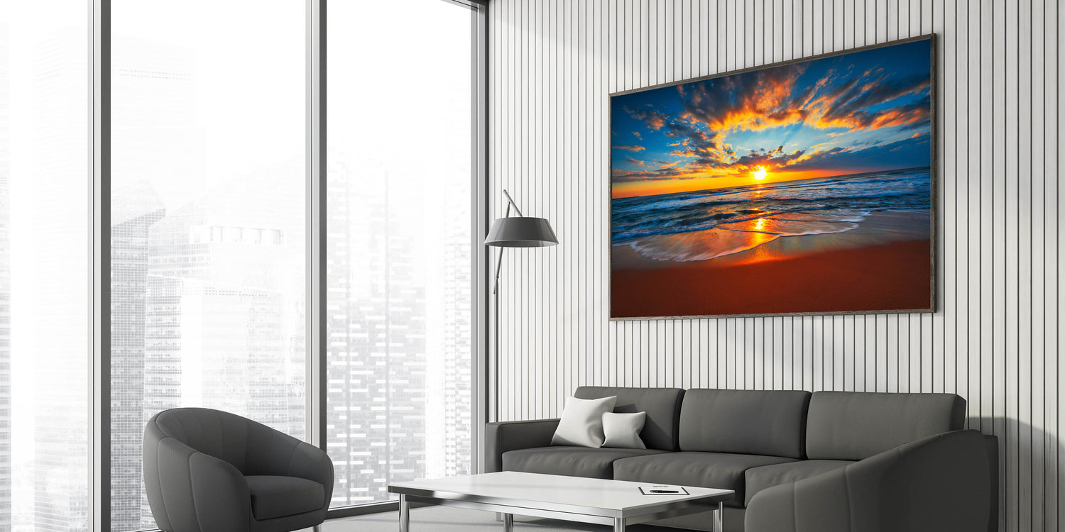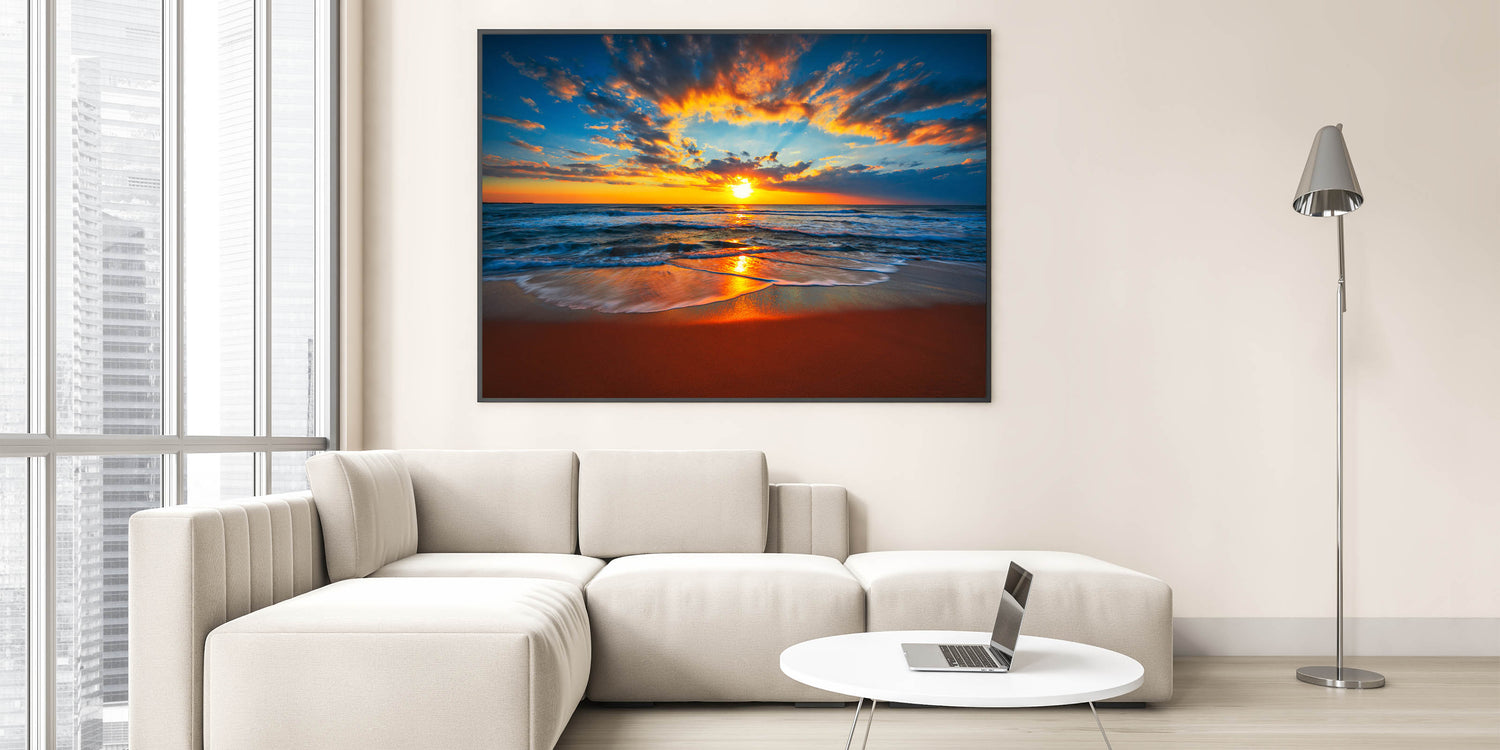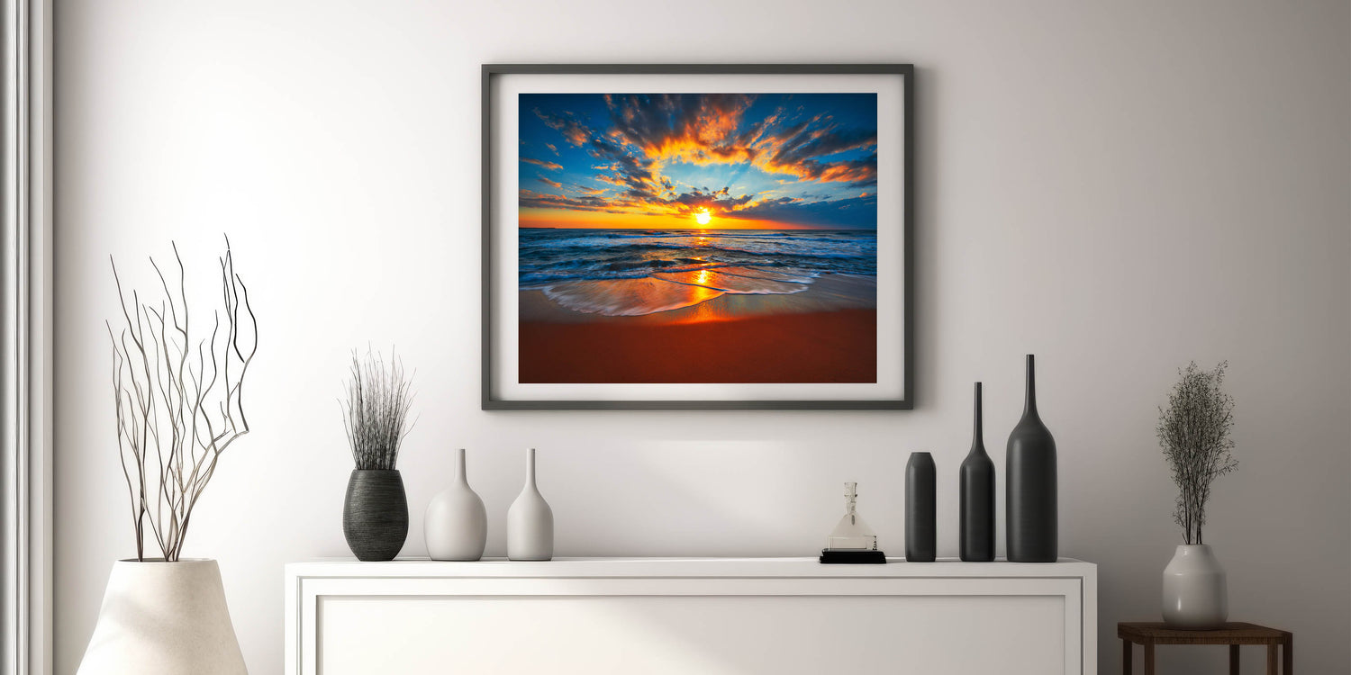 This "Fiery Beach Sunset Art" is perfect for anyone who loves dramatic sunsets and the soothing rhythm of the waves. Ideal for a living room, bedroom, or office, it adds a touch of nature's grandeur to your décor. Let this stunning seascape transform your space into a haven of tranquility and beauty.