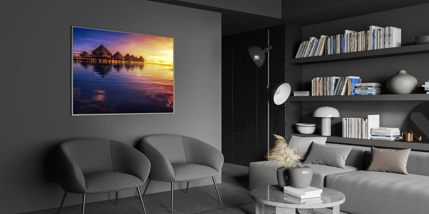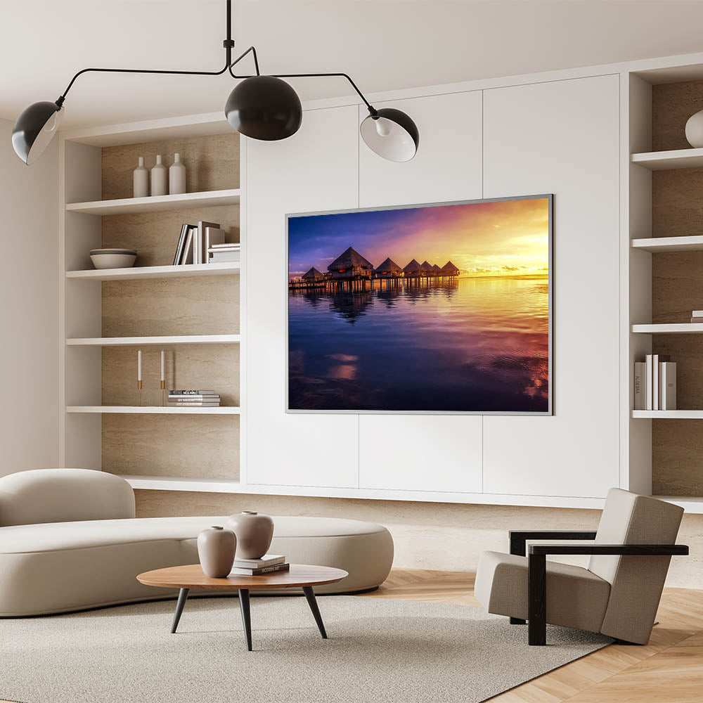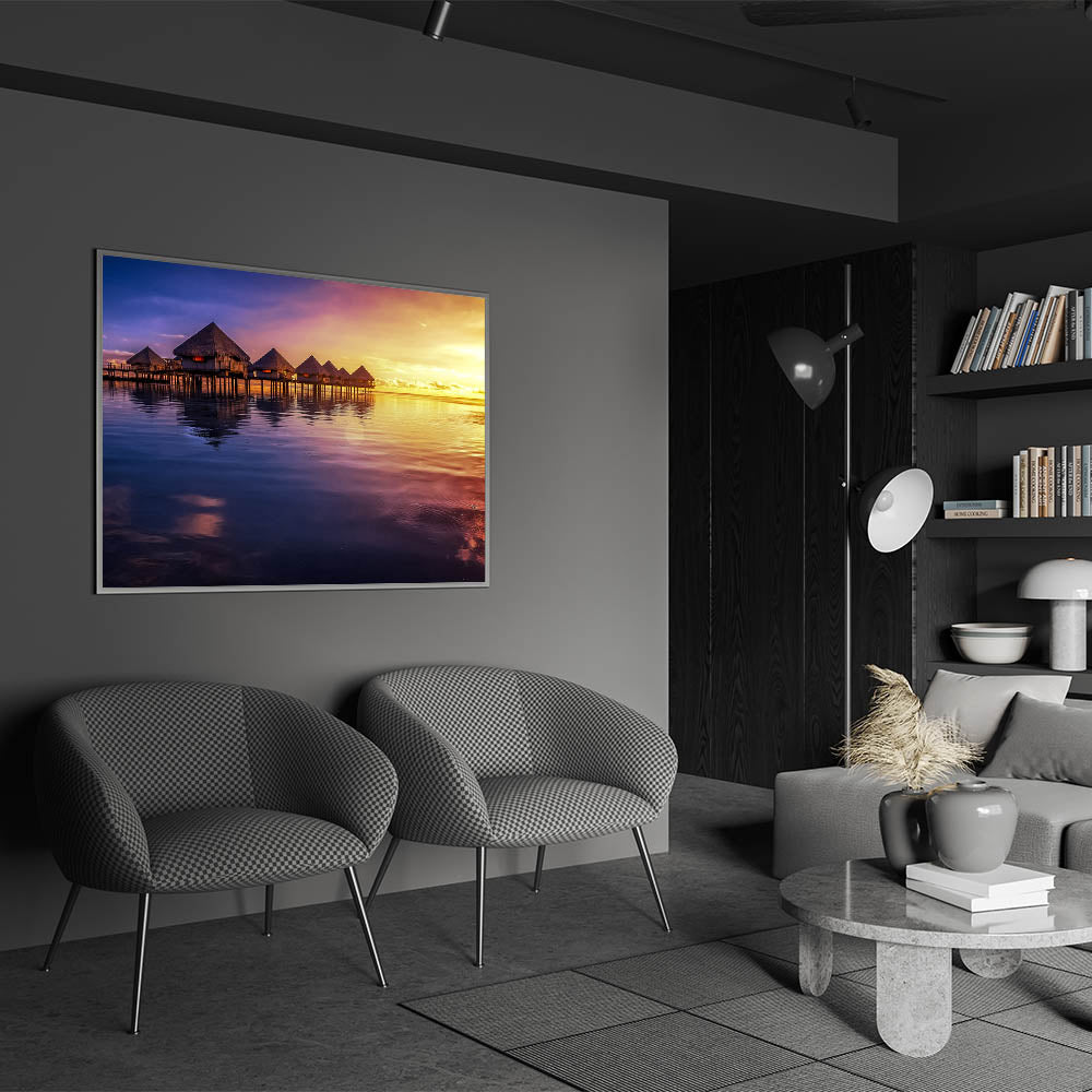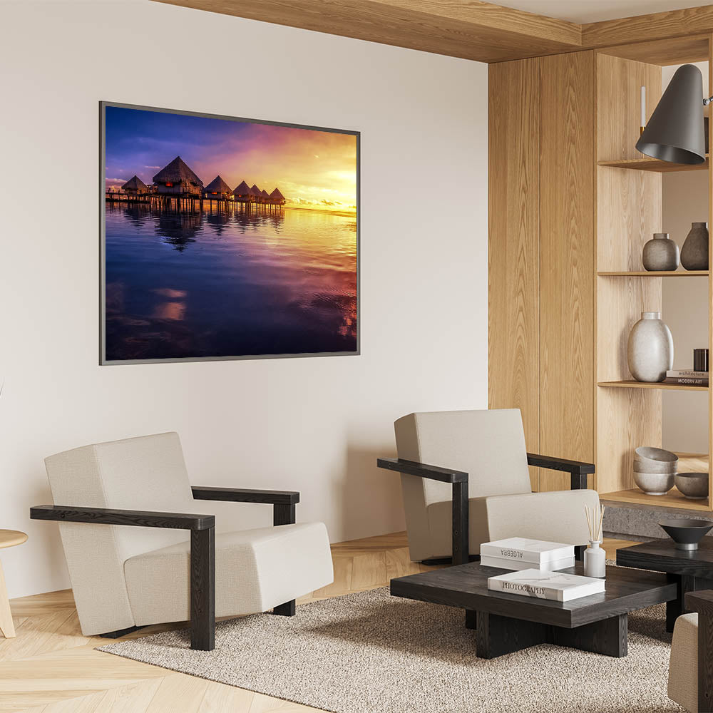 This artwork is perfect for anyone wishing to add a touch of elegance and peace to their living or workspace. Let the soothing scenes of Tahiti's sunset and calm waters bring a sense of relaxation and luxury to your environment.