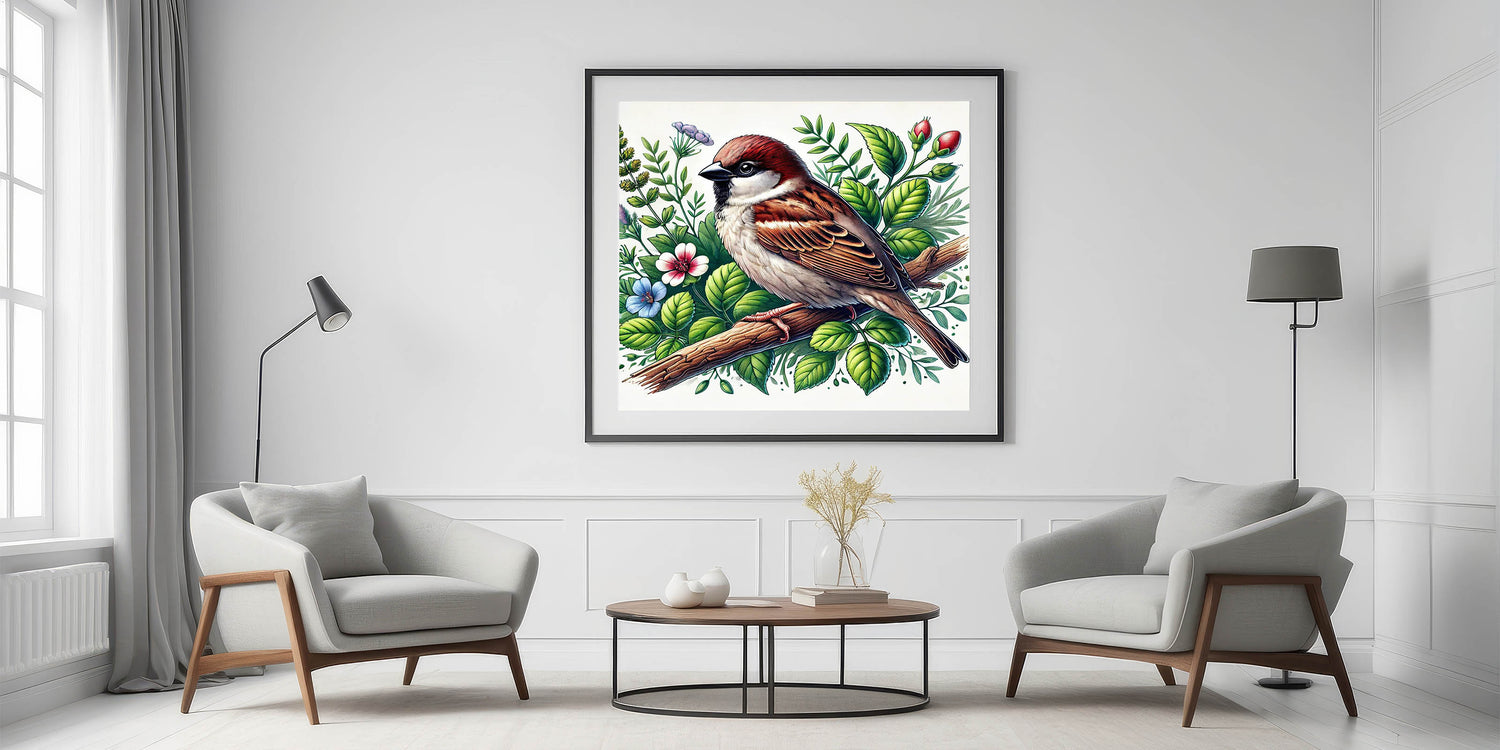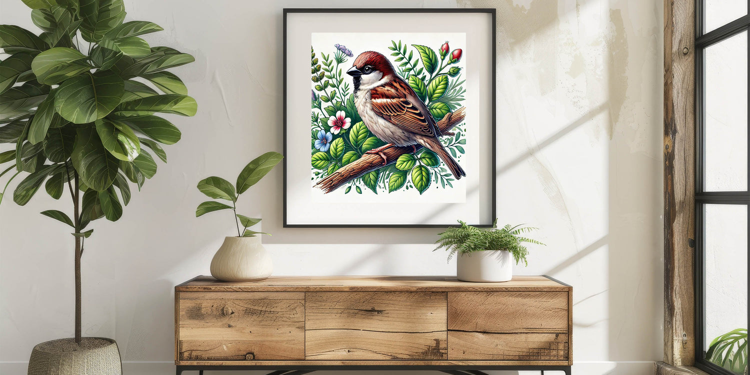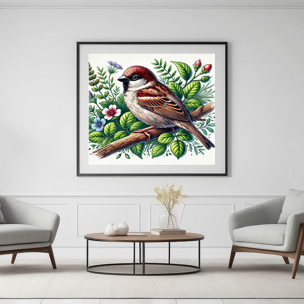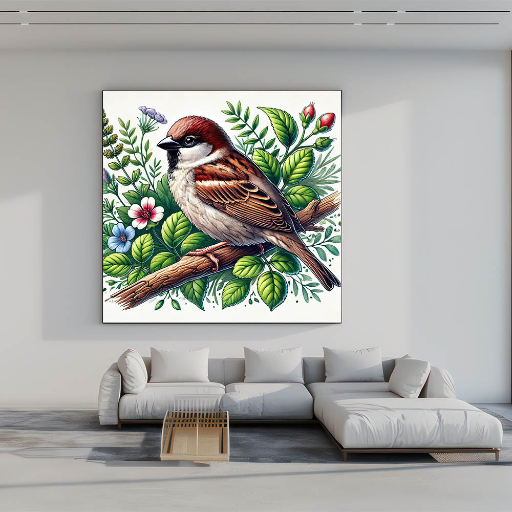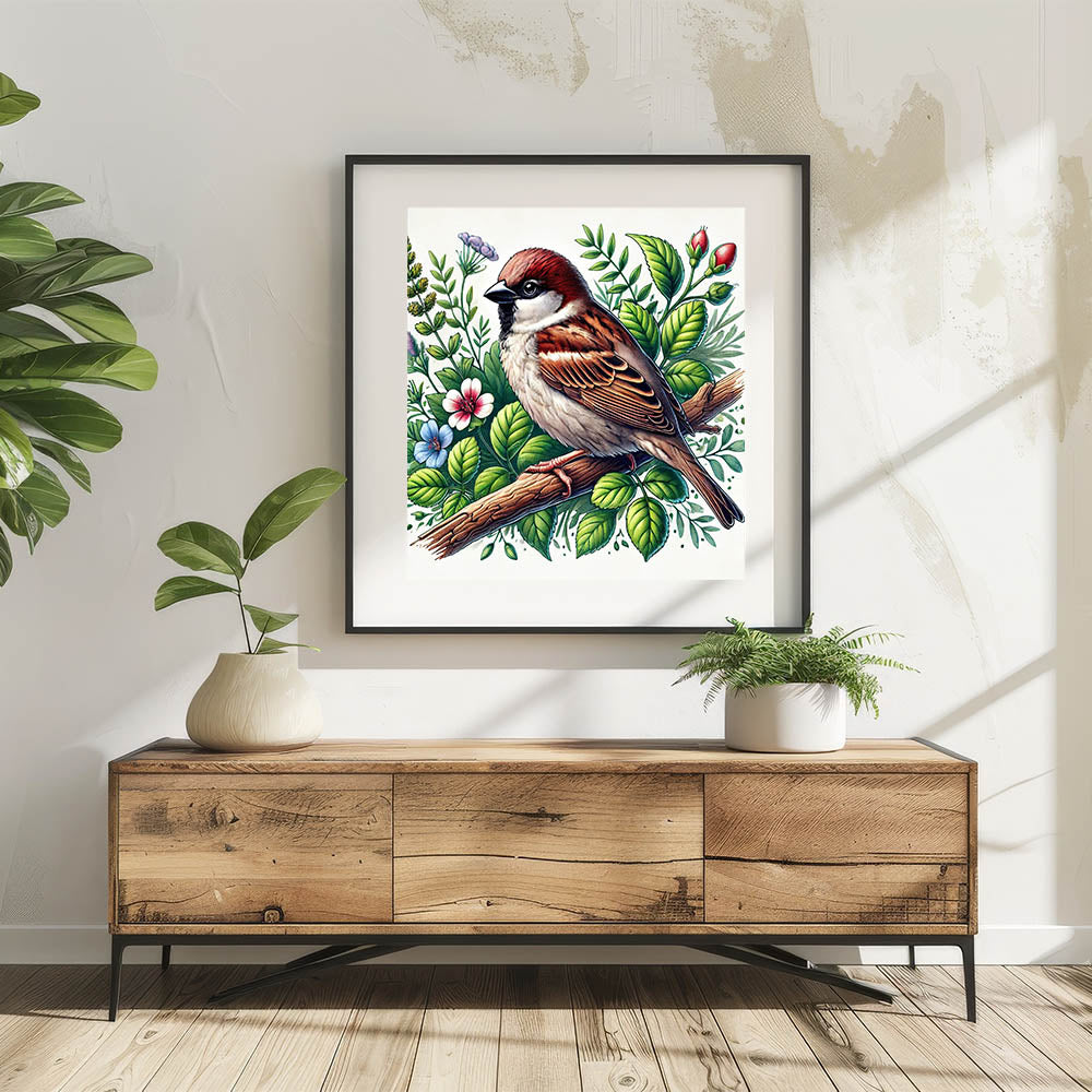 Bring the beauty of nature into your home with this stunning Botanical Garden Birds Wall Art. Featuring a detailed illustration of a sparrow perched on a branch amidst a vibrant array of green leaves and colorful flowers, this artwork captures the charm and serenity of a garden in full bloom. The rich earth tones of the bird, paired with the lush greenery and delicate florals, create a refreshing and inviting atmosphere.