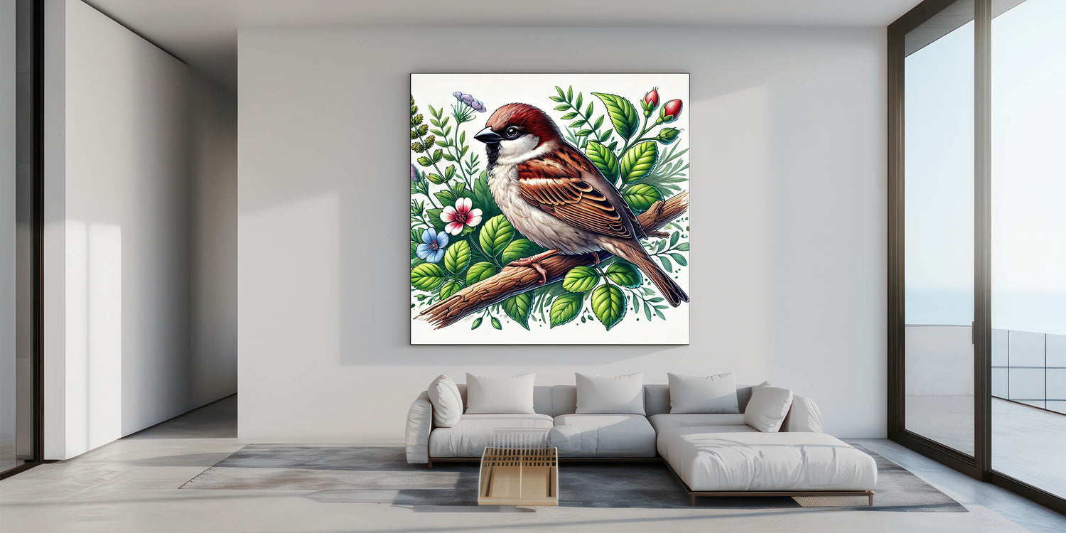 Botanical Garden Birds Wall Art - Sparrow and Floral Canvas Decor