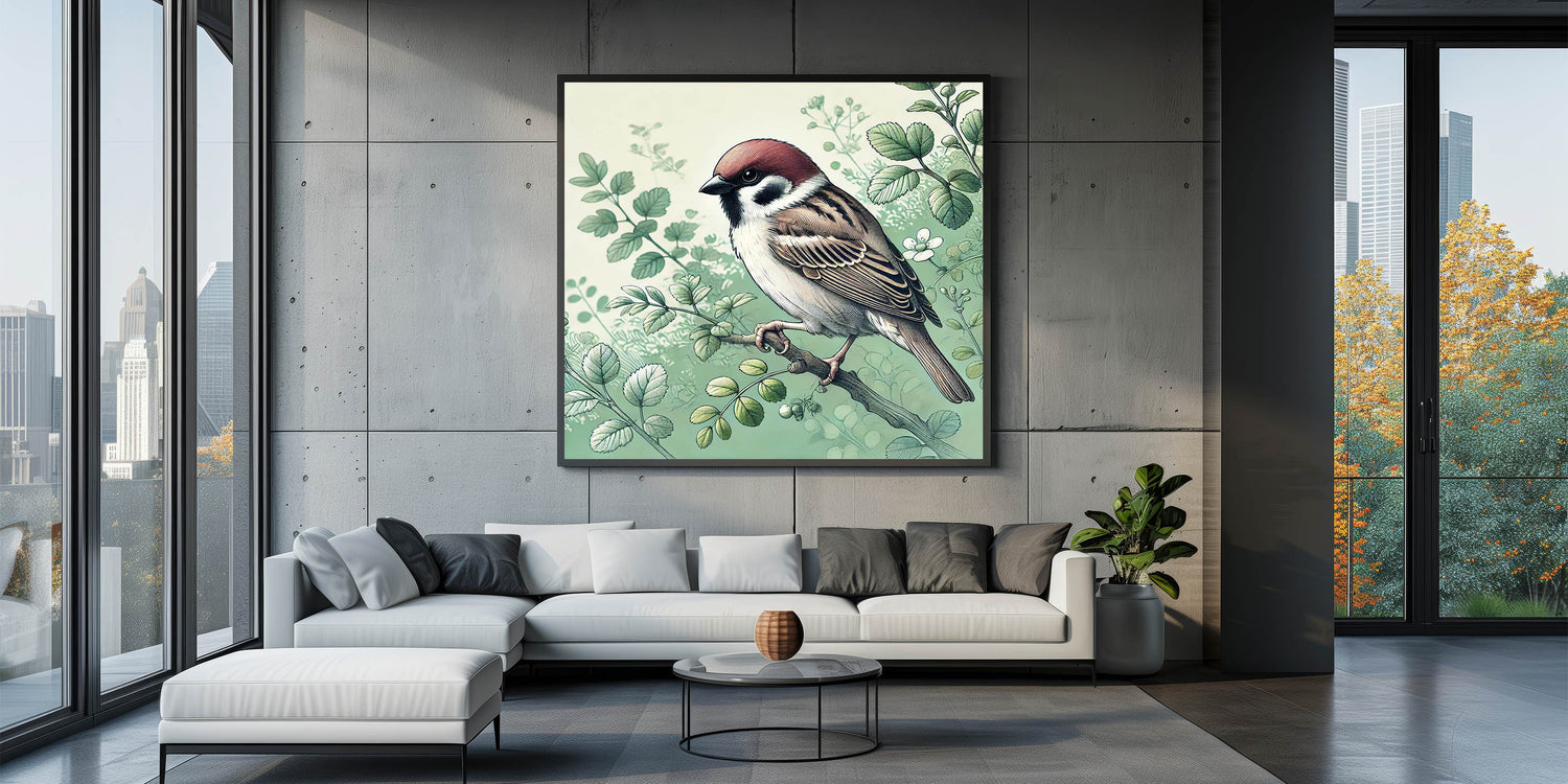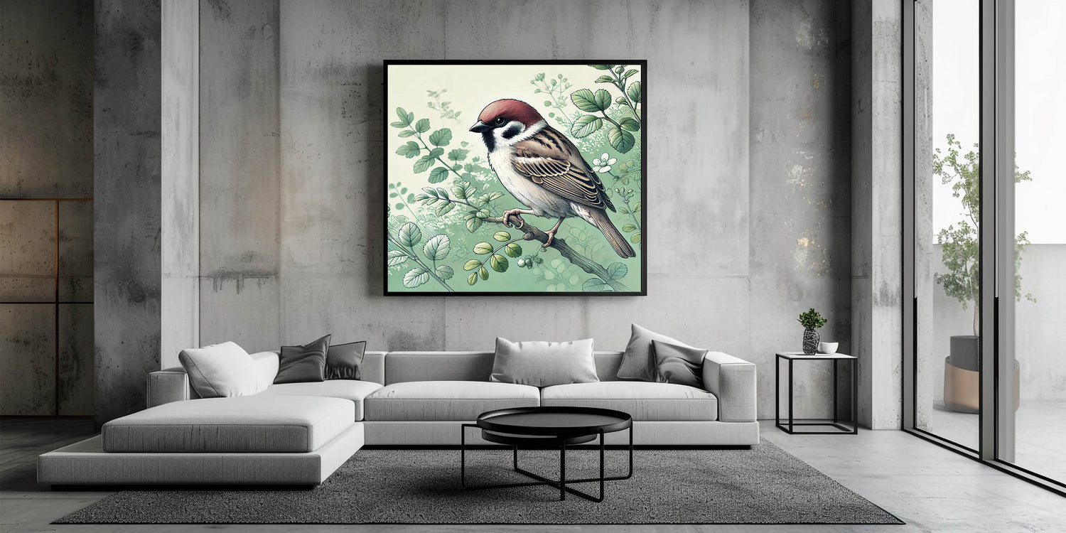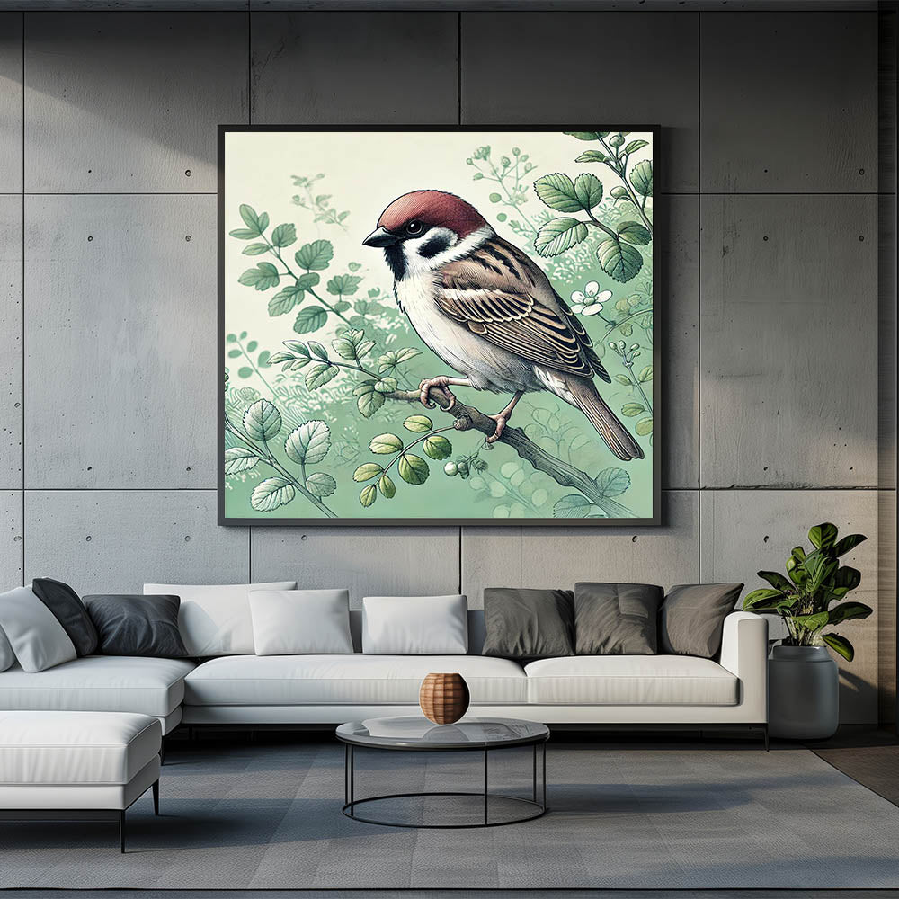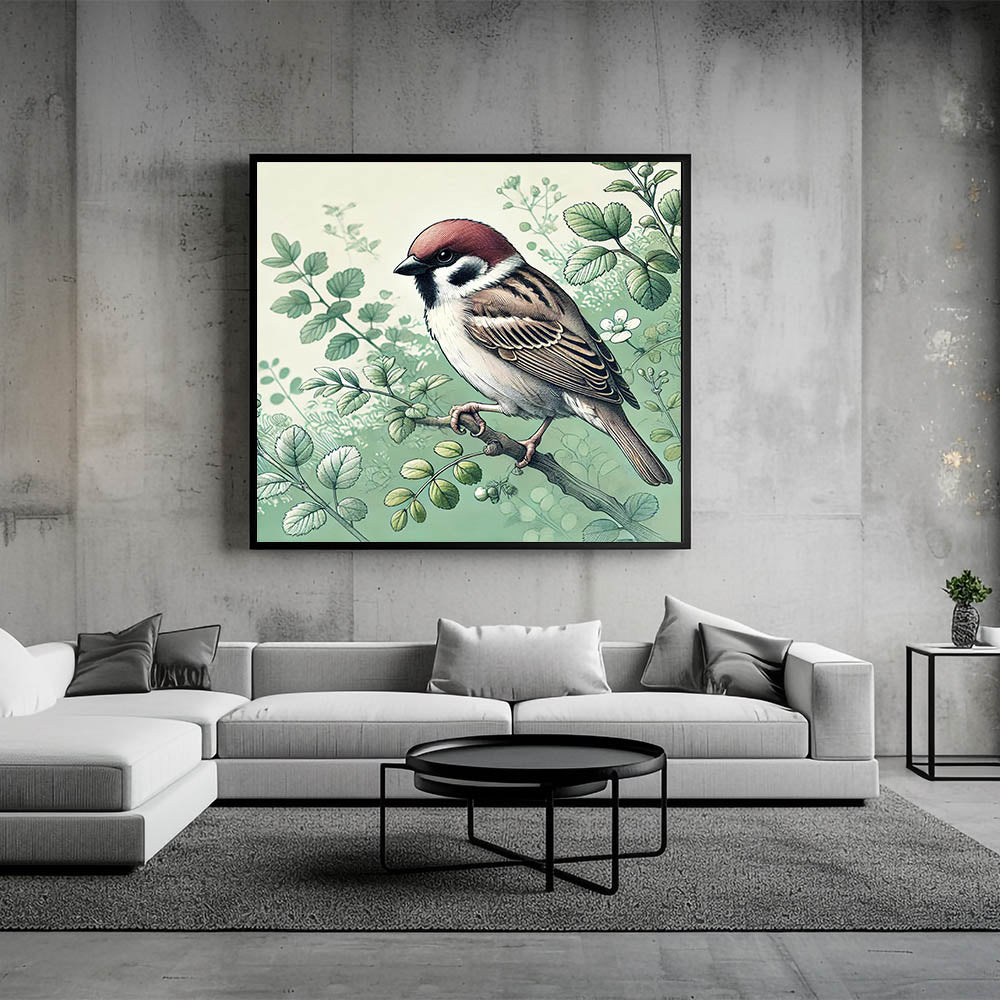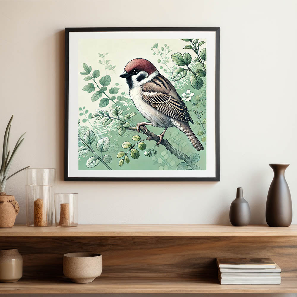 Capture the tranquil beauty of a garden with this Charming Garden Birds Wall Art. Featuring a detailed illustration of a sparrow perched among delicate greenery, this artwork is a perfect representation of nature's peaceful moments. The soft green tones and intricate detailing of the leaves and feathers make this piece a serene addition to any room.