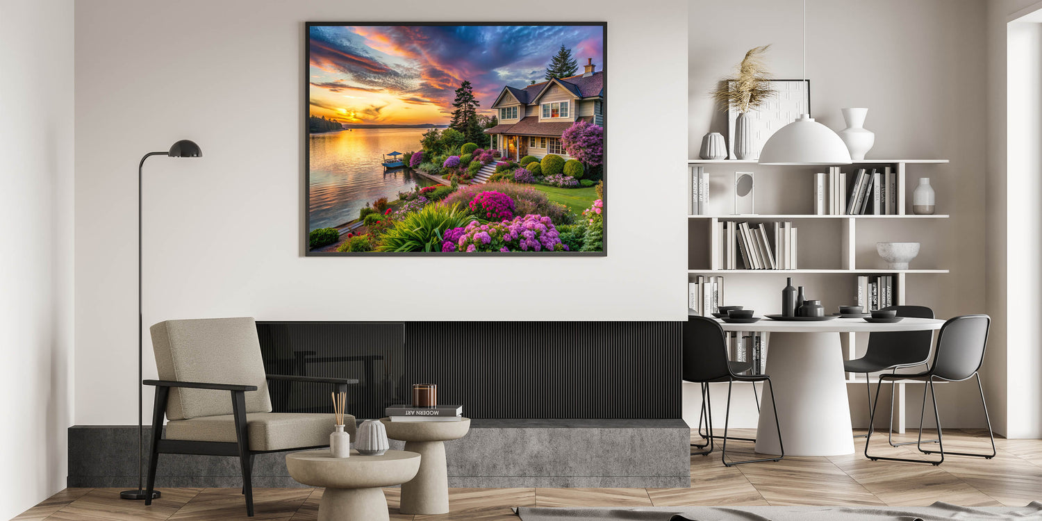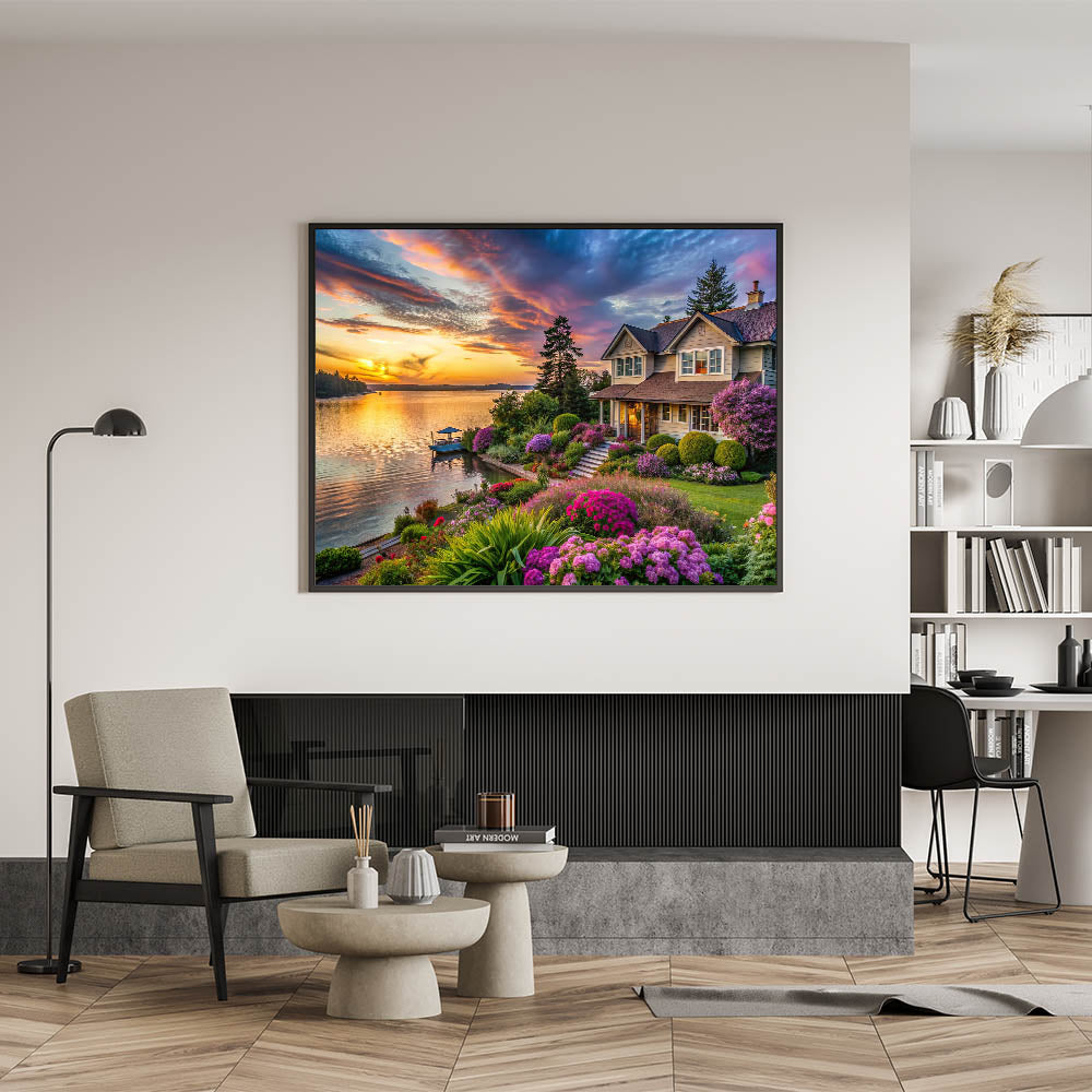 Experience the peaceful beauty of our Lakeside Garden Sunset Wall Art. This stunning artwork captures a tranquil garden overlooking a serene lake, with the vibrant colors of a sunset reflecting on the water. The lush greenery and blooming flowers surrounding the charming lakeside home create a picturesque and inviting scene, perfect for adding warmth and serenity to your home decor.