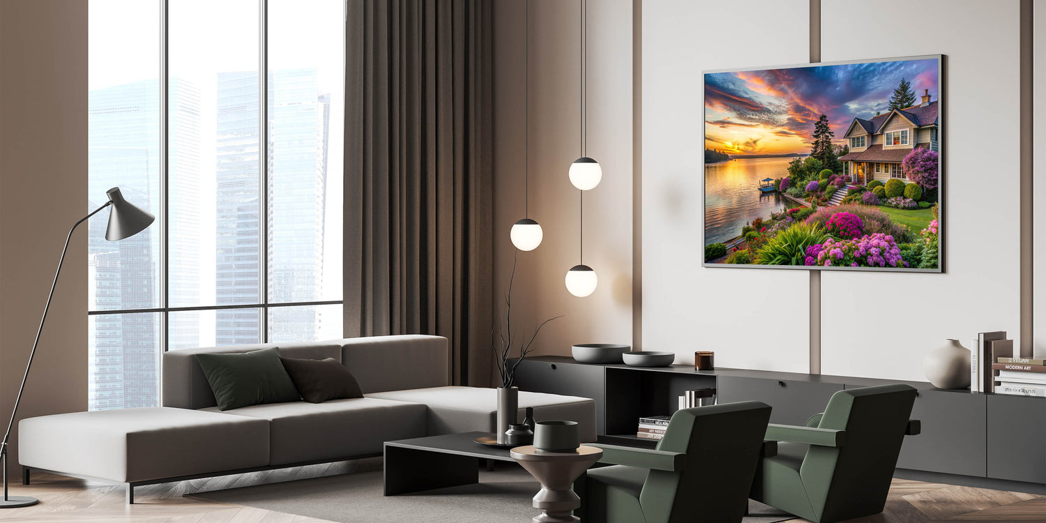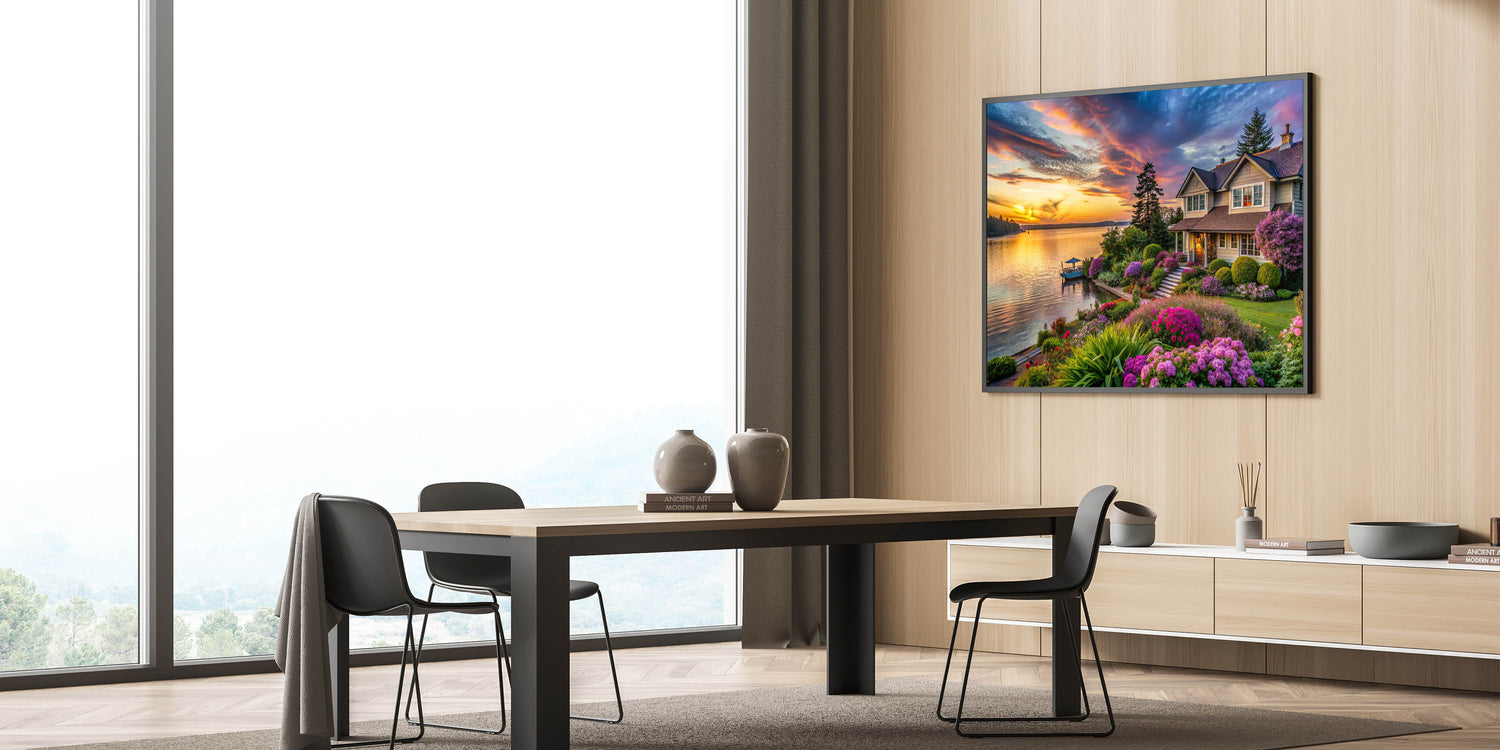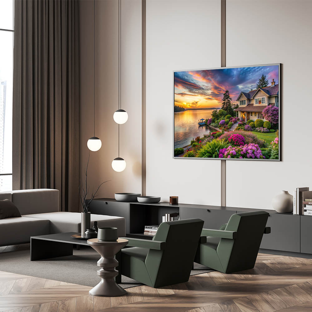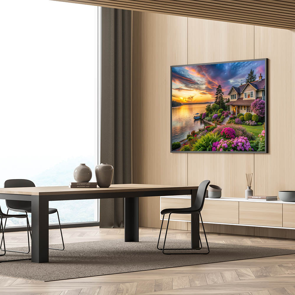 - Rich and Vibrant Colors: The warm tones of the sunset and the rich hues of the flowers and greenery are rendered with exceptional clarity, creating a calming and inviting atmosphere in any room.
