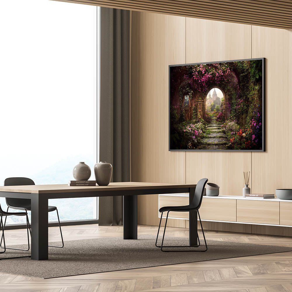 Infuse your home with the magical charm of our Mystical Garden Arch Wall Art. Whether displayed in a living room, bedroom, or study, this artwork will transport you to a world of beauty and wonder every time you see it.
