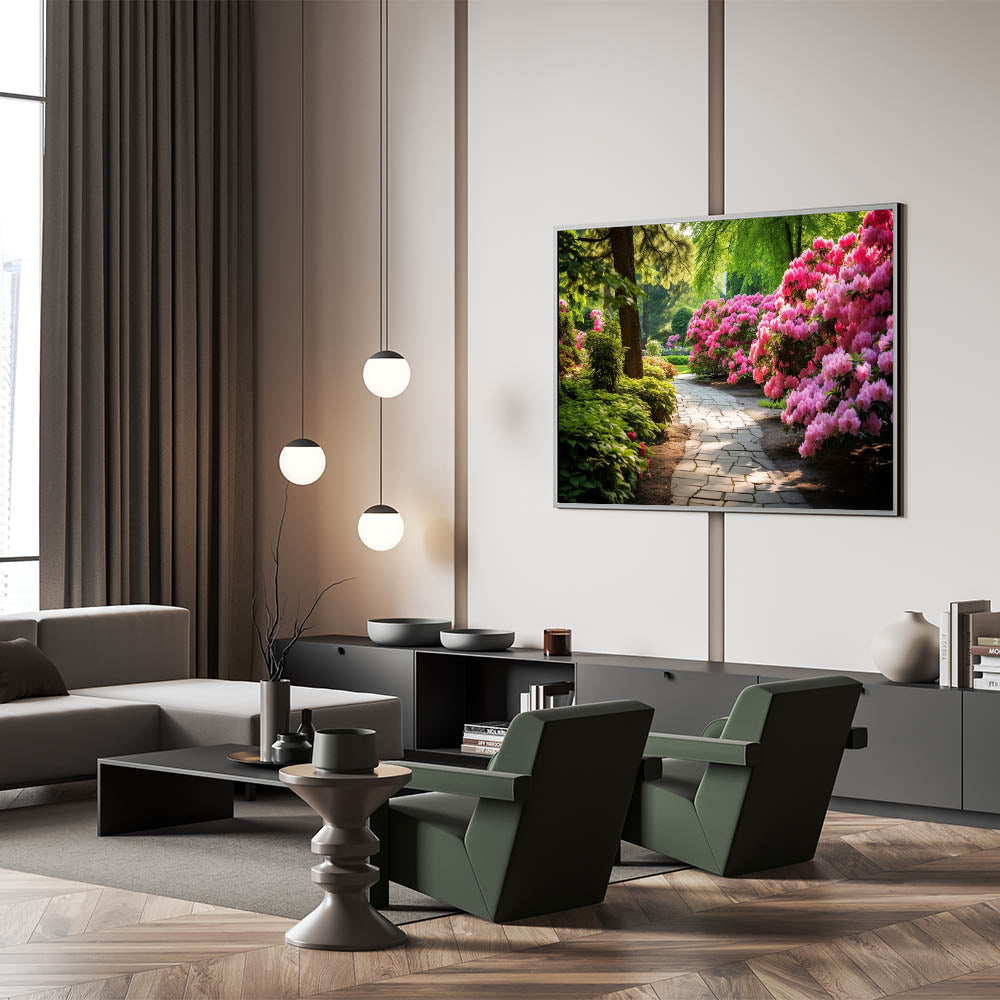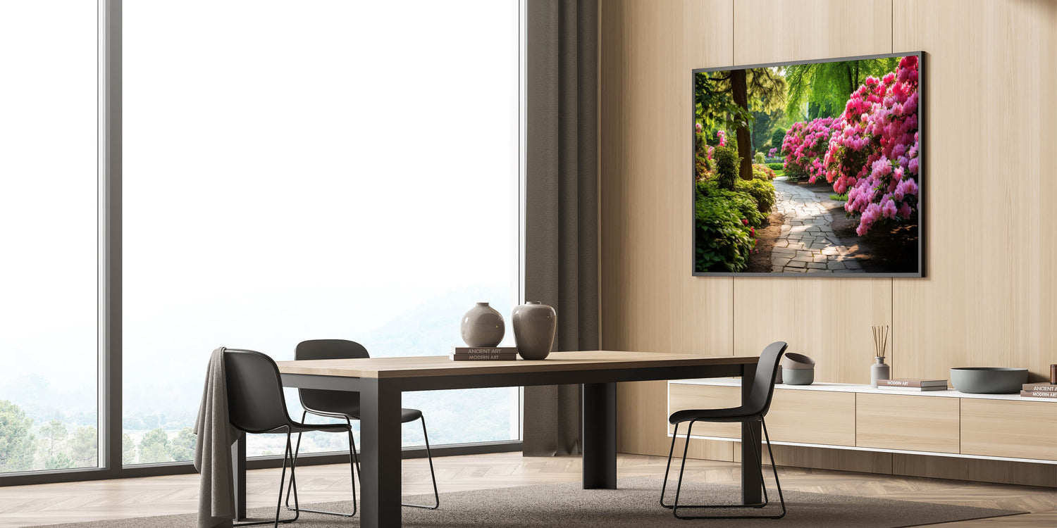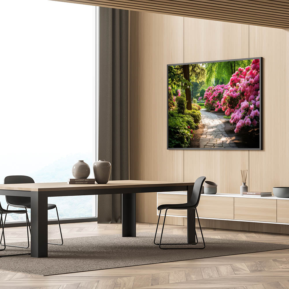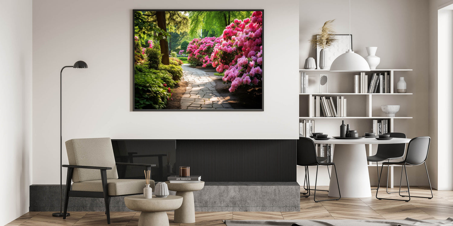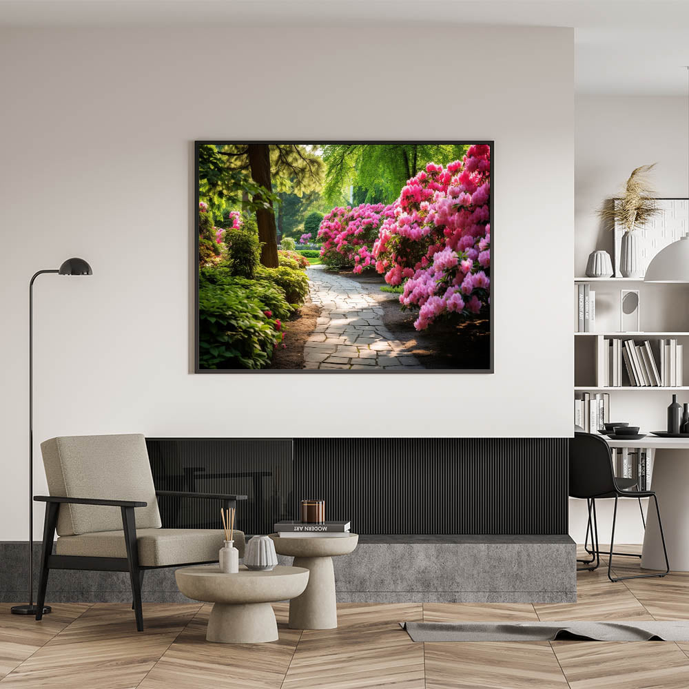 Invite the calm and peaceful atmosphere of a blooming garden into your home with our Serene Garden Path Wall Art. This artwork features a beautiful pathway surrounded by lush greenery and vibrant pink flowers, offering a tranquil escape into nature. Perfect for those looking to add a touch of serenity to their living space.