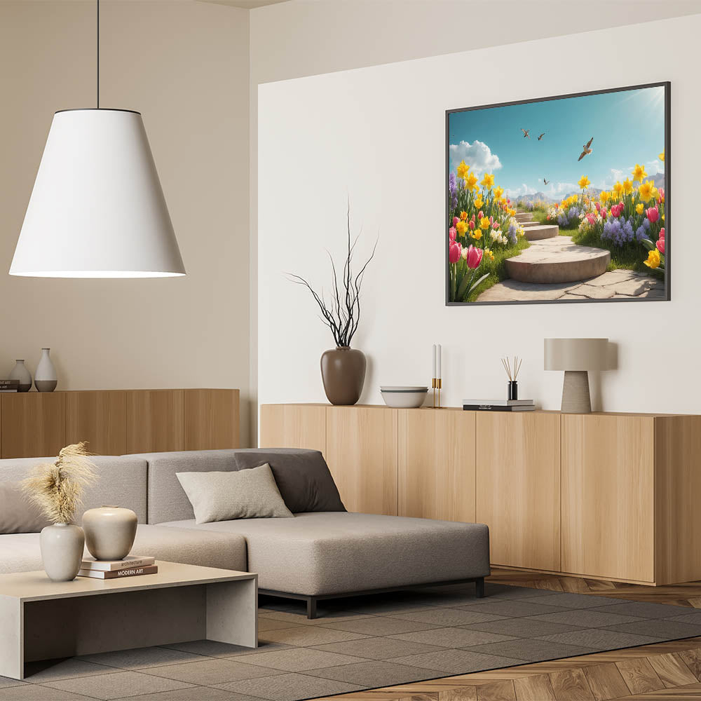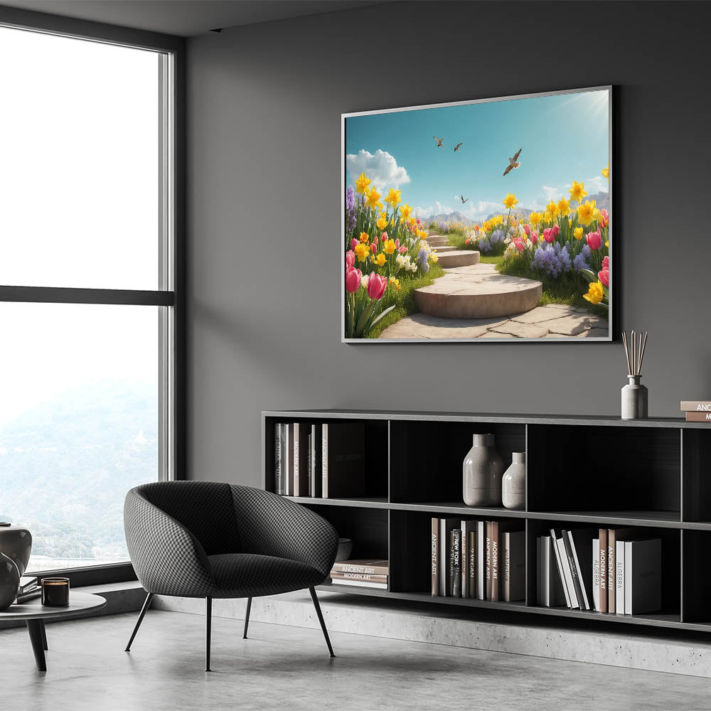 Add a touch of springtime joy to your decor with our Sunny Garden Path Wall Art. Whether displayed in your living room, bedroom, or office, this artwork will create a cheerful and inviting atmosphere, brightening any space.