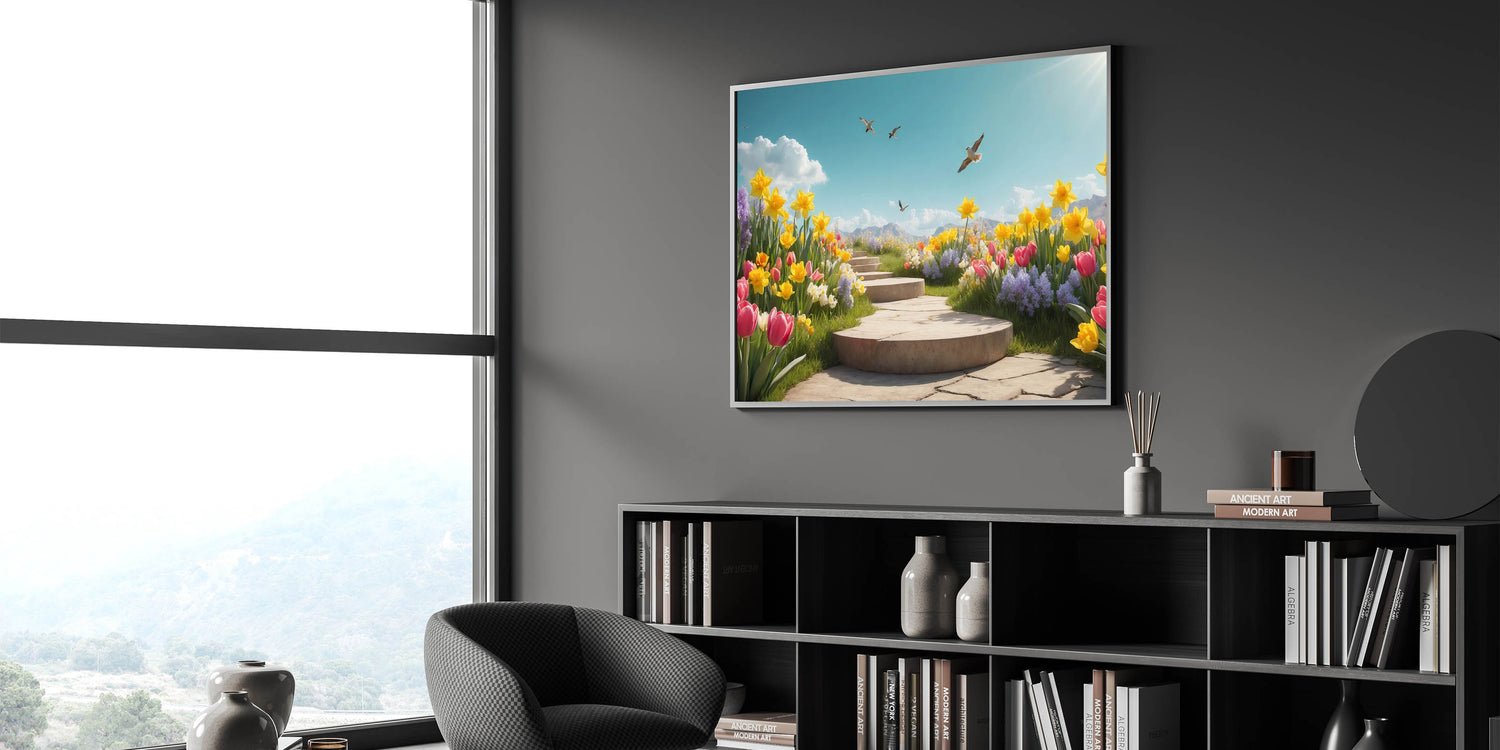 Bring the bright and joyful energy of spring into your home with our Sunny Garden Path Wall Art. This stunning artwork captures a sunlit garden path surrounded by blooming tulips and daffodils, creating a lively and uplifting scene. Perfect for those who wish to add a touch of color and warmth to their living space.