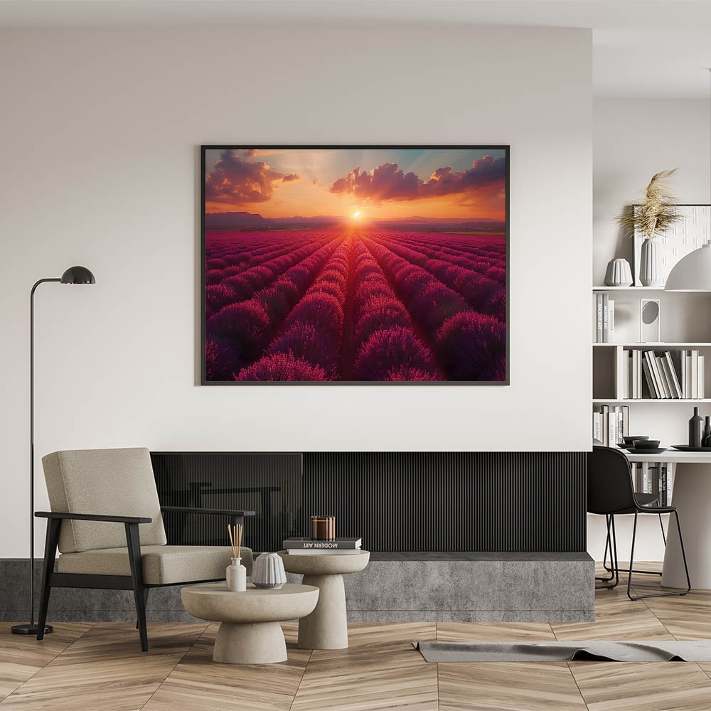 Immerse yourself in the serene beauty of our Sunset Lavender Field Wall Art. This stunning artwork captures the deep hues of a lavender field bathed in the warm glow of a setting sun, creating a breathtaking and tranquil scene. Perfect for those who wish to bring a touch of nature's beauty and calm into their living space.