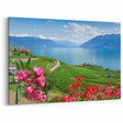 Immerse yourself in the vibrant beauty of Geneva’s countryside with this stunning wall art featuring a breathtaking view of a vineyard overlooking Lake Geneva. The lush green vines stretch across the rolling hills, leading the eye to the tranquil waters of the lake, while bright pink flowers in the foreground add a pop of color. This scenic Geneva artwork perfectly captures the harmony between nature and cultivation, making it an ideal piece for nature lovers and those who appreciate the Swiss landscape.