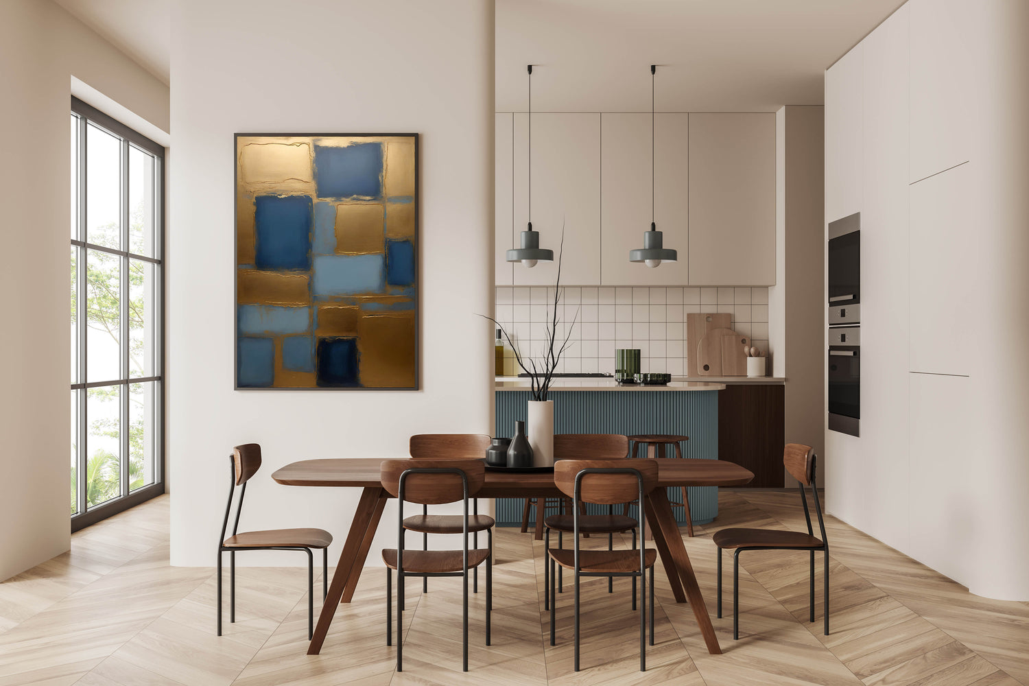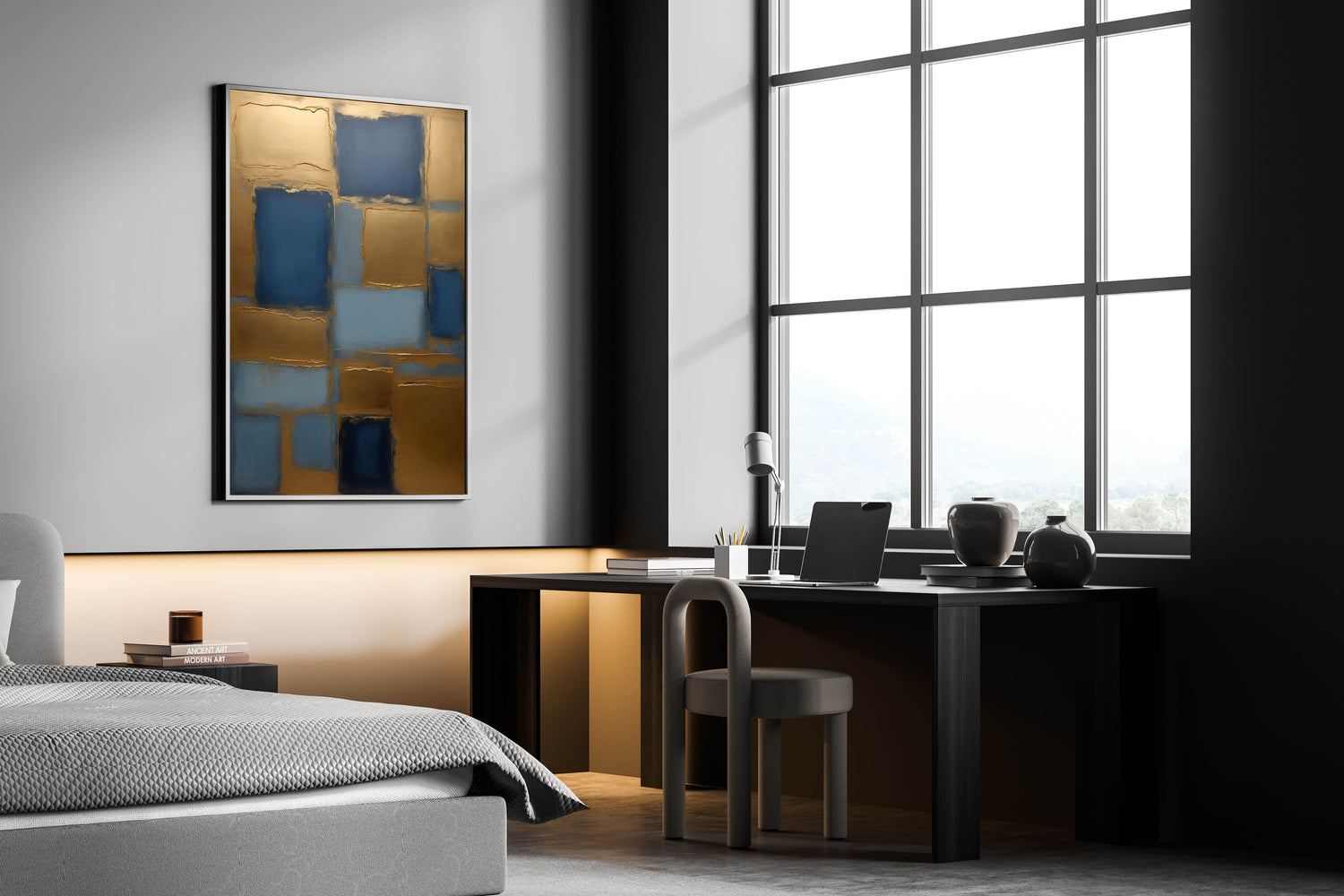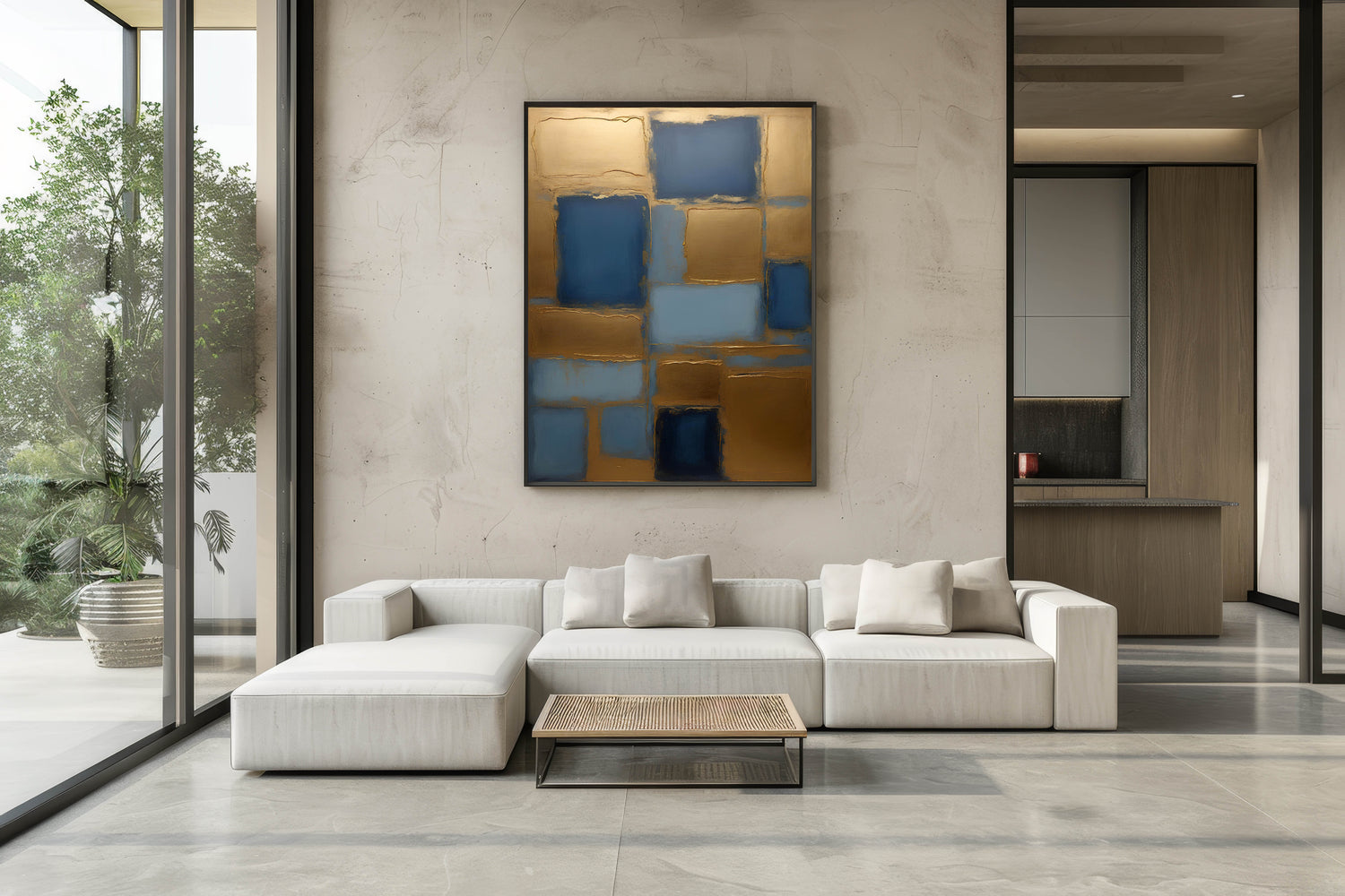 Elevate your decor with this abstract geometric wall art, featuring a captivating combination of deep blue and gold tones. This modern design uses structured strokes and rectangular forms to create a harmonious and luxurious visual, perfect for contemporary and minimalist spaces. The balance of bold color blocks with metallic accents brings a touch of elegance and sophistication to any room.