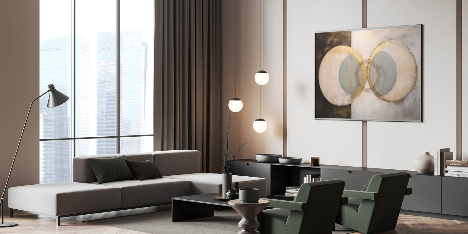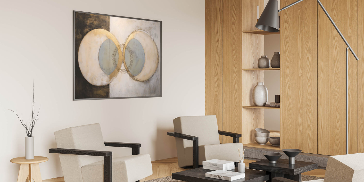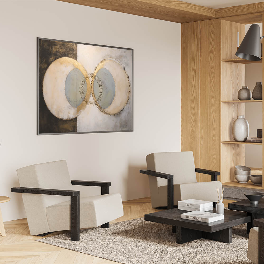 This geometric shapes artwork brings abstract art for living rooms to life with its sophisticated composition and balanced color palette. Whether you’re looking for a standout centerpiece or a complement to existing decor, this piece effortlessly elevates your interior with its modern and timeless appeal.